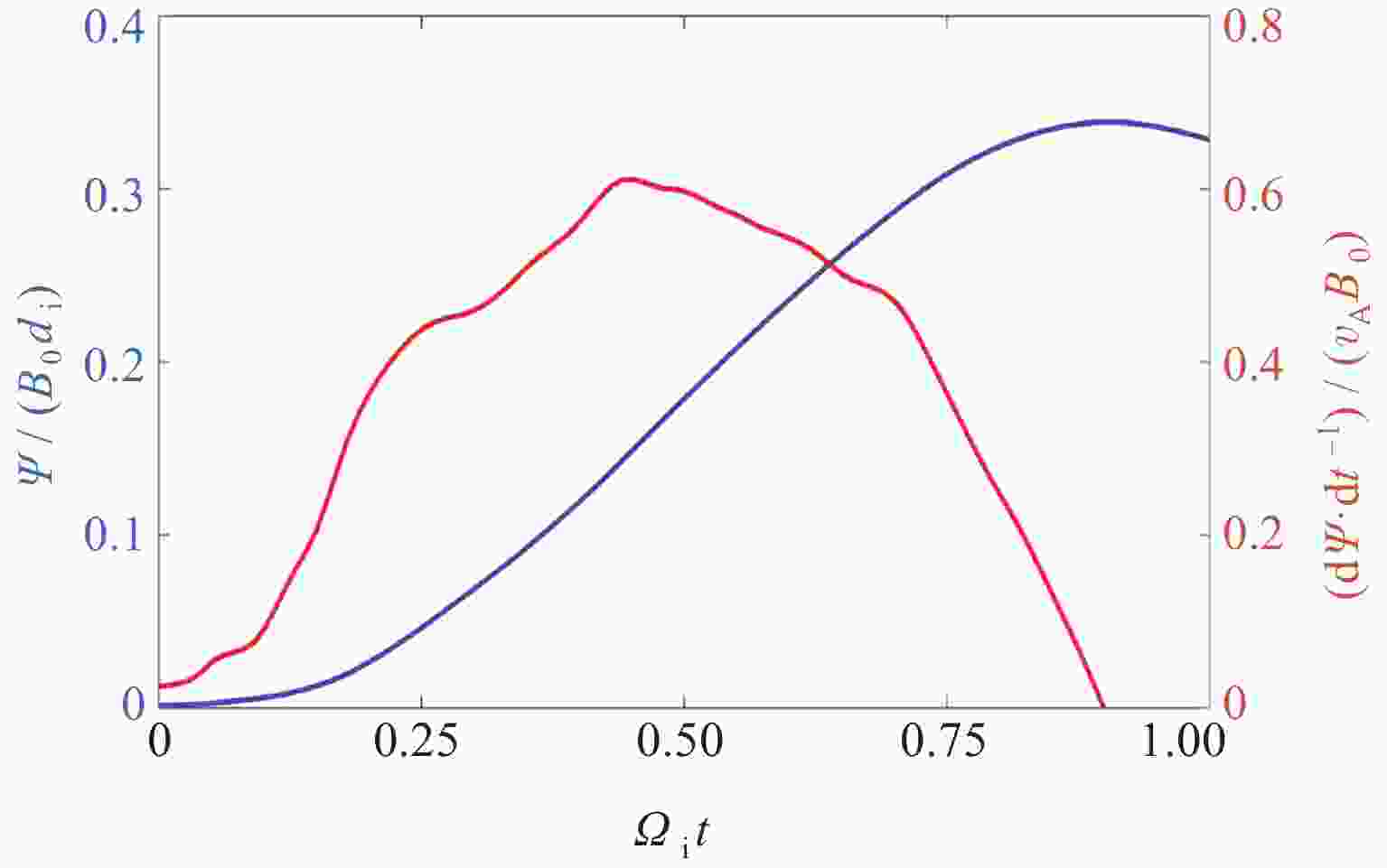 摘要: 采用2.5D全粒子模拟程序研究了强引导场情况下的电子重联, 分析了重联率最大时刻霍尔磁场、霍尔电场及电子流速的空间分布特征. 重联率最大时刻, 观察到分离线两侧的电子入流及出流, 并且有四极霍尔磁场生成. 与早期标准重联的研究结果不同, 霍尔磁场并未在引导场的作用下发生明显扭曲. 同时分离线区域发生电荷分离, 并生成近似对称分布的霍尔电场. 此外, 研究了电子流速空间分布的时间演化. 在重联前期, 电子主要沿磁力线流动, 即 $ \boldsymbol{v}_{{\mathrm{e}}}\approx v_{\mathrm{e}y}\boldsymbol{B}/B_y $; 在重联后期, 电子运动由电场漂移所主导, 即 $ \boldsymbol{v}_{{\mathrm{e}}}\approx\boldsymbol{E}\times\left(B_y\boldsymbol{e}_{{{y}}}\right)/B_y^2 $. 模拟结果表明, 电子重联中可以发生极强的电荷分离, 生成近似对称分布的霍尔电场. 在引导场下, 这种霍尔电场将导致电子的电场漂移, 并主导电子流速的面内空间分布, 进而生成近似对称分布的霍尔电流和四极霍尔磁场.Abstract: Standard collisionless magnetic reconnection couples with both electron and ion dynamics. Recently, a new type of magnetic reconnection, electron-only magnetic reconnection without ion outflow, has been observed. Using $ 2.5 $D particle-in-cell simulation, the electromagnetic field structure in the electron-only reconnection with a strong guide field was studied. At the moment of the maximum reconnection rate, the electron inflow and outflow are observed on either side of the separatrix. The spatial distribution of the electron bulk velocity is approximately symmetric, which generates the nearly symmetrically distributed Hall current, resulting in the quadrupole Hall magnetic field. The Hall magnetic field is not obviously distorted despite the presence of the strong guide field. Meanwhile, the charge separation is caused in the separatrix region, which generates the nearly symmetrically distributed Hall electric field. Besides, the evolution of the spatial distribution of the electron bulk velocity was studied. The equation of motion for the frozen electrons was analytically obtained: $ \boldsymbol{v}_{\rm{{e}}}=v_{\mathrm{e}y}\boldsymbol{B}/B_y+\boldsymbol{E}\times\left(B_y\boldsymbol{e}_{{{y}}}\right)/B_y^2 $. According to the equation of motion for the electrons, we divide the electron-only reconnection with a strong guide field into two stages. In the first stage, the $ \boldsymbol{E}\times \boldsymbol{B} $ drift is negligible because of the weaker Hall electric field, and then the electrons flow mainly along the magnetic field line following the equation $ \boldsymbol{v}_{\rm{{e}}}\approx v_{\mathrm{e}y}\boldsymbol{B}/B_y $. In the second stage, the Hall electric field is so strong that the motion of electrons is dominated by the $ \boldsymbol{E}\times \boldsymbol{B} $ drift following the equation $ \boldsymbol{v}_{\rm{{e}}}\approx\boldsymbol{E}\times\left(B_y\boldsymbol{e}_{{{{y}}}}\right)/B_y^2 $. The simulation shows that extremely strong charge separation can be caused in electron-only reconnection, which generates the nearly symmetrically distributed Hall electric field. With a guide field, this Hall electric field leads to the $ \boldsymbol{E}\times \boldsymbol{B} $ drift, which dominates the spatial distribution of the electron bulk velocity. Therefore nearly symmetrically distributed Hall current is formed, which generates the nearly symmetrically distributed quadrupole Hall magnetic field.