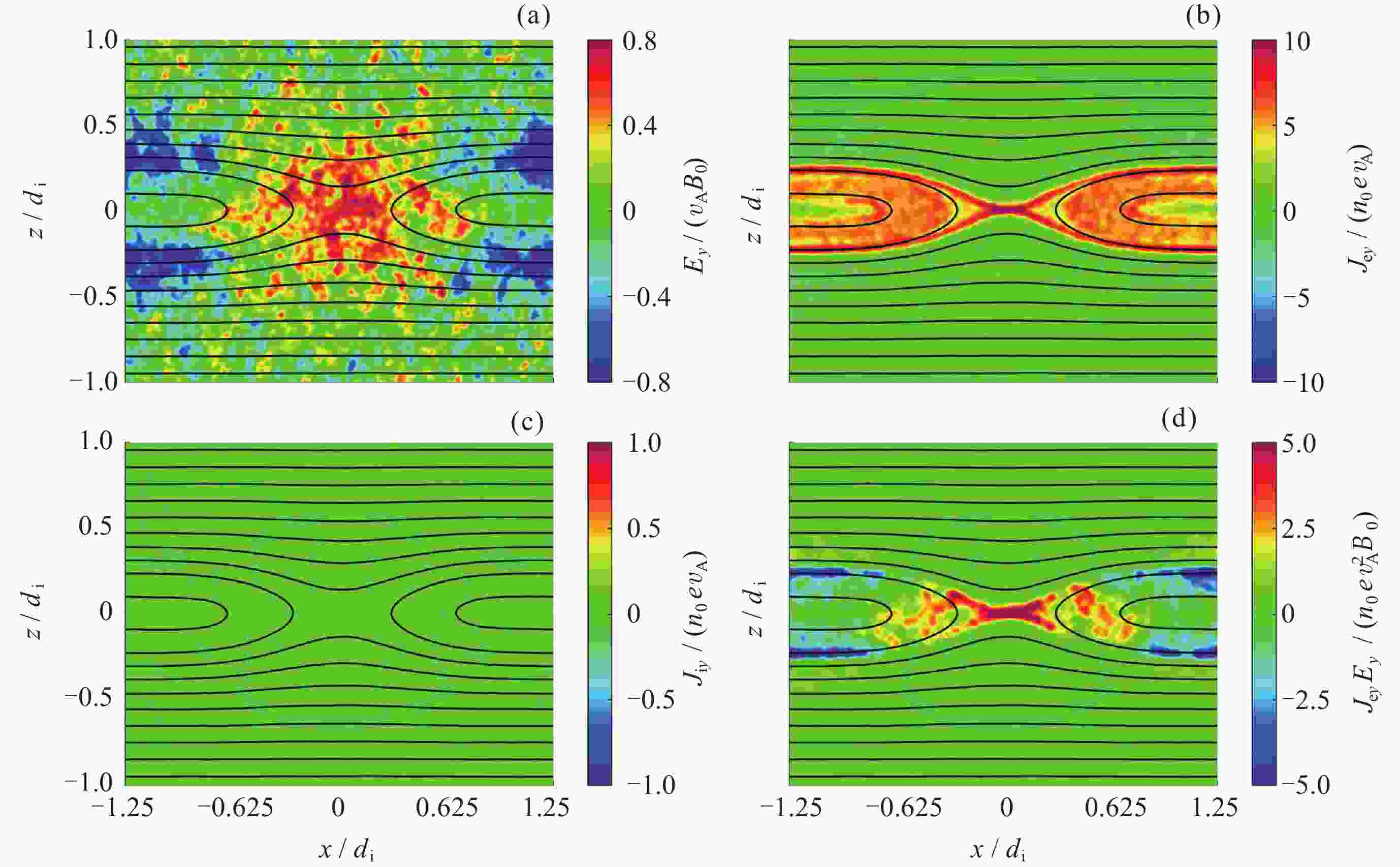 Figure 2. Color contours of the reconnection electric field $ {E}_{y}$, the out-of-plane current of electrons $ {J}_{\mathrm{e}y} $, the out-of-plane current of ions $ {J}_{\mathrm{i}y} $, and $ {J}_{\mathrm{e}y}{E}_{y} $ at $ {\varOmega }_{\mathrm{i}}t=0.45 $ (The black lines represent the magnetic field lines)