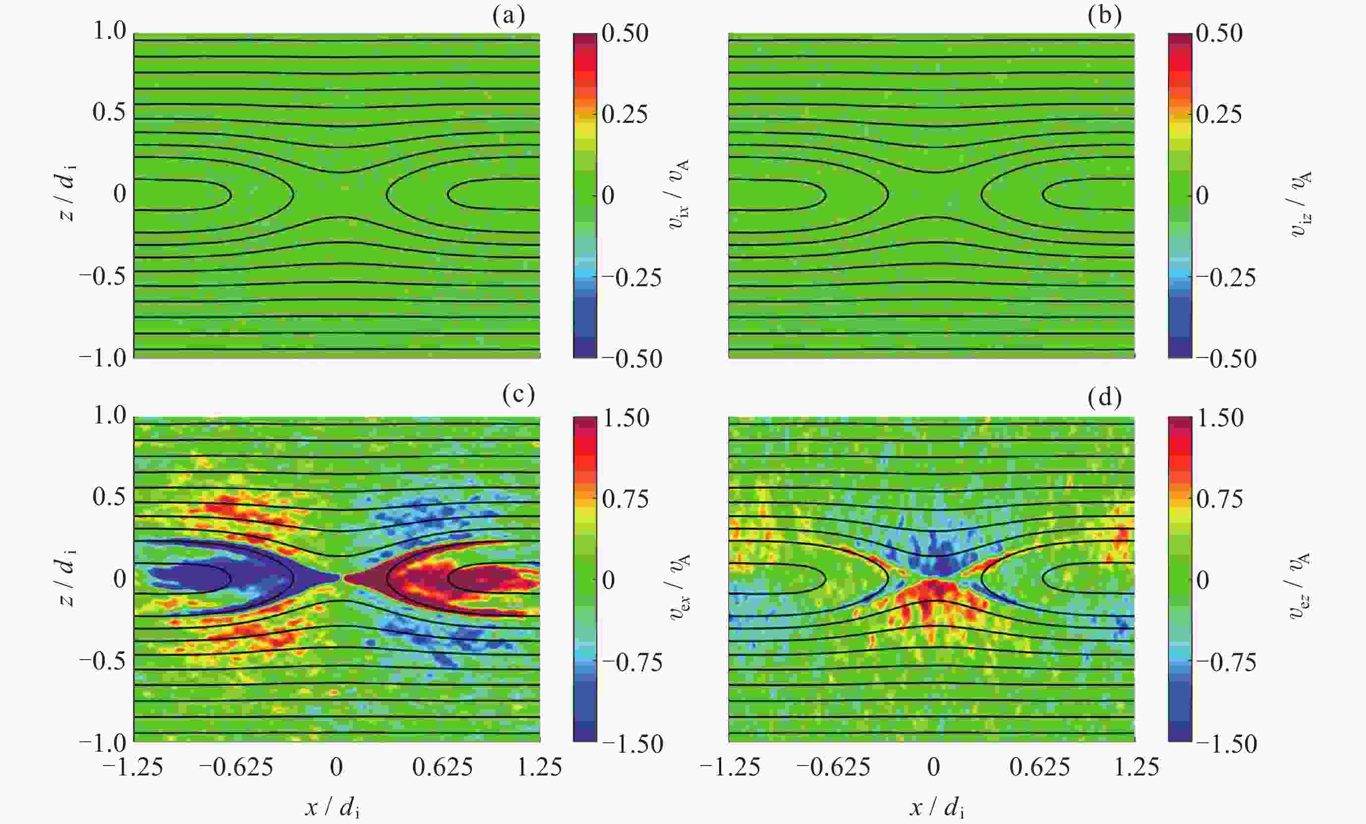 图 3 $ {\varOmega }_{\mathrm{i}}t=0.45 $时刻$ x $方向离子流速$ {v}_{\mathrm{i}x} $, $ z $方向离子流速$ {v}_{\mathrm{i}z} $, $ x $方向电子流速$ {v}_{\mathrm{e}x} $和$ z $方向电子流速$ {v}_{\mathrm{e}z} $的面内空间分布(黑色实线表示磁力线)