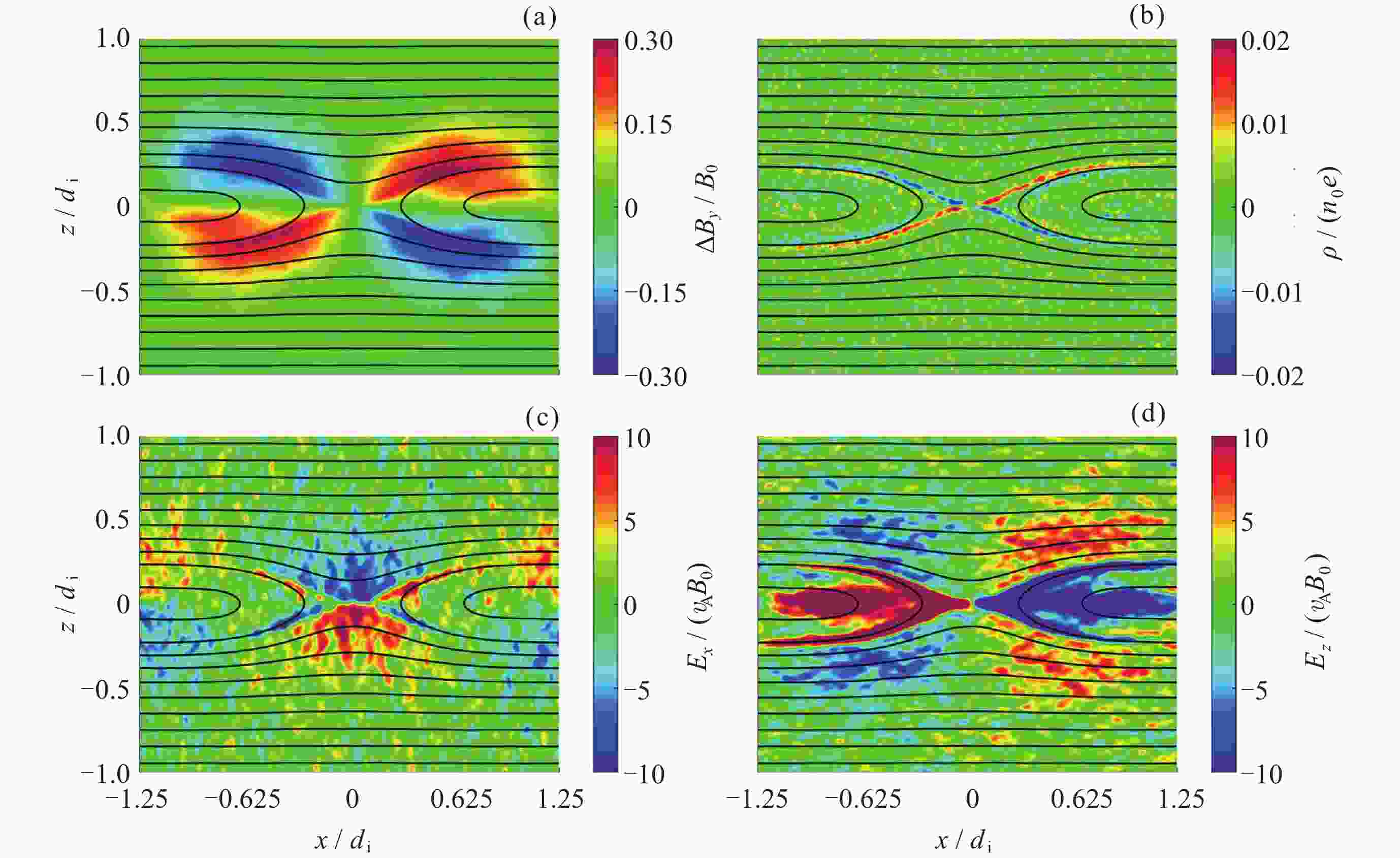 Figure 4. Color contours of the Hall magnetic field $ {\Delta }{B}_{y}={B}_{y}-{B}_{\mathrm{g}} $, the charge density $ \rho $, the electric field $ {E}_{x} $, and the electric field $ {E}_{z} $ at $ {\varOmega }_{\mathrm{i}}t=0.45 $ (The black lines represent the magnetic field lines)