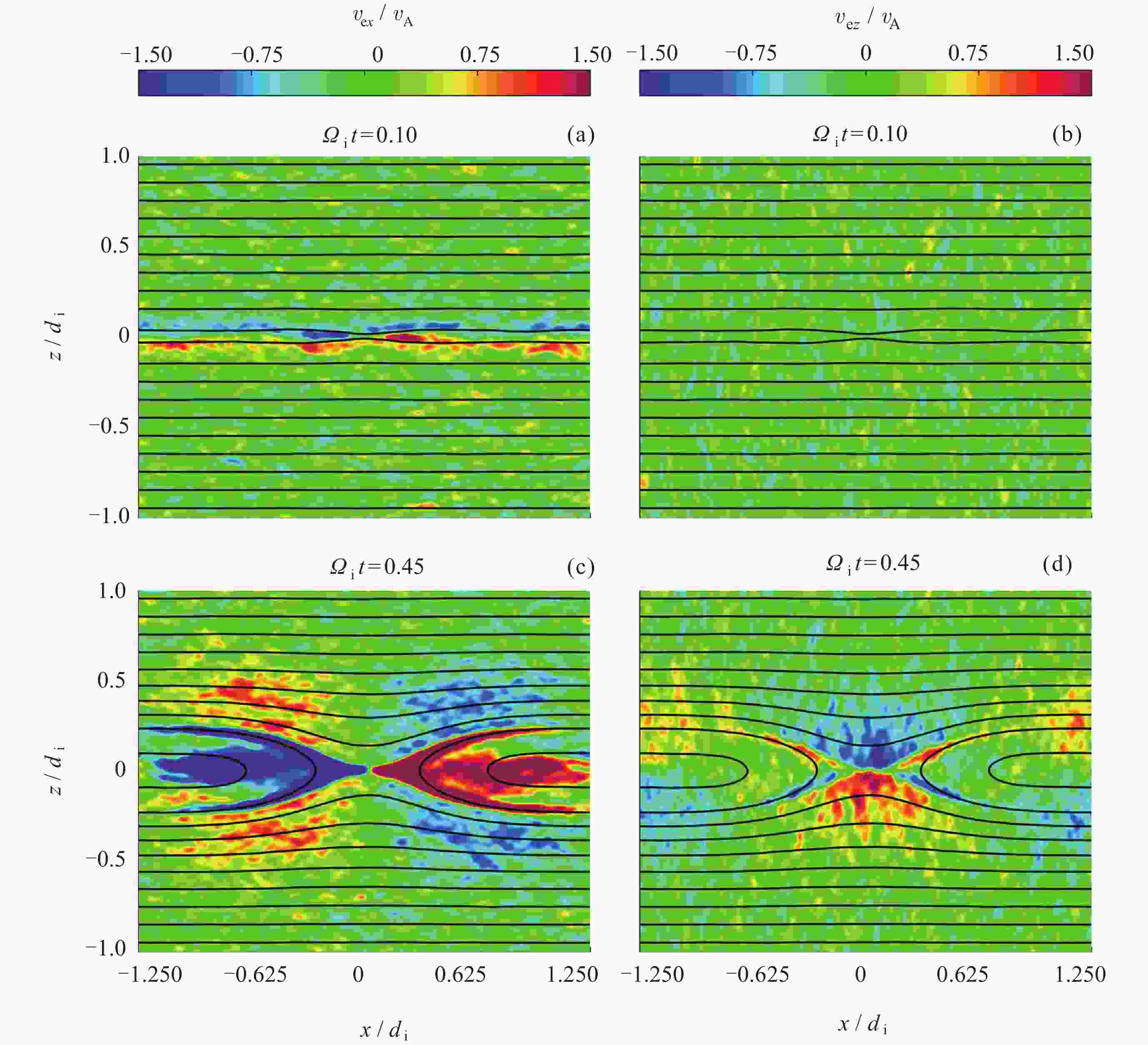 Figure 5. Color contours of the electron bulk velocity in the $ x $ direction $ {v}_{\mathrm{e}x} $ and the electron bulk velocity in the $ z $ direction $ {v}_{\mathrm{e}z} $ at $ {\varOmega }_{\mathrm{i}}t=0.10 $ and $ {\varOmega }_{\mathrm{i}}t=0.45 $ (The black lines represent the magnetic field lines)