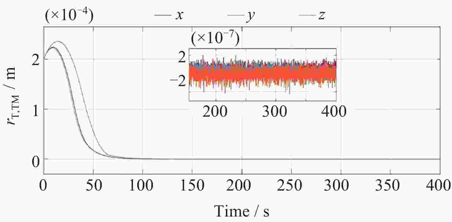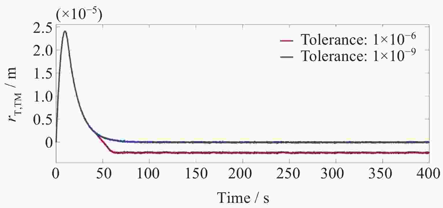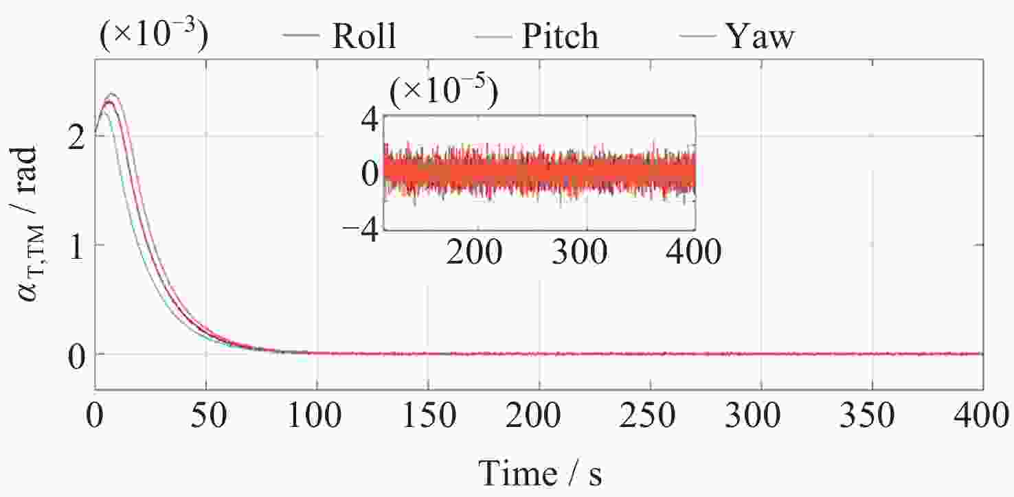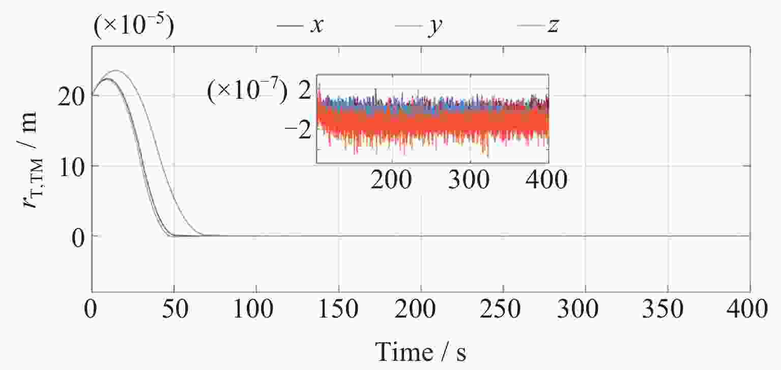 自由度 执行器噪声幅值 量测噪声幅值 x $ < 4.35\times {10}^{-14}\; \mathrm{N} $ $ < 2.24\times {10}^{-7}\; \mathrm{m} $ y $ < 4.41\times {10}^{-13}\; \mathrm{N} $ $ < 2.38\times {10}^{-7}\; \mathrm{m} $ z $ < 4.68\times {10}^{-13}\; \mathrm{N} $ $ < 3.82\times {10}^{-7}\; \mathrm{m} $ $ \varphi $ $ < 4.11\times {10}^{-15}\; \mathrm{N}·\mathrm{m} $ $ < 2.45\times {10}^{-5}\; \mathrm{r}\mathrm{a}\mathrm{d} $ $ \theta $ $ < 4.43\times {10}^{-15}\; \mathrm{N}·\mathrm{m} $ $ < 1.59\times {10}^{-5}\; \mathrm{r}\mathrm{a}\mathrm{d} $ $ \psi $ $ < 4.38\times {10}^{-15}\; \mathrm{N}·\mathrm{m} $ $ < 2.50\times {10}^{-5}\; \mathrm{r}\mathrm{a}\mathrm{d} $ 表 4 执行器饱和