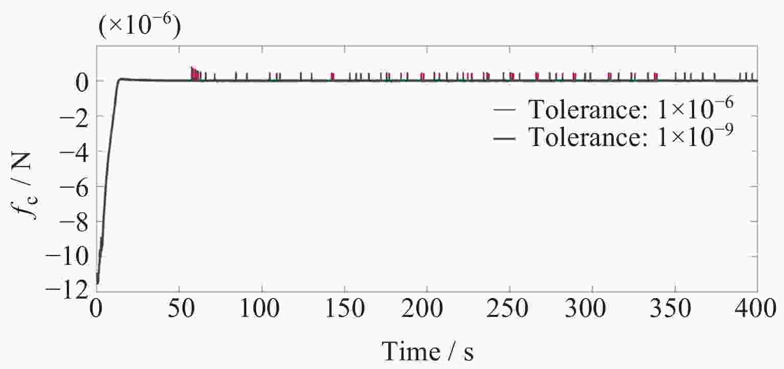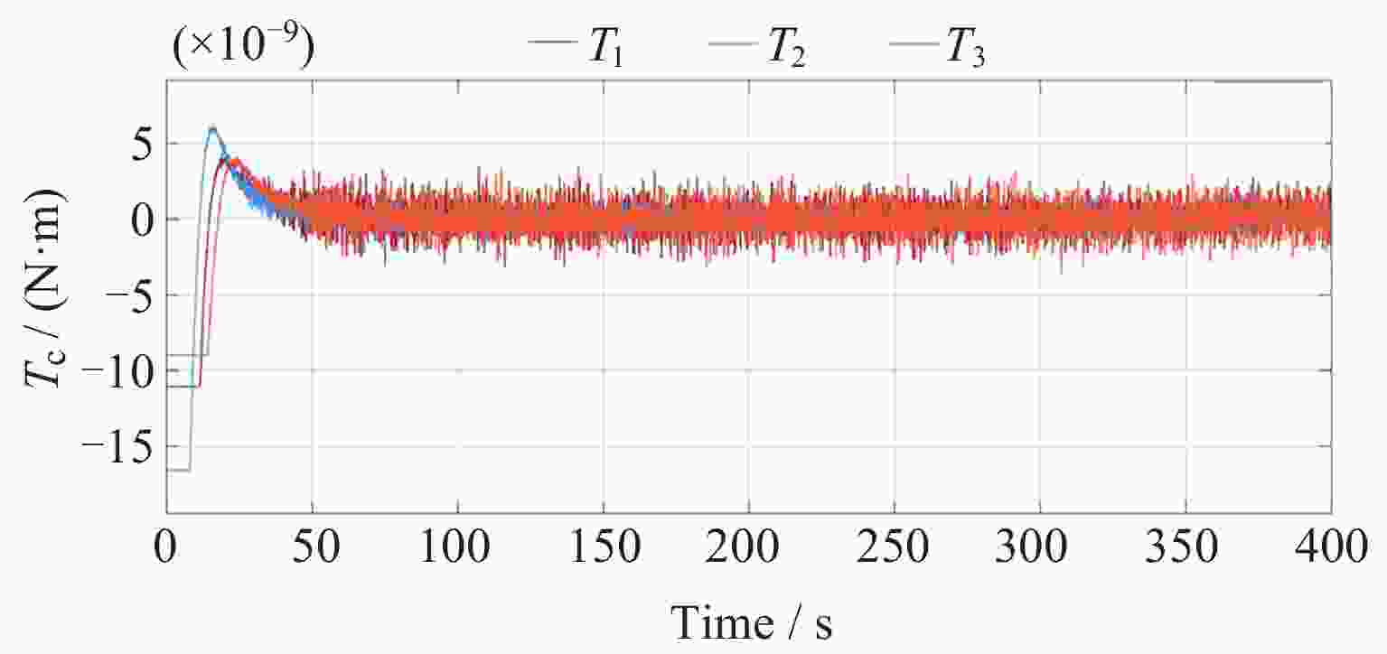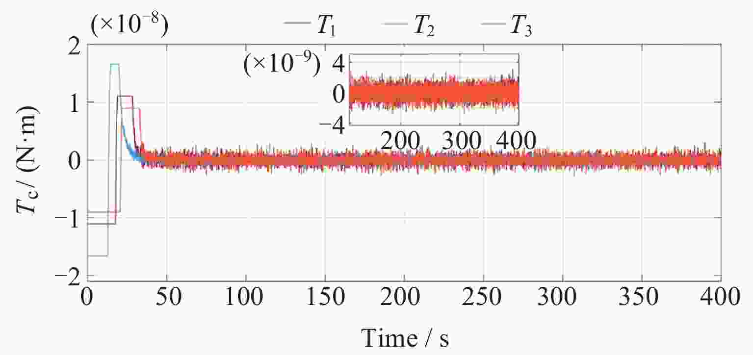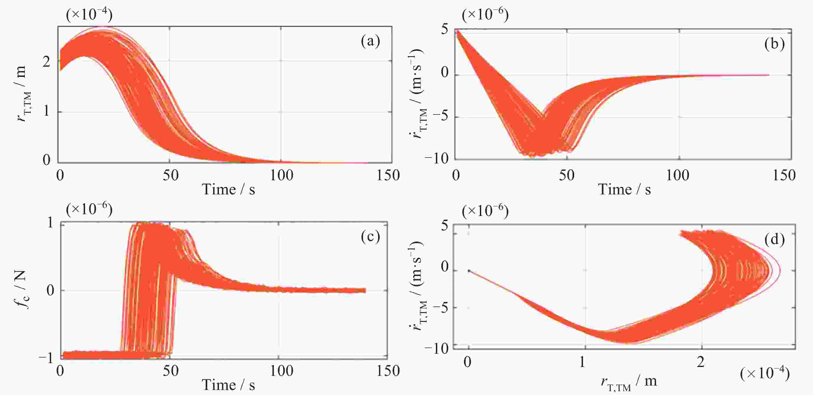自由度 执行器噪声幅值 量测噪声幅值 x $ < 4.35\times {10}^{-14}\; \mathrm{N} $ $ < 2.24\times {10}^{-7}\; \mathrm{m} $ y $ < 4.41\times {10}^{-13}\; \mathrm{N} $ $ < 2.38\times {10}^{-7}\; \mathrm{m} $ z $ < 4.68\times {10}^{-13}\; \mathrm{N} $ $ < 3.82\times {10}^{-7}\; \mathrm{m} $ $ \varphi $ $ < 4.11\times {10}^{-15}\; \mathrm{N}·\mathrm{m} $ $ < 2.45\times {10}^{-5}\; \mathrm{r}\mathrm{a}\mathrm{d} $ $ \theta $ $ < 4.43\times {10}^{-15}\; \mathrm{N}·\mathrm{m} $ $ < 1.59\times {10}^{-5}\; \mathrm{r}\mathrm{a}\mathrm{d} $ $ \psi $ $ < 4.38\times {10}^{-15}\; \mathrm{N}·\mathrm{m} $ $ < 2.50\times {10}^{-5}\; \mathrm{r}\mathrm{a}\mathrm{d} $ 表 4 执行器饱和