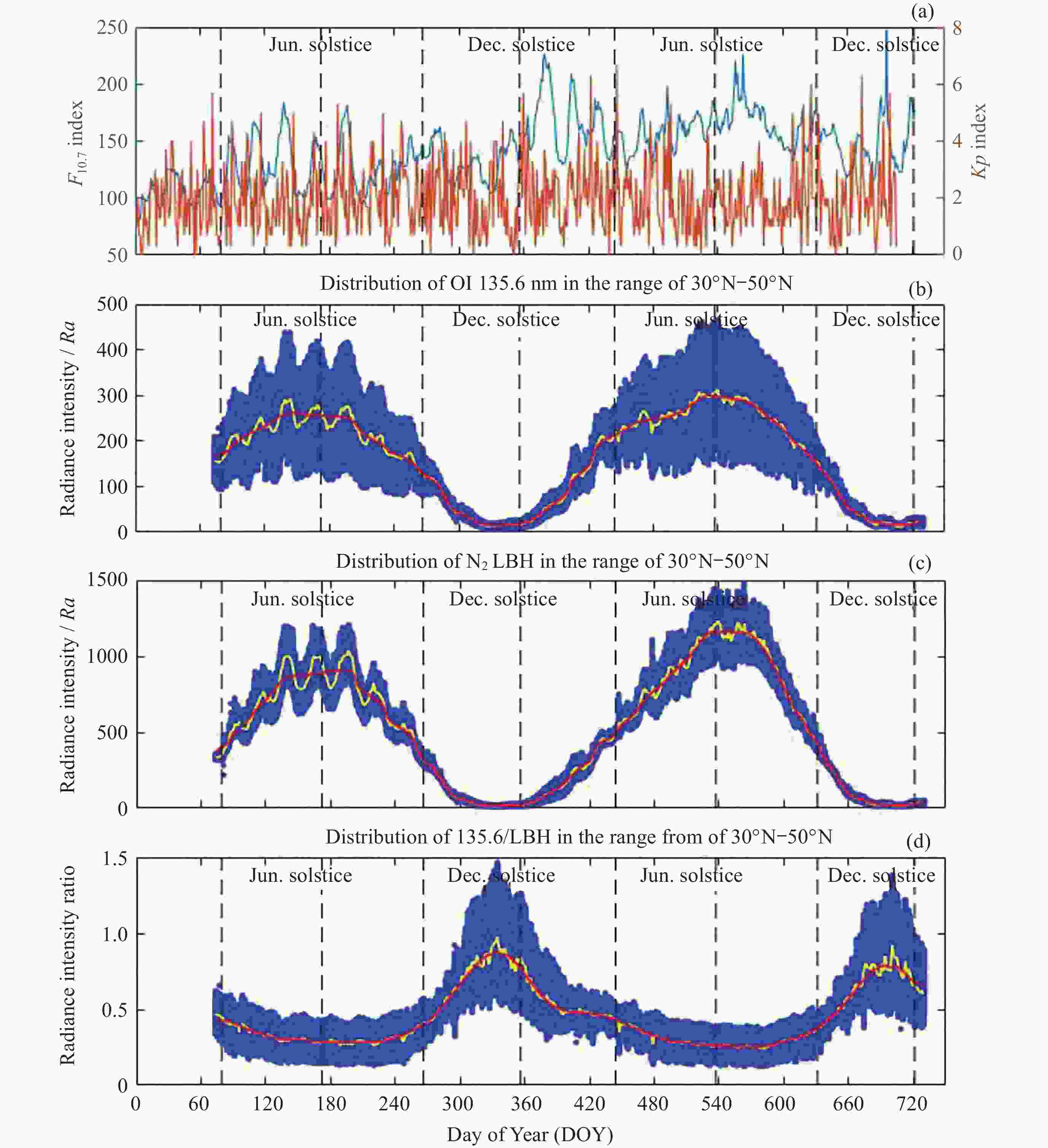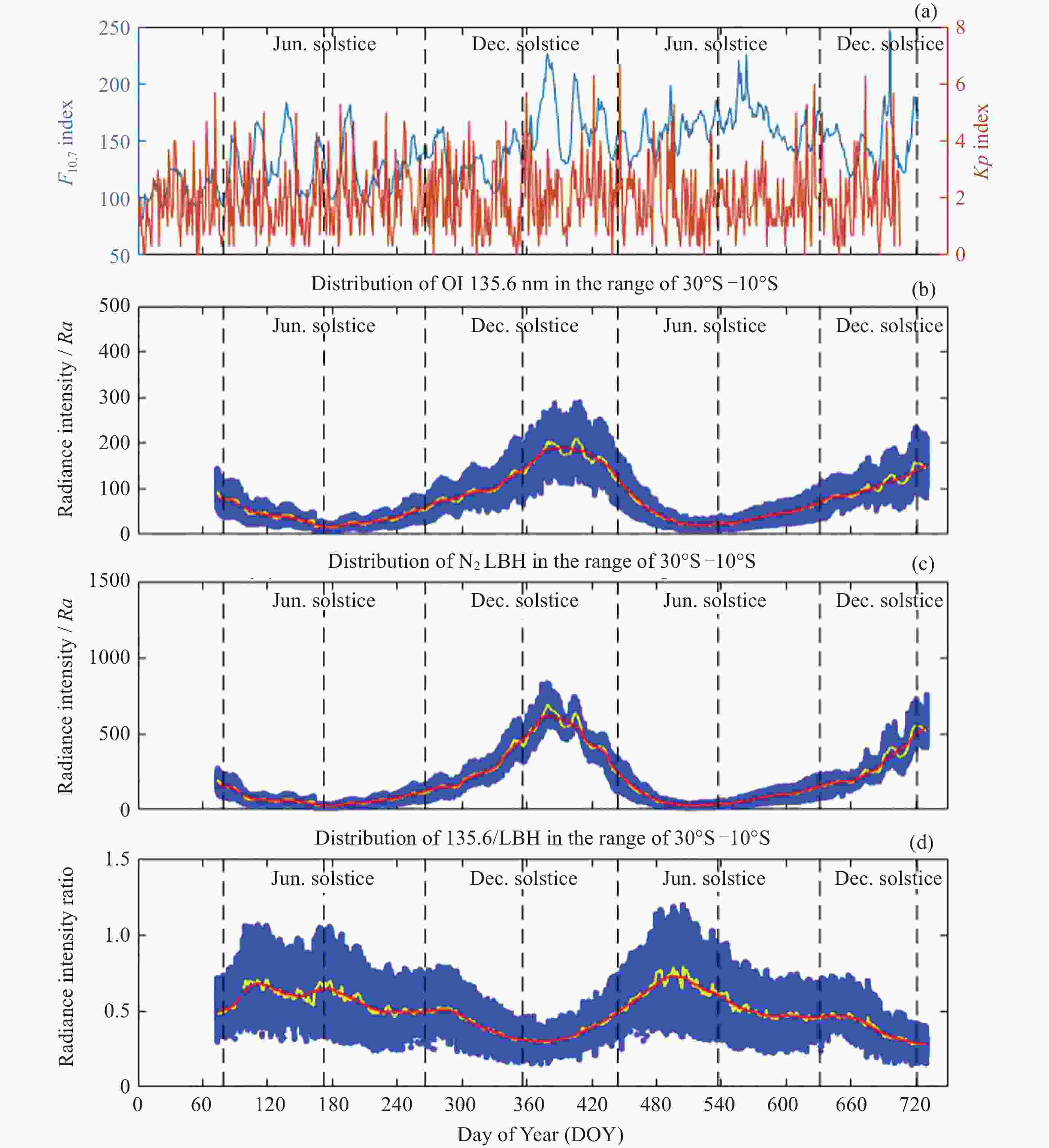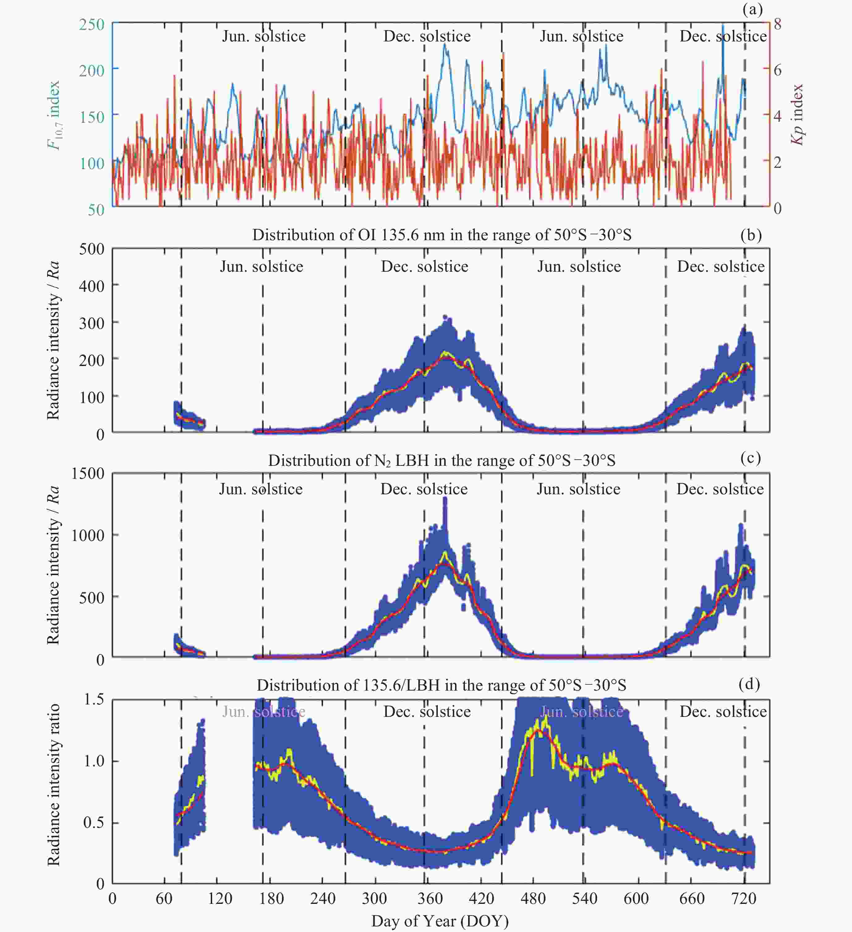 摘要: 中国的多颗风云三号卫星配备了电离层光度计, 能探测到OI 135.6 nm和N2 LBH带的气辉辐射积分通量, 并计算出135.6/LBH比值. 风云三号E星作为第二代近极地太阳同步轨道卫星, 特别适合晨昏轨道的气辉观测. 该比值与热层大气成分中[O]/[N2]比值成正比, 反映了影响电离层电子密度变化的重要参数. 利用风云三号E星近两年的数据, 分析了中低纬地区135.6/LBH比值及相应参量的季节转换规律. 结果显示, OI 135.6 nm和N2 LBH带辐射强度的季节变化以冬季和夏季为主, 在春秋两季快速转变, 且这种变化随纬度而异. 135.6/LBH比值在春秋季也出现快速转换, 但其峰值和谷值时期与前述两种辐射强度不同. 中纬度地区表现为冬季高、夏季低的季节特征, 而赤道附近则相反, 呈现半年变化周期. 研究还发现, 135.6/LBH比值的季节转换存在不对称性, 受纬度和半球的影响显著. 这些结果证明, 风云卫星电离层光度计对热层大气成分比的季节、纬度和半球变化可以进行有效探测, 为电离层热层的研究、建模以及空间天气预报提供了重要依据.Abstract: Two Fengyun-3 satellites are equipped with Ionospheric Photometers capable of detecting the integrated radiant flux of the OI 135.6 nm and N2 LBH band airglow emissions, from which the ratio (referred to as the 135.6/LBH ratio) is derived. Among them, the Fengyun-3E satellite, the second generation of near-polar sun-synchronous orbit satellites, provides airglow observations during dawn-dusk orbits. The 135.6/LBH ratio is typically proportional to the thermospheric atmospheric composition ratio of [O]/[N2], reflecting variations in this ratio, which is a significant parameter influencing changes in ionospheric electron density. This paper collects data from Fengyun-3E satellite in the past two years to analyze the seasonal conversion patterns of 135.6/LBH ratio and corresponding parameters in mid to low latitudes. The results showed that the seasonal variation of OI 135.6 nm and N2 LBH band radiation intensity was mainly in winter and summer, with rapid changes in spring and autumn, and this change varies with latitude. The 135.6/LBH ratio also shows a rapid transition in spring and autumn, but its peak and valley periods are different from the aforementioned two radiation intensities. The mid latitude region shows a seasonal characteristic of high in winter and low in summer, while the opposite is true near the equator, showing a semiannual variation cycle. The study also found that there is asymmetry in the seasonal transition of the 135.6/LBH ratio, which is significantly influenced by latitude and hemisphere. These results demonstrate that the Fengyun satellite ionospheric photometer has good performance in detecting seasonal, latitudinal, and hemispheric variations in the composition ratio of the thermosphere atmosphere, providing important basis for research, modeling, and space weather forecasting of the ionospheric thermosphere.
