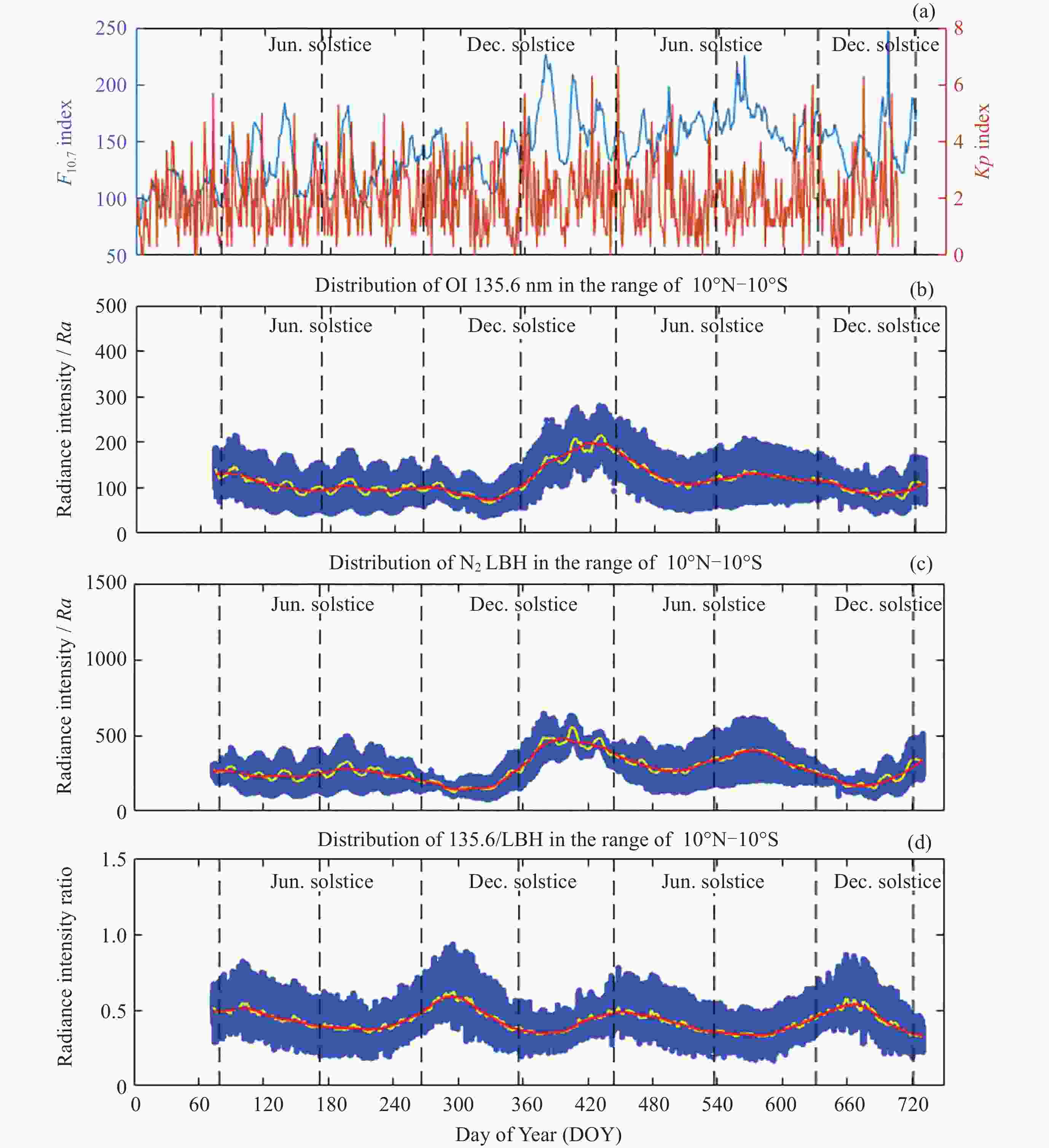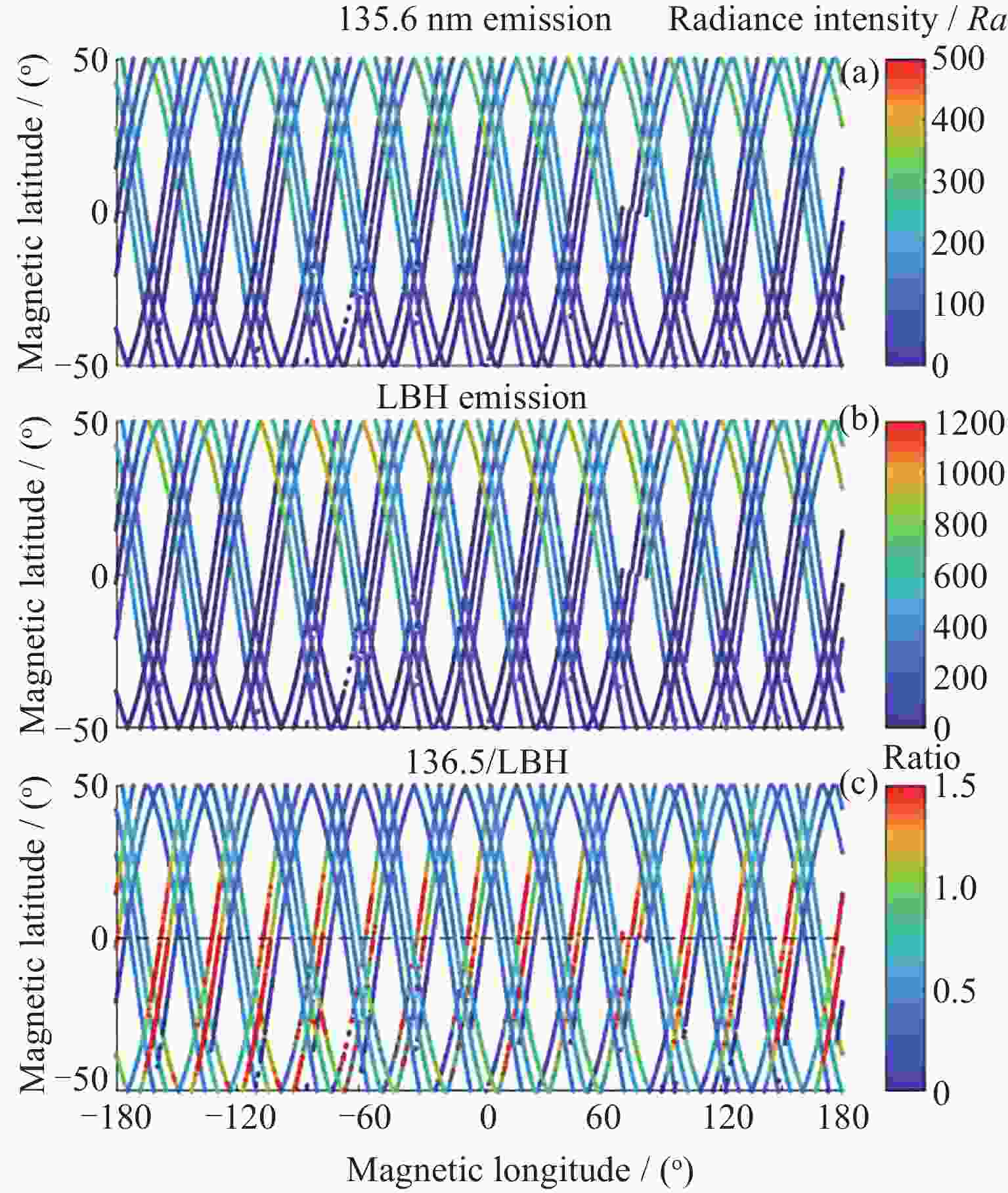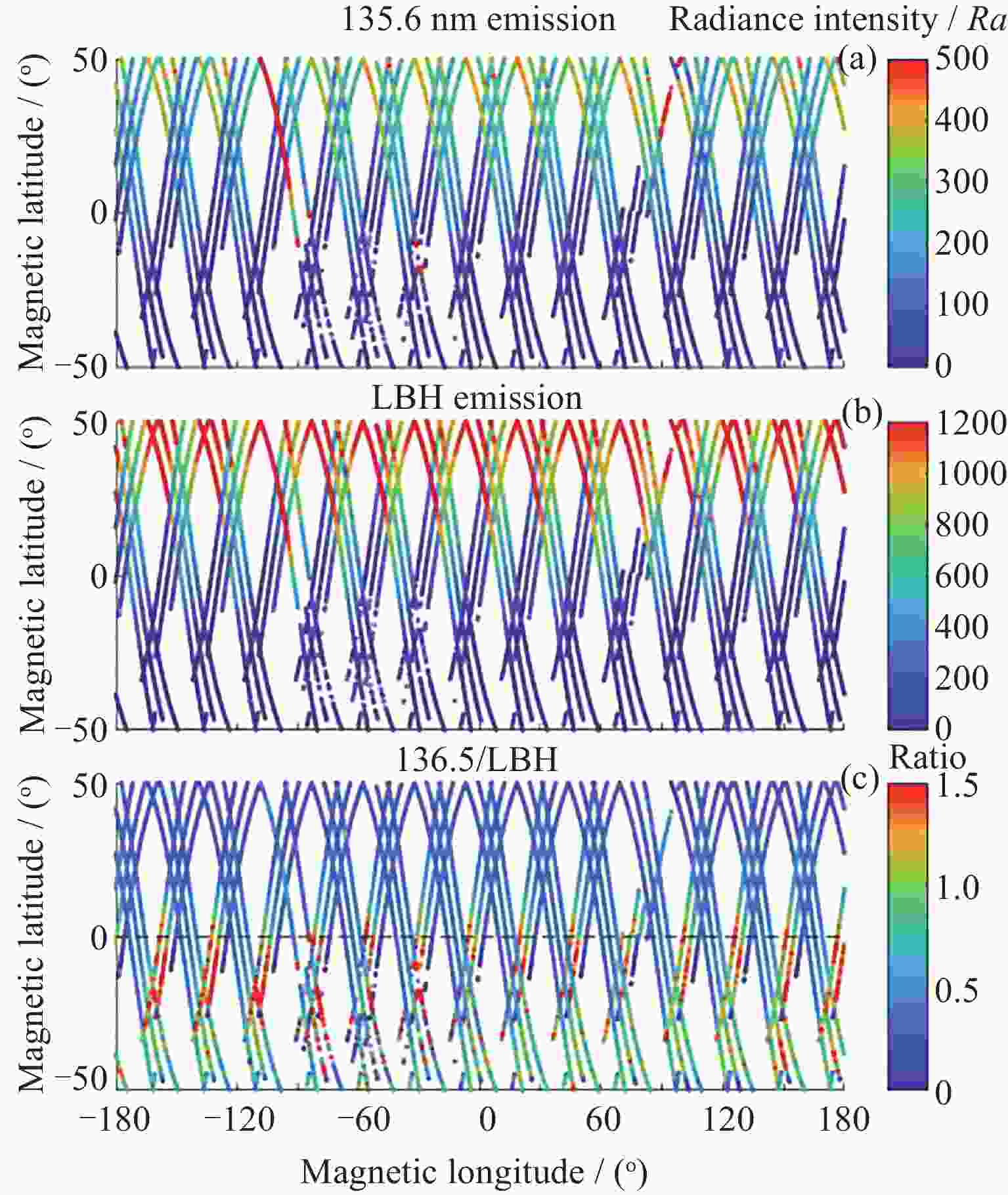 摘要: 中国的多颗风云三号卫星配备了电离层光度计, 能探测到OI 135.6 nm和N2 LBH带的气辉辐射积分通量, 并计算出135.6/LBH比值. 风云三号E星作为第二代近极地太阳同步轨道卫星, 特别适合晨昏轨道的气辉观测. 该比值与热层大气成分中[O]/[N2]比值成正比, 反映了影响电离层电子密度变化的重要参数. 利用风云三号E星近两年的数据, 分析了中低纬地区135.6/LBH比值及相应参量的季节转换规律. 结果显示, OI 135.6 nm和N2 LBH带辐射强度的季节变化以冬季和夏季为主, 在春秋两季快速转变, 且这种变化随纬度而异. 135.6/LBH比值在春秋季也出现快速转换, 但其峰值和谷值时期与前述两种辐射强度不同. 中纬度地区表现为冬季高、夏季低的季节特征, 而赤道附近则相反, 呈现半年变化周期. 研究还发现, 135.6/LBH比值的季节转换存在不对称性, 受纬度和半球的影响显著. 这些结果证明, 风云卫星电离层光度计对热层大气成分比的季节、纬度和半球变化可以进行有效探测, 为电离层热层的研究、建模以及空间天气预报提供了重要依据.Abstract: Two Fengyun-3 satellites are equipped with Ionospheric Photometers capable of detecting the integrated radiant flux of the OI 135.6 nm and N2 LBH band airglow emissions, from which the ratio (referred to as the 135.6/LBH ratio) is derived. Among them, the Fengyun-3E satellite, the second generation of near-polar sun-synchronous orbit satellites, provides airglow observations during dawn-dusk orbits. The 135.6/LBH ratio is typically proportional to the thermospheric atmospheric composition ratio of [O]/[N2], reflecting variations in this ratio, which is a significant parameter influencing changes in ionospheric electron density. This paper collects data from Fengyun-3E satellite in the past two years to analyze the seasonal conversion patterns of 135.6/LBH ratio and corresponding parameters in mid to low latitudes. The results showed that the seasonal variation of OI 135.6 nm and N2 LBH band radiation intensity was mainly in winter and summer, with rapid changes in spring and autumn, and this change varies with latitude. The 135.6/LBH ratio also shows a rapid transition in spring and autumn, but its peak and valley periods are different from the aforementioned two radiation intensities. The mid latitude region shows a seasonal characteristic of high in winter and low in summer, while the opposite is true near the equator, showing a semiannual variation cycle. The study also found that there is asymmetry in the seasonal transition of the 135.6/LBH ratio, which is significantly influenced by latitude and hemisphere. These results demonstrate that the Fengyun satellite ionospheric photometer has good performance in detecting seasonal, latitudinal, and hemispheric variations in the composition ratio of the thermosphere atmosphere, providing important basis for research, modeling, and space weather forecasting of the ionospheric thermosphere.