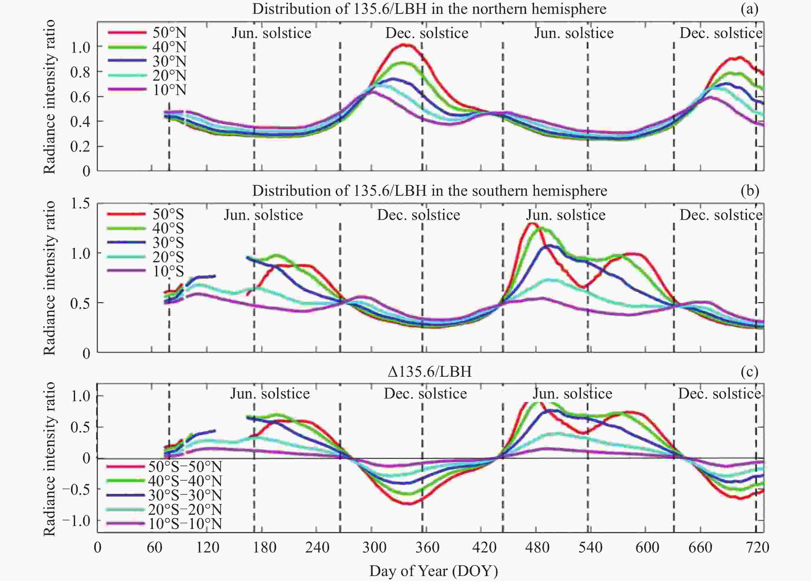Figure 8. Seasonal variations of the 135.6/LBH ratio at various latitude bands in the northern hemisphere (a) and southern hemisphere (b) between 17:00 LT and 18:30 LT from 15 March 2022, to 31 December 2023, as well as seasonal differences across different periods for global latitude bands (c). The seasonal differences are calculated by subtracting the values of the northern hemisphere from those of the southern hemisphere