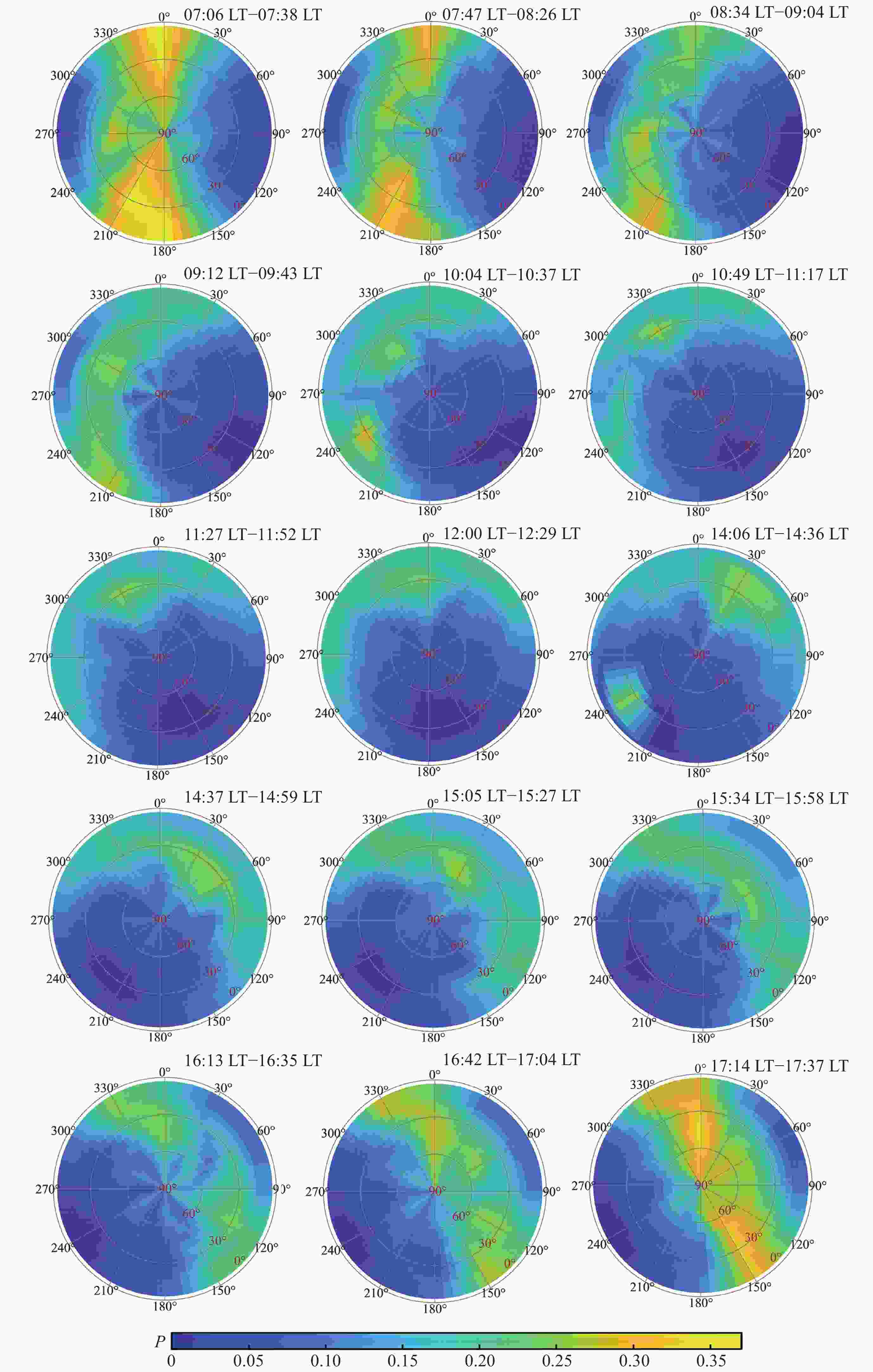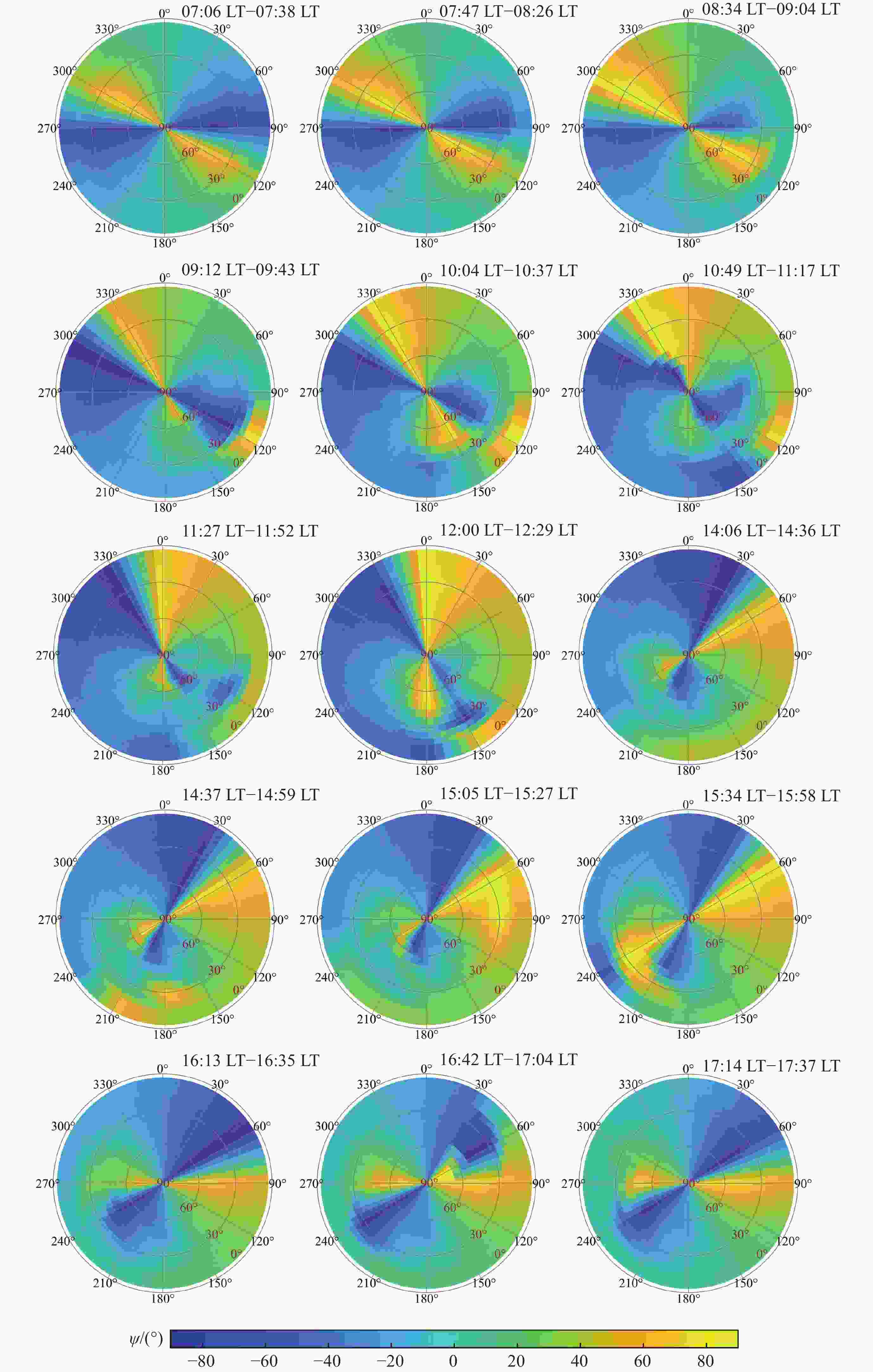 序号 时间(LT) 太阳高度角 太阳方位角 序号 时间(LT) 太阳高度角 太阳方位角 1 07:06-07:38 1°57′ ~8°12′ 99°50′ ~104°30′ 9 14:06-14:36 43°25′ ~39°52′ 210°49′ ~219°34′ 2 07:47-08:26 9°58′ ~17°31′ 105°51′ ~112°02′ 10 14:37-14:59 39°44′ ~38°02′ 219°51′ ~222°10′ 3 08:34-09:04 19°02′ ~24°34′ 113°23′ ~118°44′ 11 15:05-15:27 35°47′ ~32°21′ 227°05′ ~232°12′ 4 09:12-09:43 26°00′ ~31°19′ 120°15′ ~126°35′ 12 15:34-15:58 31°12′ ~27°06′ 233°44′ ~238°41′ 5 10:04-10:37 34°41′ ~39°26′ 131°20′ ~139°41′ 13 16:13-16:35 24°26′ ~20°24′ 241°34′ ~245°32′ 6 10:49-11:17 40°59′ ~44°06′ 143°01′ ~151°26′ 14 16:42-17:04 19°05′ ~14°54′ 246°44′ ~250°22′ 7 11:27-11:52 45°02′ ~46°54′ 154°40′ ~163°11′ 15 17:14-17:37 12°58′ ~8°27′ 251°58′ ~255°29′ 8 12:00-12:29 47°20′ ~48°15′ 166°02′ ~176°40′ 表 3 各时段全天区大气偏振角实测值