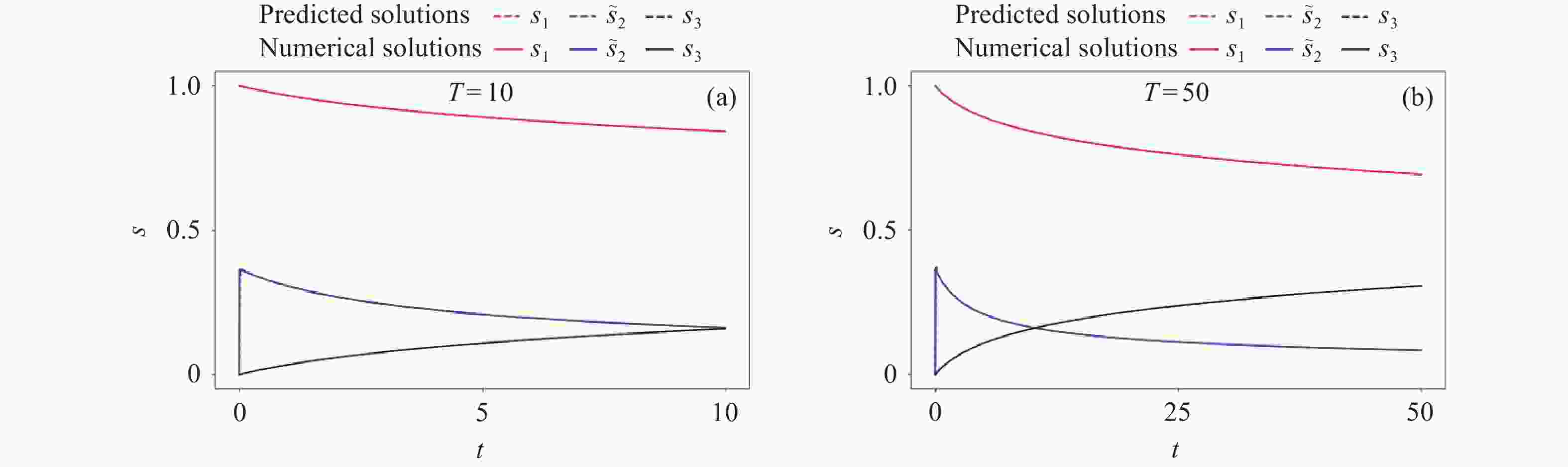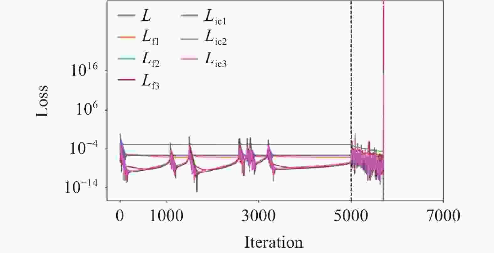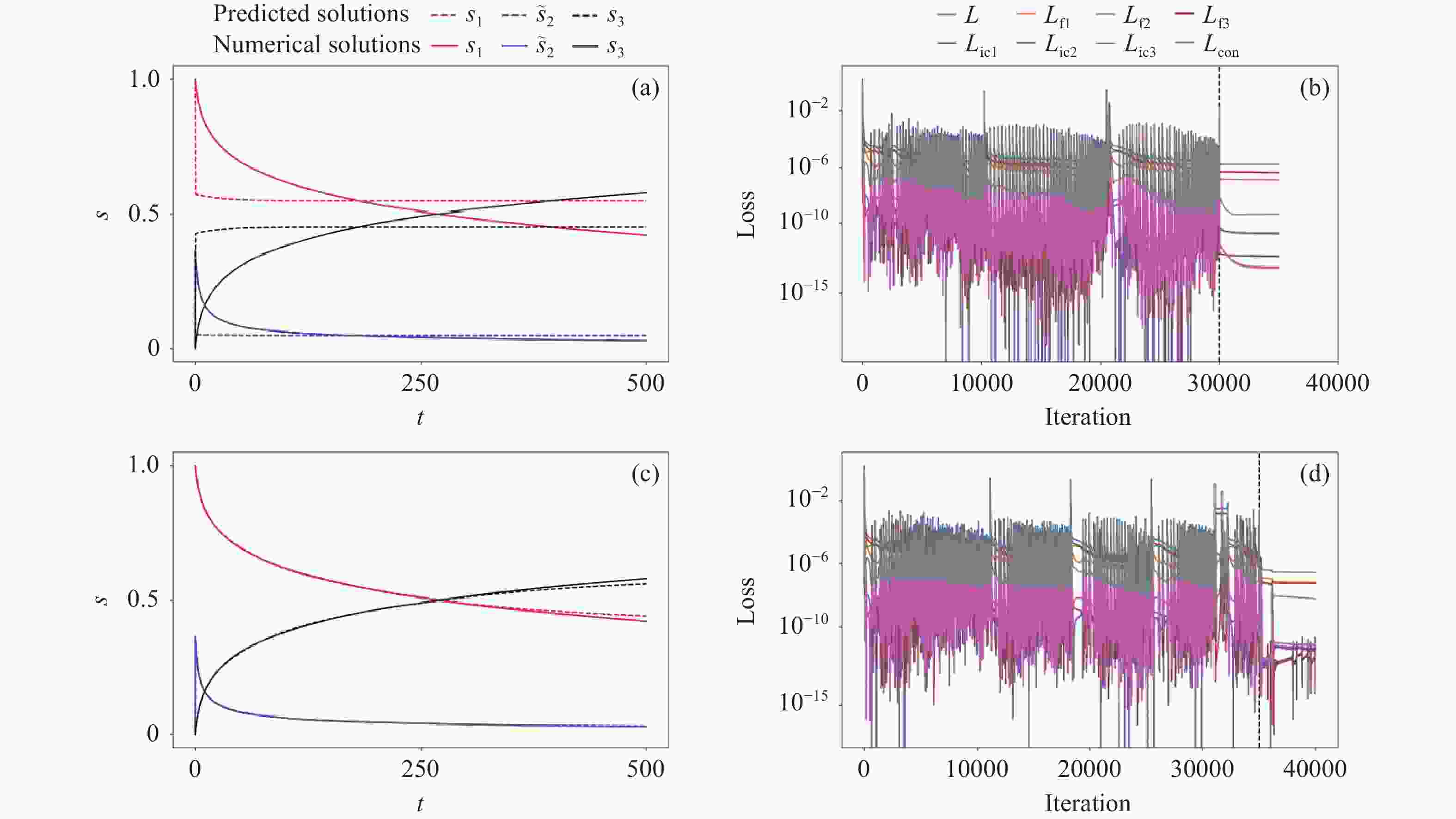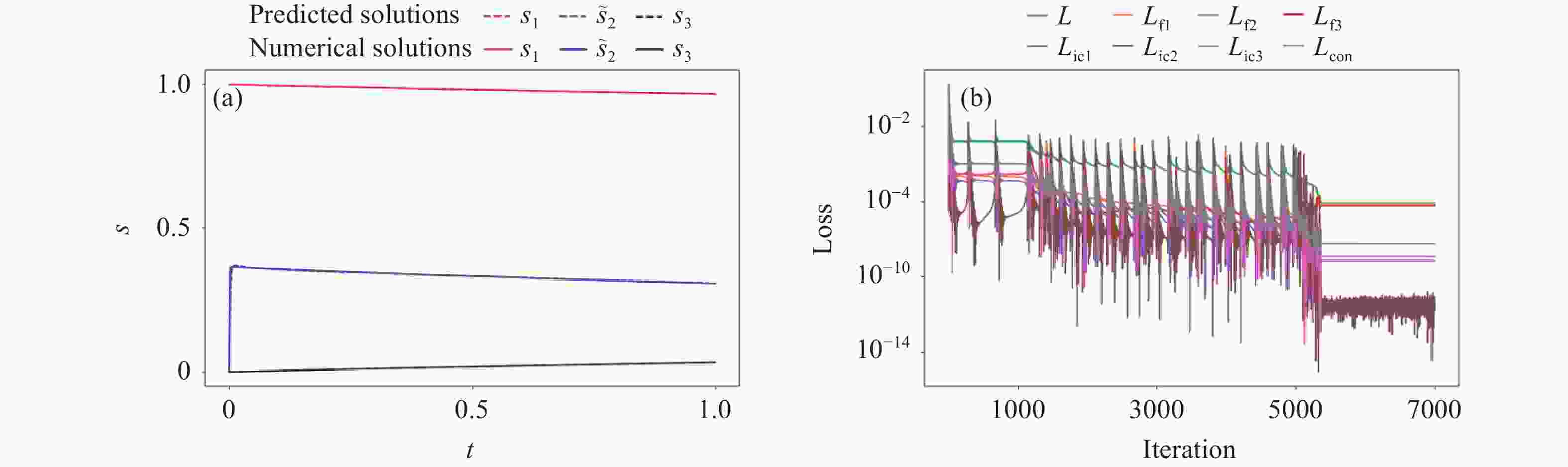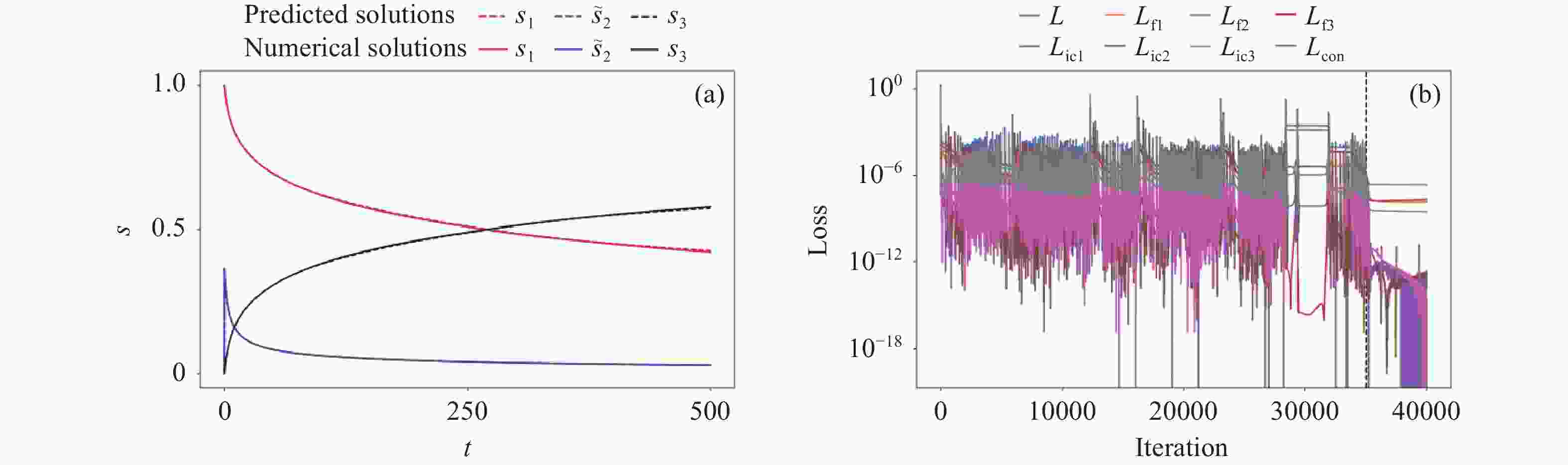 采样策略 采样点数量 Adam L-BFGS $ {s}_{1} $相对误差/(%) $ {s}_{2} $相对误差/(%) $ {s}_{3} $相对误差/(%) 随机采样 20000, t ∈[0, 500] 35000 5000 1.22 99.99 1.42 分段采样 12000, t ∈ [0, 50];