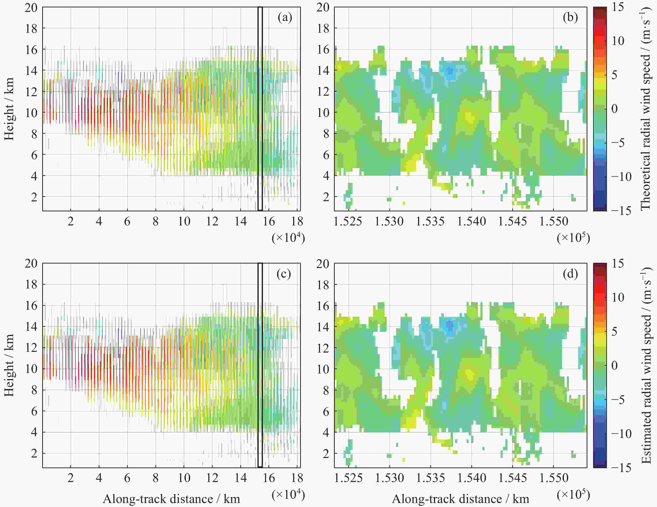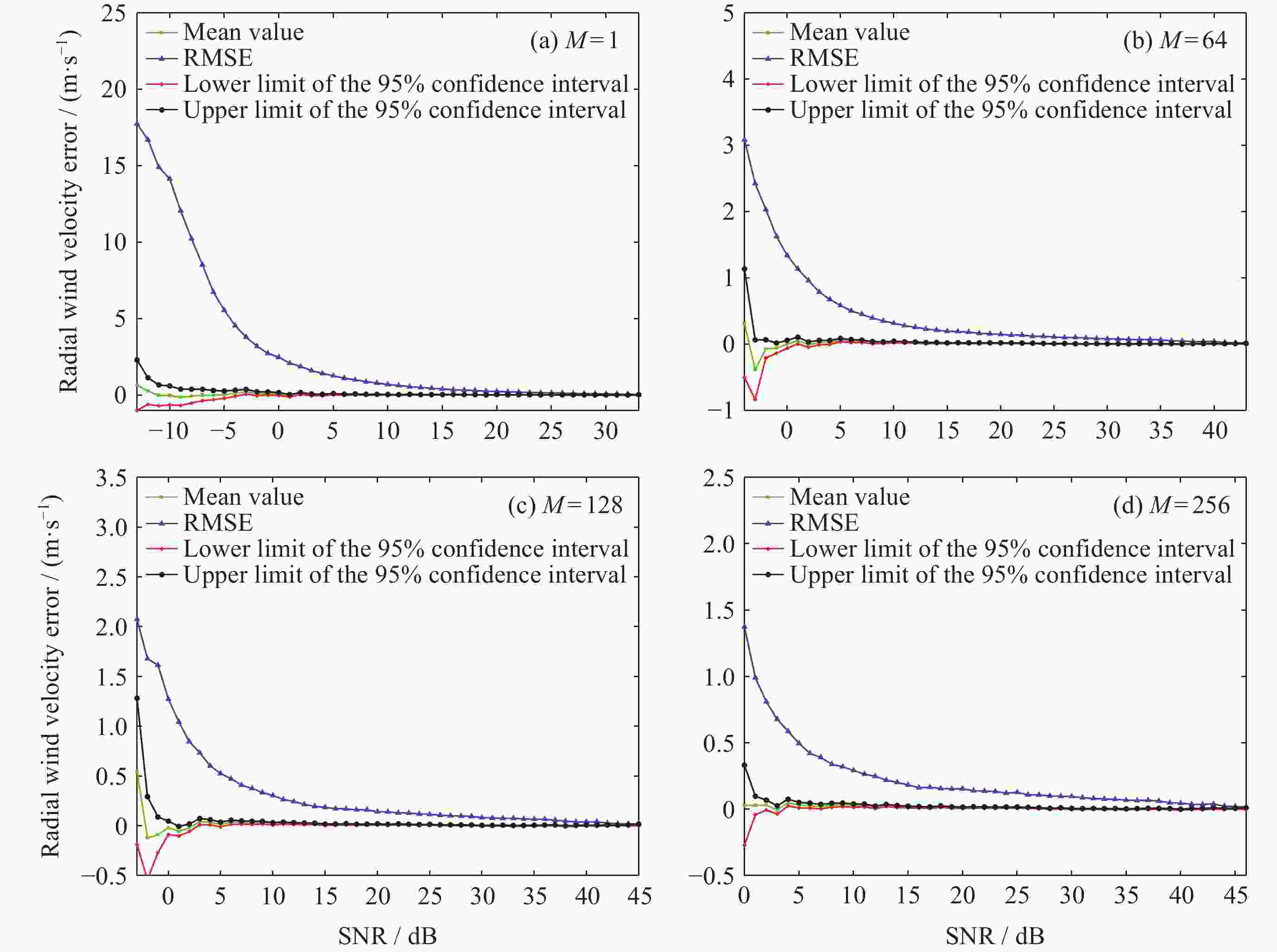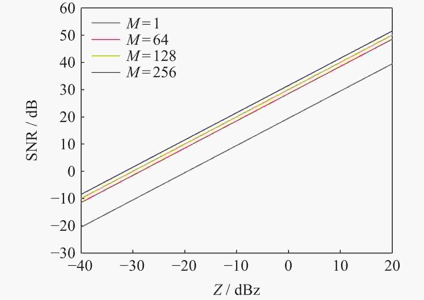 摘要: 全球三维大气风场探测对提升数值天气预报精度、增强气象灾害预警能力及保障航空航天安全具有关键作用. 本文建立了一套星载W波段多普勒雷达云内大气风场探测信号仿真系统, 通过输入实际场景的大气廓线数据, 仿真雷达回波信号, 进而利用回波信号估计径向风速, 并分析了信噪比和脉冲累积数对径向风速估计精度的影响. 结果表明, 对于星载W波段多普勒雷达, 当极化脉冲间隔不大于20 μs时, 极化分集脉冲对技术可实现0~40 m·s–1的风速探测范围, 有效获取云内高风速产品; 径向风速估计精度随脉冲累积数的增加和信噪比的增大而提升; 在本文雷达系统指标条件下, 当信噪比为0 dB, 脉冲累积数为64时, 径向风速估计精度为1.34 m·s–1, 能够满足数值天气预报2 m·s–1的测风精度要求.Abstract: The detection of the global three-dimensional atmospheric wind field plays a crucial role in improving the accuracy of numerical weather prediction, enhancing the ability of meteorological disaster early warning, and ensuring the safety of aerospace activities. At present, the main methods for detecting the atmospheric wind field include ground-based wind profile radars, spaceborne Doppler lidars, and millimeter-wave cloud radars, etc. Ground-based wind profile radars are difficult to deploy in oceanic and remote terrestrial areas, making it impossible to achieve global networked observations. Spaceborne Doppler Lidars can accurately detect the atmospheric wind field in clear-sky regions, but they are unable to obtain data on the wind field within clouds. Compared with lasers, millimeter waves have better penetration capabilities and possess unique advantages in the detection of the wind field within clouds. However, existing spaceborne millimeter-wave cloud radars cannot provide information on the horizontal wind field. Spaceborne millimeter-wave cloud radars with a conical scanning system can achieve the detection of the three-dimensional atmospheric wind field within clouds. In this paper, a signal simulation system for the atmospheric wind field detection within clouds by a spaceborne W-band Doppler radar was established, which provided a theoretical basis and technical reference for in-cloud wind field detection. The required elements of the signal simulation system include atmospheric profile data, reflectivity factor, attenuation coefficient, radar system parameters, spaceborne observation geometry, echo signal amplitude, echo signal frequency, echo signal phase, echo signals, and radial velocity. The system processes actual cloud profile data and simulates radar echo signals to estimate the radial wind speed. The effects of Signal-to-Noise Ratio (SNR) and pulse-pair cumulative number on the estimation accuracy of radial wind speed were systematically analyzed. The results show that for a spaceborne W-band Doppler radar, when the polarization pulse interval is not greater than 20 μs, the polarization diversity pulse-pair technique can achieve a wind speed detection range of 0 to 40 m·s–1, effectively obtaining high wind speed products within clouds. The estimation accuracy of radial wind velocity is positively correlated with the increase in SNR and the number of pulse-pair accumulations. Under the index conditions of the radar system described in this paper, when the SNR is 0 dB and the number of pulse-pair accumulations is 64, the estimation accuracy of the radial wind speed is 1.34 m·s–1, which can meet the wind measurement accuracy requirement of 2 m·s–1 for numerical weather prediction.