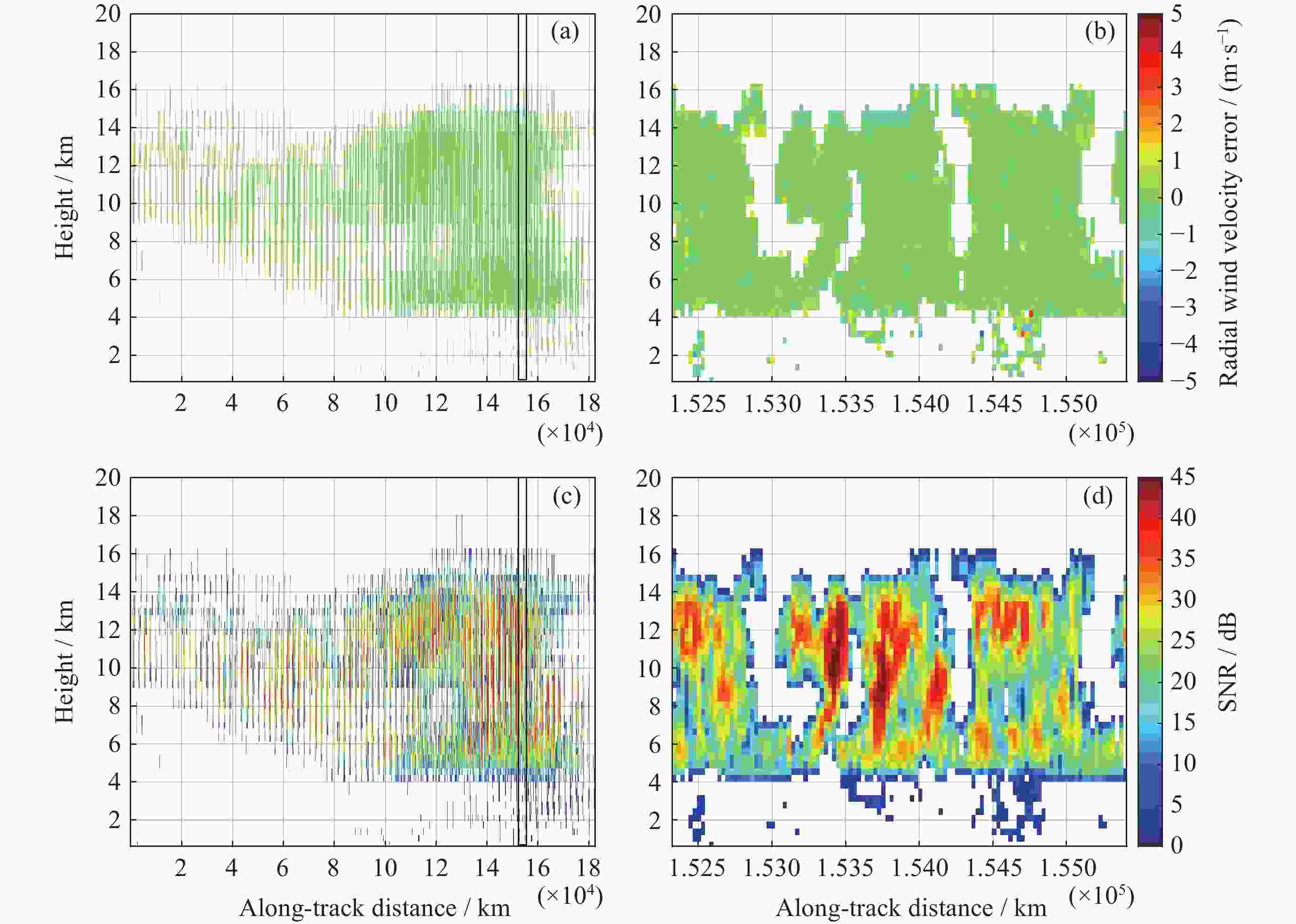 图 11 (a)整体云场景的径向风速误差, (b) 径向风速误差的局部放大, (c) 整体云场景的信噪比, (d) 信噪比的局部放大