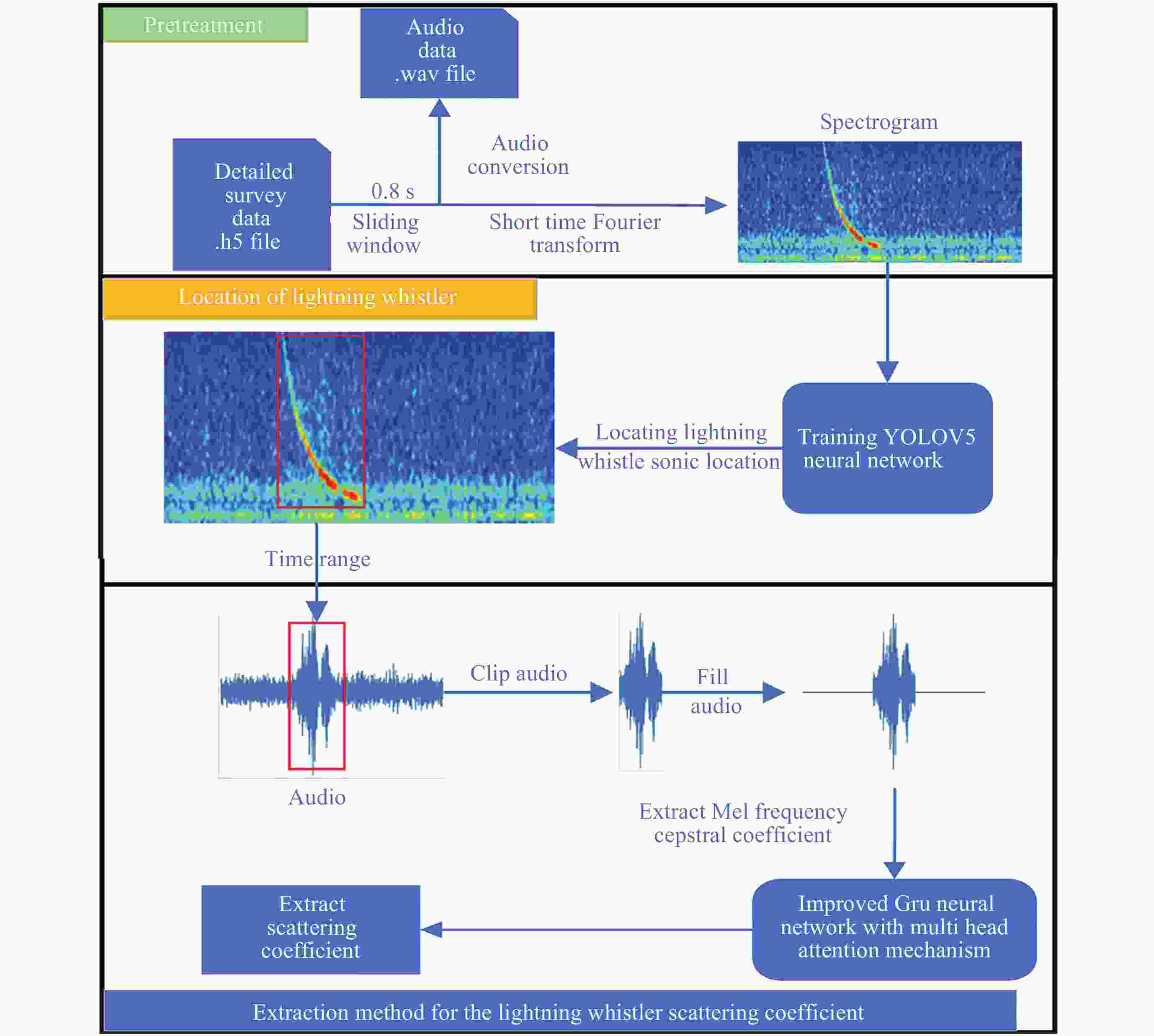 Abstract: The daily production data of the Zhangheng satellite can reach up to 20 GB, rendering manual methods inadequate for handling such massive data demands. This paper proposes a rapid and robust Lightning Whistle Scattering Coefficient Automatic Extraction Method (LWSC-AEM). Firstly, detailed data from the Search Coil Magnetometer (SCM) of the Zhangheng satellite is extracted using a sliding window of 0.8 seconds, which is then transformed into time-frequency plots and audio files. Secondly, a YOLOV5 neural network is employed to automatically locate LW in the time-frequency plots and output their time-frequency position information. Subsequently, the corresponding audio data containing Lightning Whistlers is extracted based on this time-frequency position information from the files, and zero-padded to form audio segments of 0.8 seconds. Finally, the Mel Frequency Cepstral Coefficients (MFCCs) of the audio segments are extracted and fed into a Gate Recurrent Unit (GRU) improved with a multi-head attention mechanism to automatically extract the LW scattering coefficient. Applying this method to the data from the VLF band of the SCM payload of the Zhangheng satellite in February 2020 yields the following results: the average absolute error and average absolute percentage error are 0.453 and 0.176 respectively. Compared to the method by Ref. [1 ], the average absolute error is reduced by 1.079, a decrease of 70%, and the average absolute percentage error is reduced by 0.148, a decrease of 46%. The average processing time per data segment is 0.074 seconds, which is a reduction of 0.826 seconds, or 92%, compared to the method by Ref. [1 ], which processed each data segment on average. The automatic extraction method for lightning whistler wave scattering coefficients proposed in this paper can quickly and accurately extract these coefficients. -