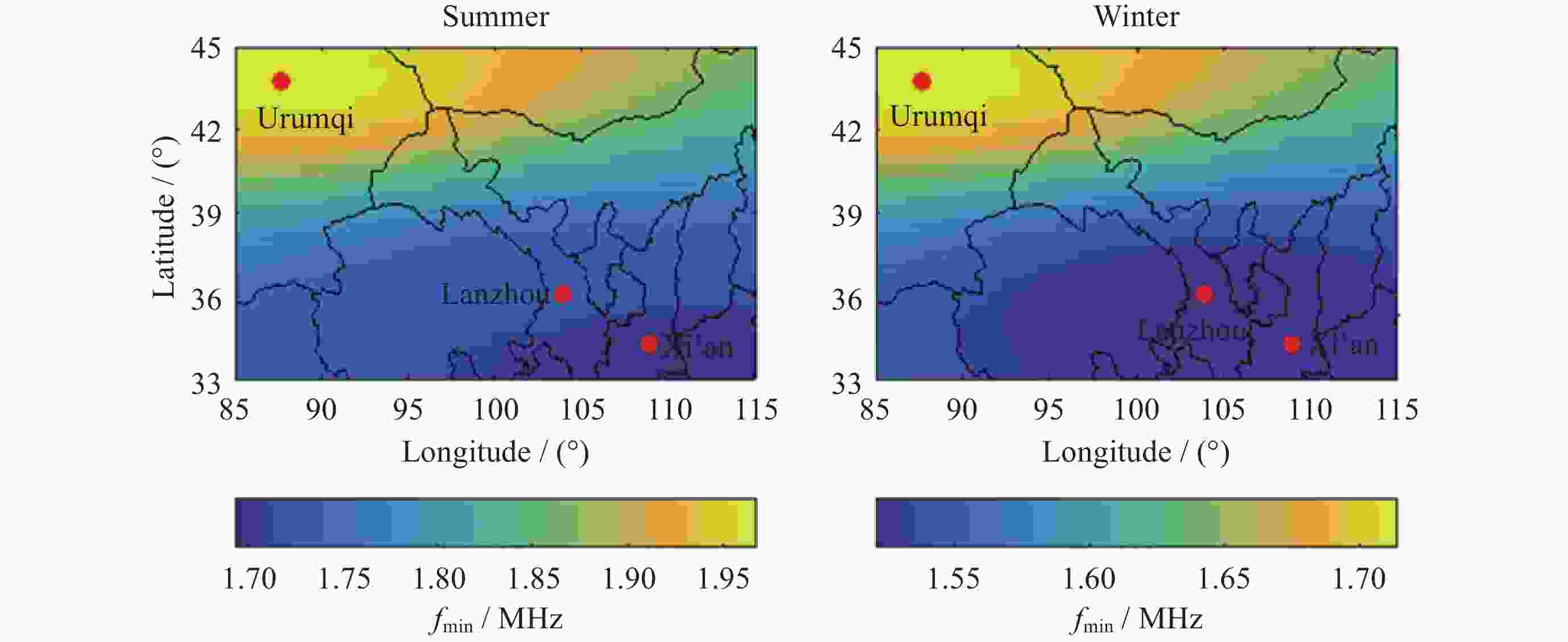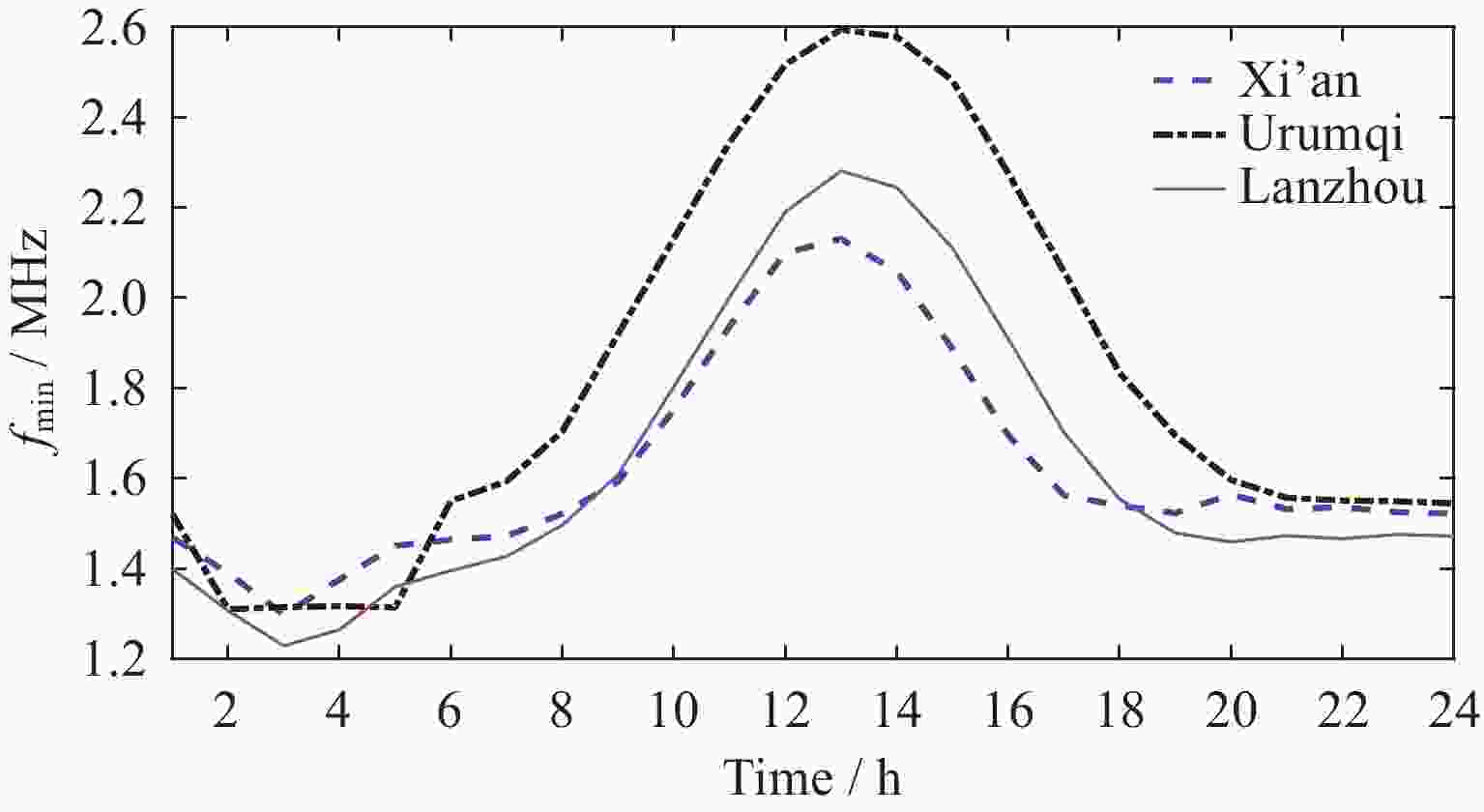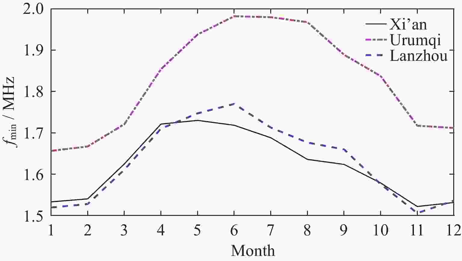 摘要: 电离层fmin是频高图上观测到的回波最低频率, 是电离层垂直探测仪性能的一个重要指标, 也是电离层D区吸收效应研究的重要指标. 本文利用中国电离层垂测站网位于西北走廊地区的西安、乌鲁木齐、兰州三个台站电离层fmin数据, 研究了西北走廊地区电离层吸收的强度特性、空间分布特性、日变化、季节变化及长期变化特性. 开展电离层吸收变化特性研究, 对研究短波通信最低频率选择、天波超视距雷达探测性能评估、甚低频(VLF)远程通信效能预测具有重要应用价值. 同时电离层吸收与D层电子密度关系紧密, 是D层电子密度强弱的重要指标, 开展电离层吸收特性研究, 对于研究D区电离层变化特性, 建立D区电子密度分布模型具有重要科学意义.Abstract: Ionospheric fmin is the lowest echo frequency observed on the frequency height map, which is an important index of the performance of the ionosonde and also an important index for the study of the absorption effect in the ionospheric D region. In this paper, the ionospheric absorption intensity, spatial distribution, diurnal variation, seasonal variation and long-term variation are studied by using ionospheric fmin data from Xi’an, Urumqi and Lanzhou stations of China ionospheric vertical survey network in the Northwest Corridor region. The study of ionospheric absorption variation is of great application value to the selection of the lowest frequency of shortwave communication, the evaluation of detection performance of sky-wave over-the-horizon radar and the prediction of VLF telecommunication efficiency. At the same time, ionospheric absorption is closely related to the electron density of the D layer, which is an important indicator of the intensity of the electron density of the D layer. To study the ionospheric absorption characteristics is of great scientific significance for the study of the ionospheric variation characteristics and the establishment of the electron density distribution model in the D region. The absorption effect of ionospheric region D in the Northwest Corridor mainly occurs in the daytime, with the highest absorption intensity at noon and the weakest in the early morning at night. Meanwhile, the absorption effect of ionospheric region D in the Northwest Corridor has significant seasonal variation characteristics, the strongest in summer and the weakest in other seasons. The ionospheric fmin value of Urumchi at higher latitude is obviously higher than that of Xi’an and Lanzhou at middle latitude, and the absorption effect center has obvious diurnal drift characteristics. The absorption of ionospheric region D in the Northwest Corridor is positively correlated with the intensity of solar activity. In particular, the absorption intensity of ionospheric region D in high solar activity years is significantly higher than that in low solar activity years.