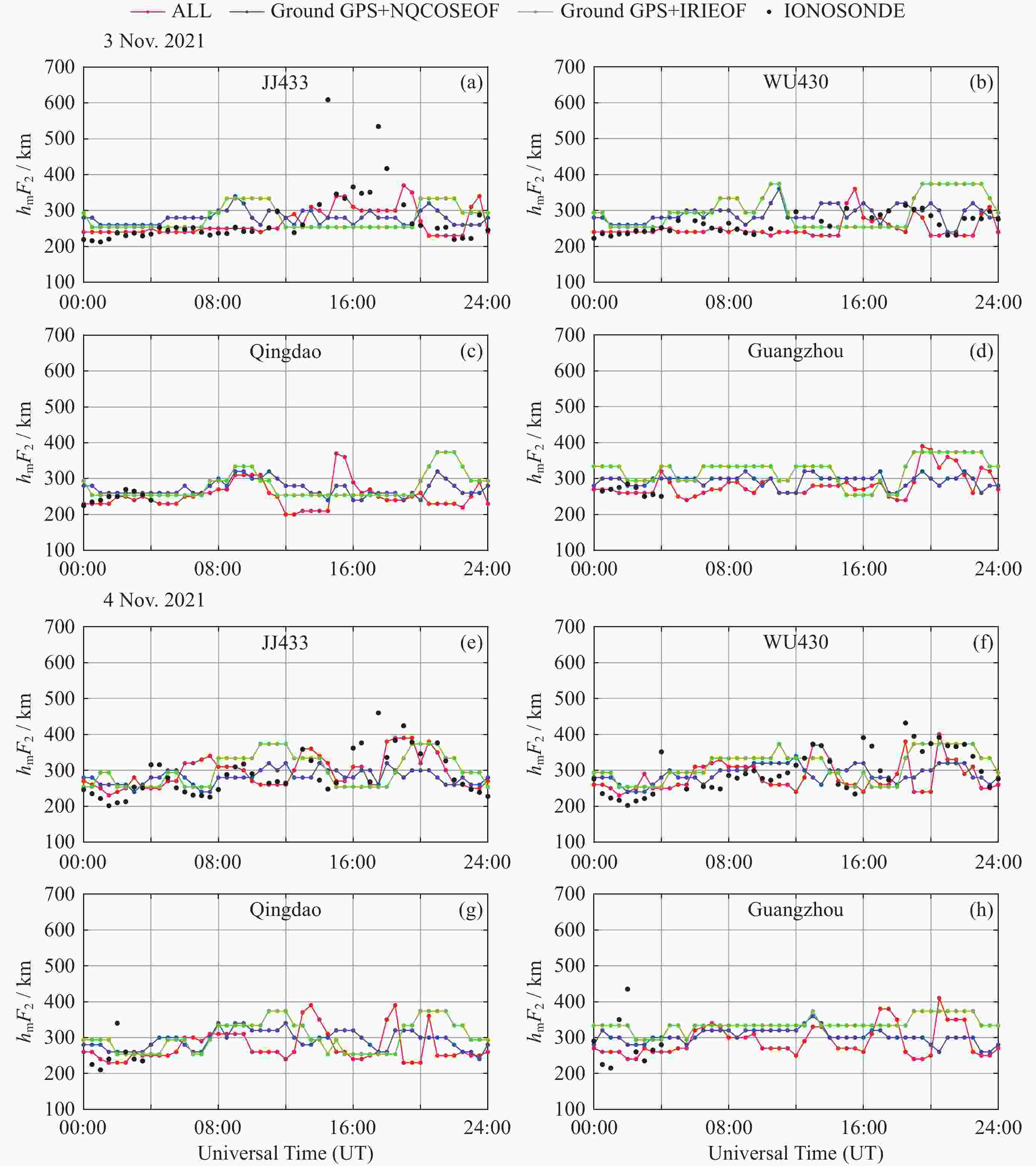 百分比/(%)2021-11-03 JJ433 1.13 1.57 1.42 1.91 ― 1.22 1.8 ― WU430 1.94 2.28 1.95 2.30 ― 1.24 1.58 30.7 Qingdao 1.19 1.43 1.25 1.57 ― 1.09 1.49 ― Guangzhou 6.07 7.68 6.14 7.77 ― 5.04 6.37 17.0 2021-11-04 JJ433 2.38 3.38 2.32 3.30 2.37 1.81 2.68 20.7 WU430 1.94 3.01 1.97 3.01 ― 2.14 2.82 6.31 Qingdao 2.04 2.77 1.91 2.66 3.97 1.74 2.25 18.77 Guangzhou 3.87 6.09 4.22 6.40 ― 3.60 5.63 7.55 表 2 2021年11月3日和4日层析结果与测高仪hmF2误差 (单位: km)