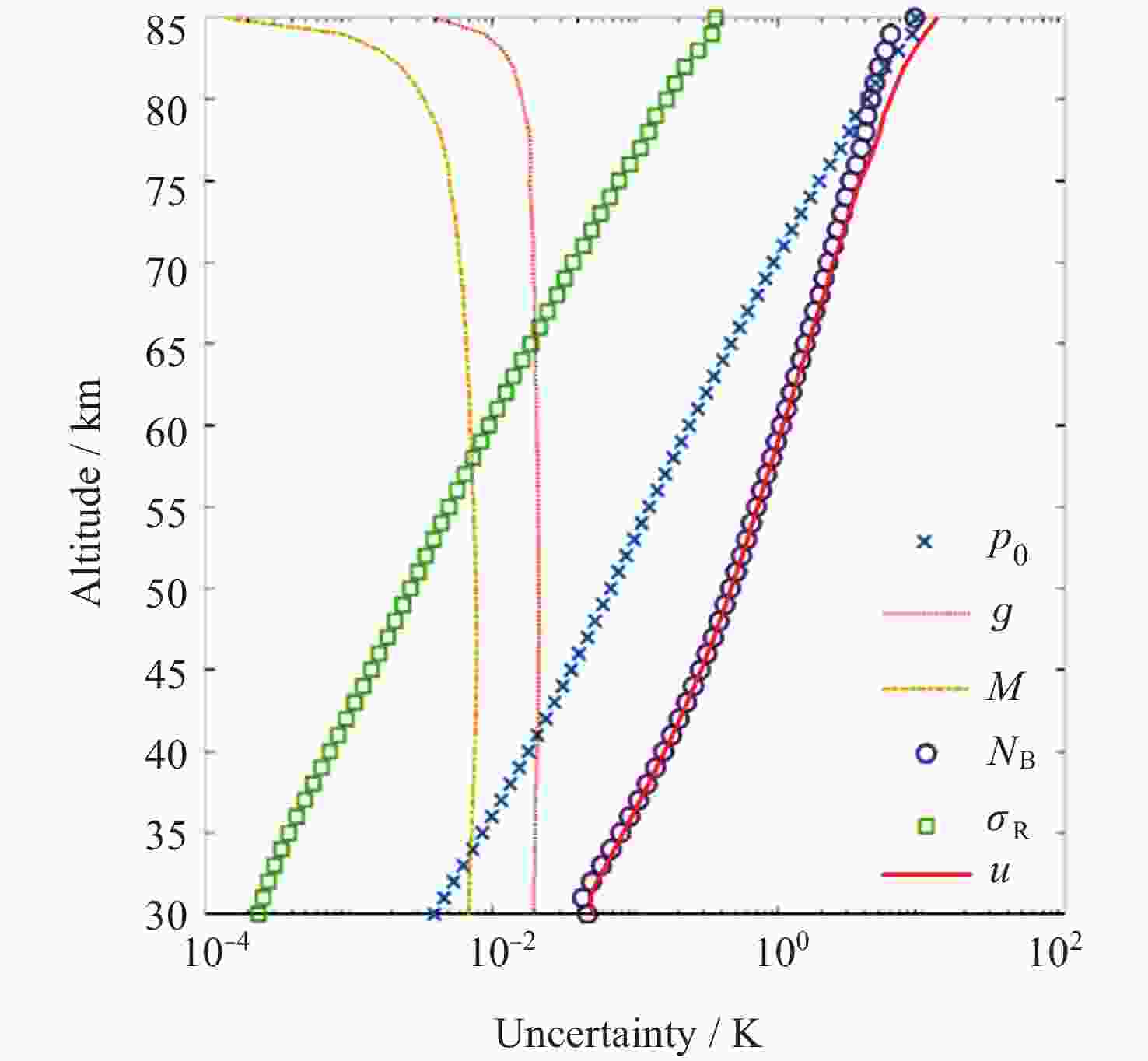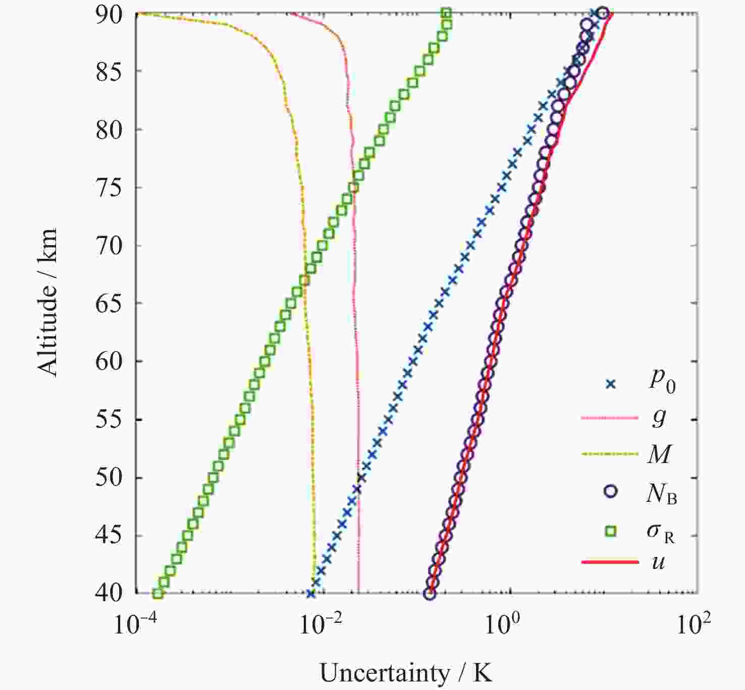 不确定度来源 相对偏差最大值/(%) 参考压强 0.74 重力加速度 4.00 平均大气分子摩尔质量 1.67 瑞利散射截面 0.59 噪声 4.18 表 4 地基瑞利激光雷达系统参数