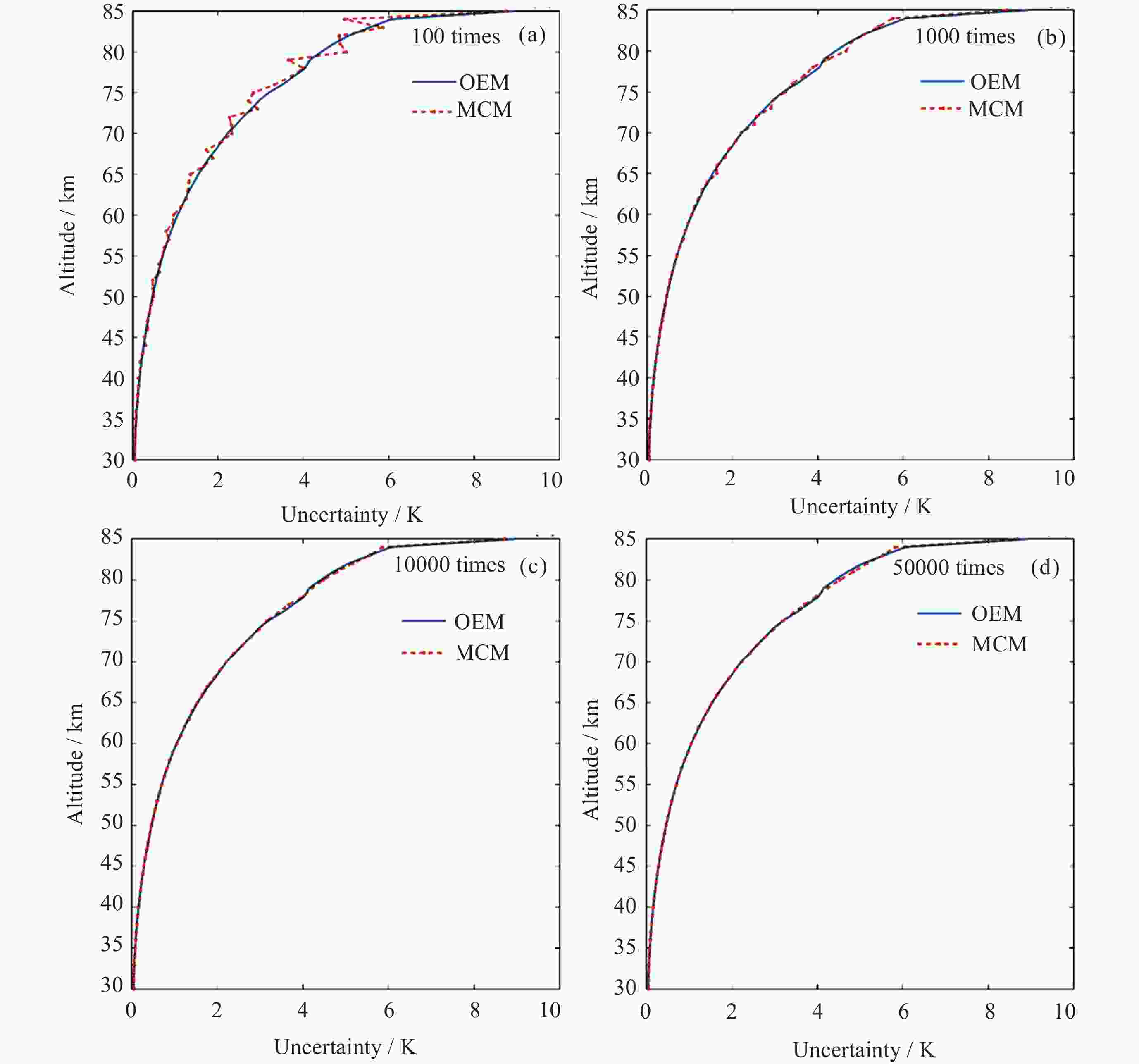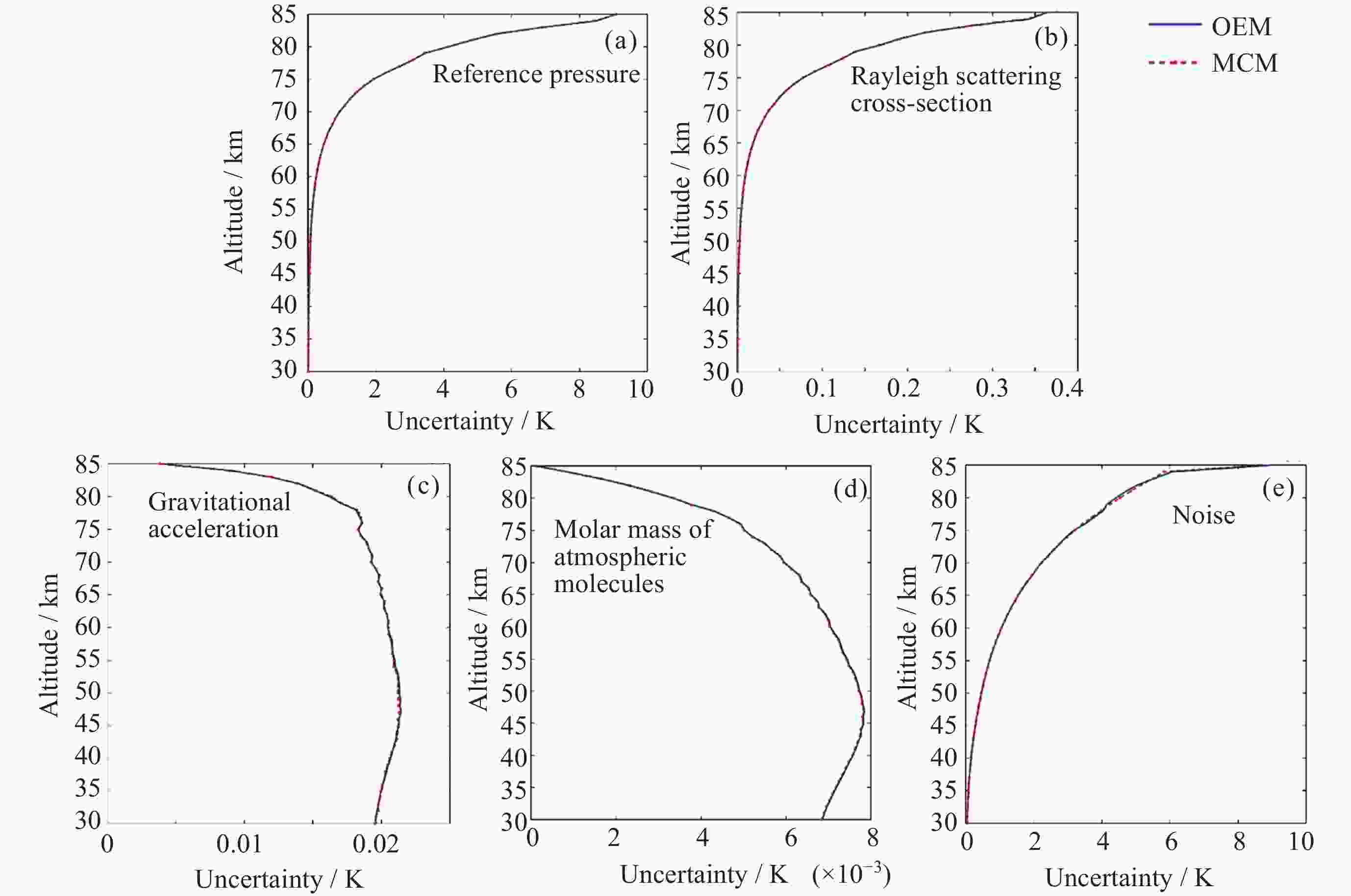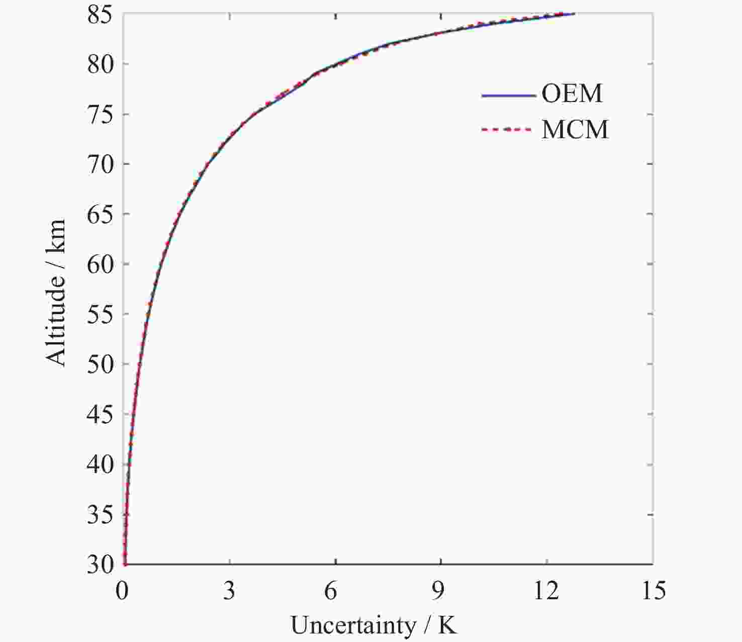 摘要: 最优估计法(OEM)作为一种新型的反演方法, 在激光雷达探测大气环境参数中具有重要应用价值. 为了表征基于OEM方法的瑞利激光雷达反演大气温度结果的可靠性, 本文推导了OEM不确定度公式, 明确了OEM反演结果的不确定度来源, 利用瑞利激光雷达方程模拟回波光子数廓线, 计算了相应的中层大气温度和不确定度, 得到在OEM反演过程中的主要不确定度来源, 即参考压强不确定度和噪声不确定度. 利用蒙特卡罗方法(MCM)建立OEM不确定度验证框架, 对不同不确定度来源产生的不确定度数值进行了验证, 结果表明两种不同方法计算的不确定度数值在海拔85 km以下一致性良好, 证明OEM不确定度计算数值的准确性. 此外, 基于OEM方法对瑞利激光雷达的实测数据进行反演, 并完成了不确定度分析, 为OEM方法在激光雷达大气环境探测领域的推广使用提供了依据.Abstract: As a new retrieval method, the Optimal Estimation Method (OEM) is playing an increasingly important role in detecting the atmospheric environment by lidar. In this study, the necessity of calculating the uncertainty of retrieval results was analyzed first. To characterize the reliability of the atmospheric temperature inversion results by lidar, the OEM uncertainty formula was derived and the sources of uncertainty was clarified. There were four sources of uncertainty, which were smoothing uncertainty, model parameter uncertainty, forward model uncertainty and noise uncertainty. Regarding the problem of using Rayleigh lidar to retrieve the temperature of the middle atmosphere, the forward model was derived based on the lidar equation, ideal gas state equation, and hydrostatic equilibrium as reasonable assumptions. Based on the simulated echo photon profiles of the Rayleigh lidar calculated by forward model, the middle atmospheric temperature and the corresponding uncertainty was calculated, which demonstrated that the main uncertainty sources in the OEM retrieval process are the reference pressure uncertainty and noise uncertainty. Using the Monte Carlo Method (MCM), the OEM uncertainty verification framework was established and the uncertainty values generated by different sources of uncertainty were verified. Afterwards, the total uncertainty value caused by all sources of uncertainty was also verified. Results showed that the uncertainty calculated by two different methods and the total uncertainty were consistent below the altitude of 85 km, proving the accuracy of the OEM uncertainty theories. In addition, temperature retrieval based on measured results by Rayleigh lidar was performed. The characteristics of the measured data were introduced in detail, and the retrieval results and corresponding uncertainties were calculated. The results prove the conclusion that the main uncertainty sources in the OEM inversion process are the reference pressure uncertainty and noise uncertainty. The work of this article paves the way for the applications of lidar in monitoring the atmospheric environment.