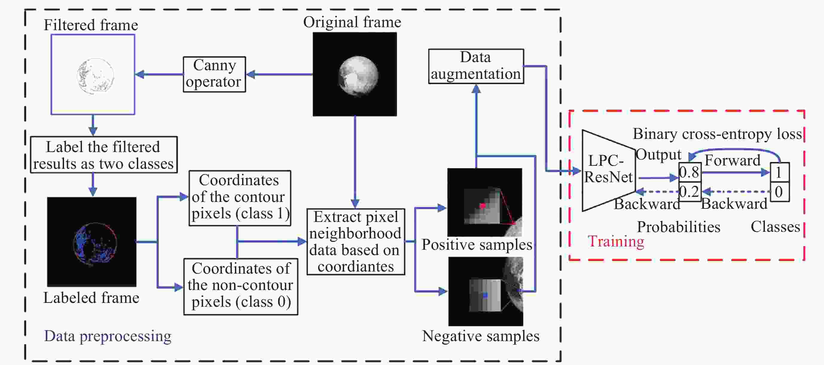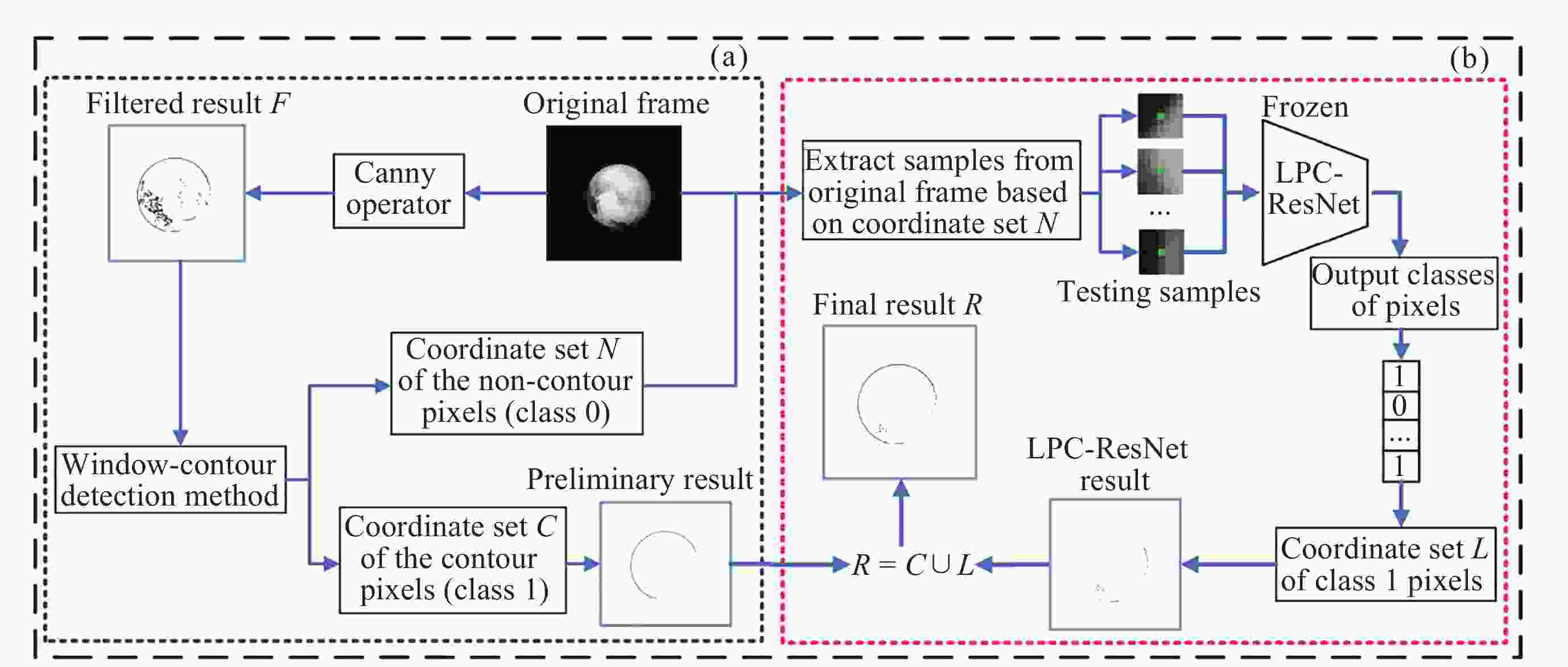 Figure 2. Process flowchart for a two-stage contour detection method for small-scale disk resolved celestial datasets. (a) The first stage, where preliminary contours are obtained by performing the window-contour detection method. (b) The second stage, where the LPC-ResNet classifier is used to supplement the contour points missed by the first stage