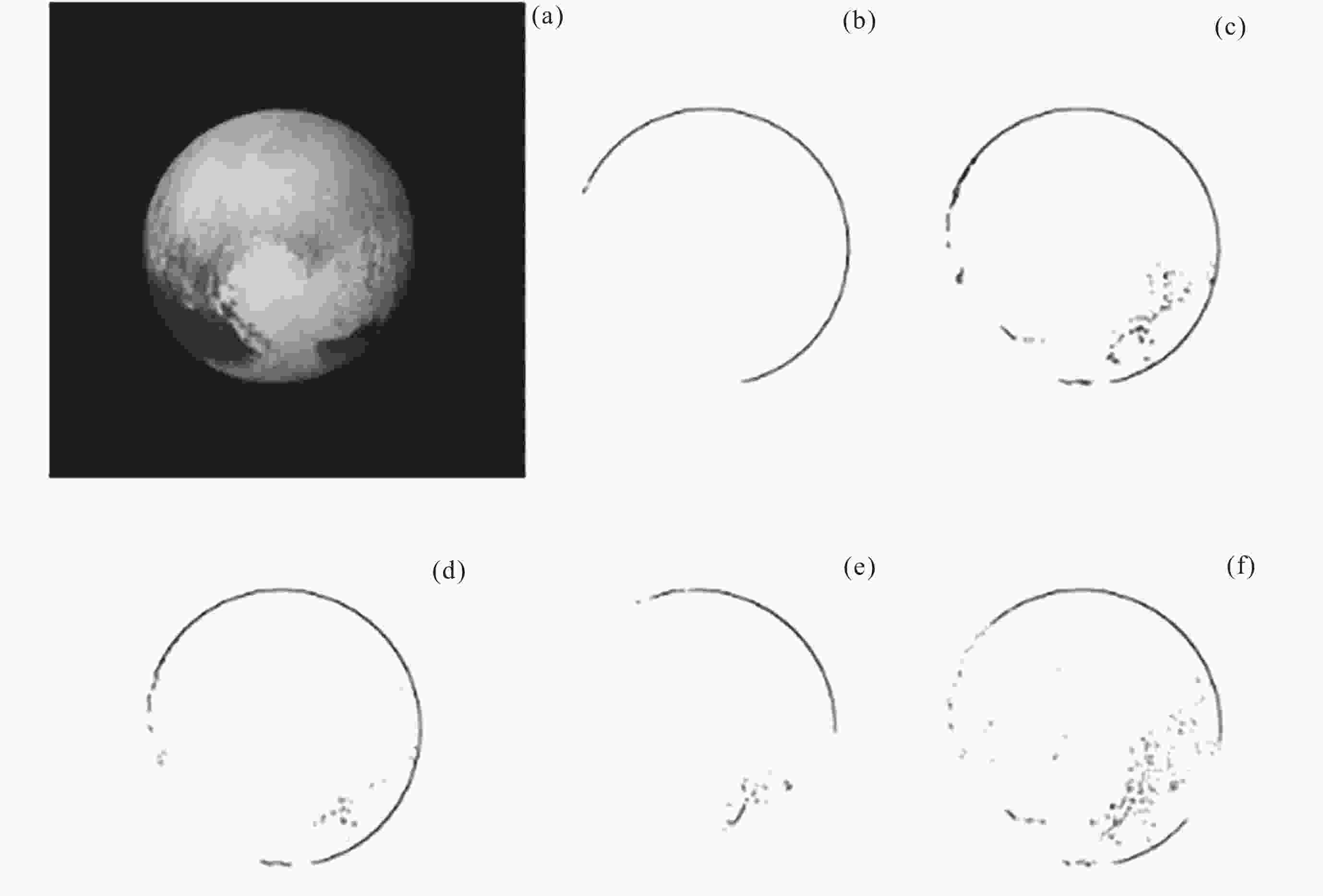 图 8 使用不同方法检测的冥王星边缘结果. (a) 原图像, (b) 窗口–边缘检测法的结果, (c) LPC-ResNet检测结果, (d) 窗口–边缘检测法+LPC-ResNet检测结果, (e) Sobel算子结果, (f) Zhang等提出的方法结果