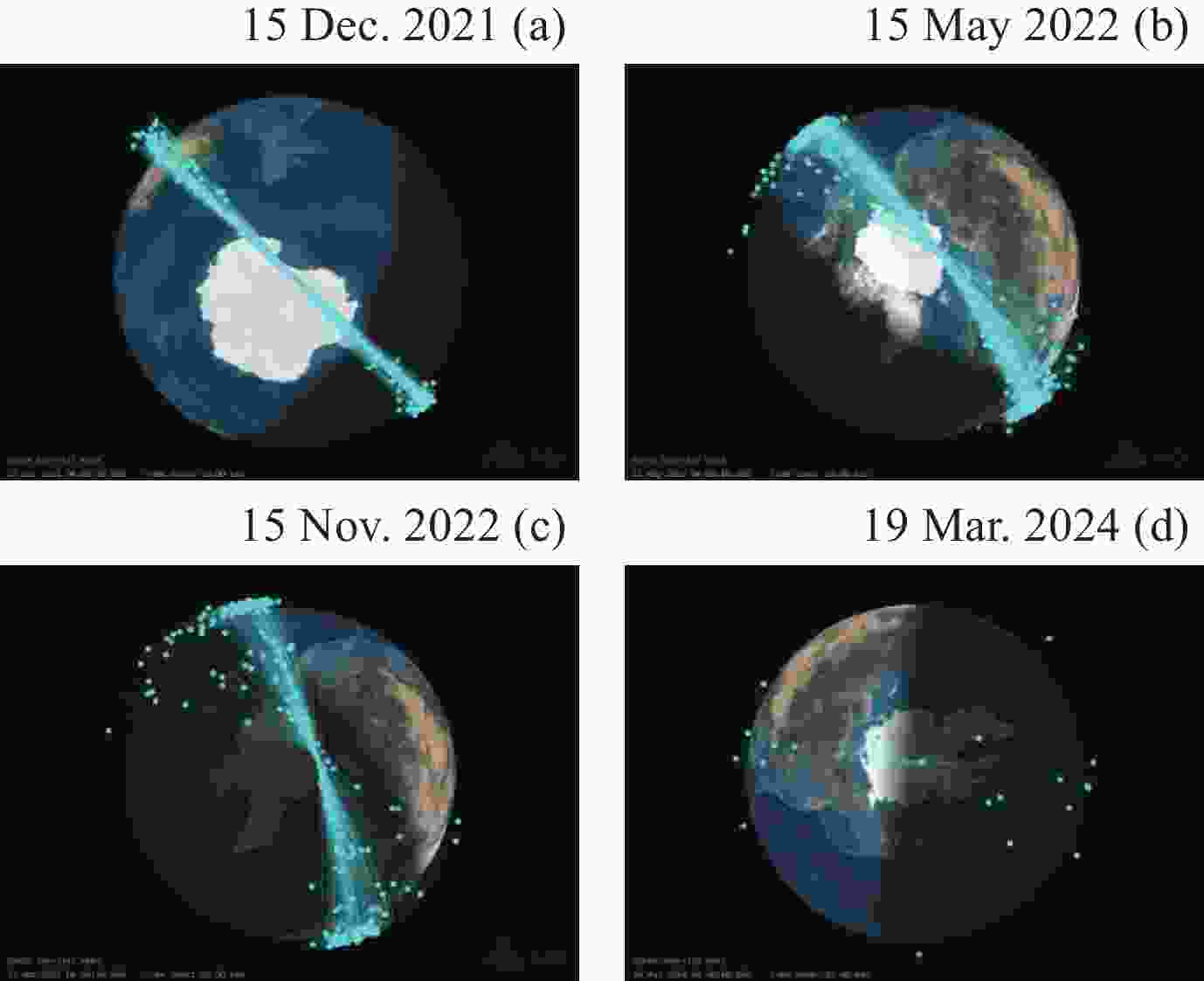 摘要: 地球轨道的航天器越来越多, 近地空间密度不断增大. 据统计, 现有空间碎片主要来源于约640次的解体事件. 研究卫星解体事件对维持空间环境安全具有重要意义. 2021年11月15日, 俄罗斯进行了一次反卫星试验, 摧毁了一颗报废卫星——COSMOS 1408卫星. 事件产生了一片由约1800个可跟踪碎片组成的碎片云, 碎片云分布于200~1400 km高度区间, 随时间扩散演化, 对低地球轨道(Low Earth Orbit, LEO)卫星运行构成威胁. 本文基于美国空间监视网(Space Surveillance Network, SSN)发布的关于COSMOS 1408解体事件碎片的两行轨道根数(Two Line Element, TLE), 利用简化广义摄动模型第四版(Simplified General Perturbations 4, SGP4)模型对该碎片云进行演化分析, 主要包括碎片云的编目数量和时空变化、主要轨道参数变化、解体碎片对空间环境的影响, 并以事件碎片导致的国际空间站(International Space Station, ISS)四次机动规避碎片事件为例, 探究其演化规律以及带来的影响, 初步还原了COSMOS 1408反卫星事件碎片云的演化过程以及造成的影响.Abstract: The number of spacecrafts in Earth orbit continues to increase, leading to growing density in near-Earth space. Statistics show that existing space debris primarily originates from approximately 640 breakup events. Studying satellite breakup events is crucial for maintaining space environment safety. On 15 November 2021, Russia conducted an anti-satellite test, destroying a defunct satellite — COSMOS 1408. The event generated a debris cloud consisting of approximately 1800 trackable debris distributed across altitudes ranging from 200 km to 1400 km, which disperses and evolves over time, posing threats to Low Earth Orbit (LEO) satellite operations. Based on the Two-Line Element (TLE) data of COSMOS 1408 breakup event debris released by the U.S. Space Surveillance Network (SSN), this paper utilizes the Simplified General Perturbations 4 (SGP4) model to analyze the evolution of the debris cloud. The analysis primarily covers the cataloged quantity and spatiotemporal changes of the debris cloud, variations in main orbital parameters, and the impact of breakup debris on the space environment. Taking the International Space Station’s (ISS) four debris avoidance maneuvers as examples, this study investigates the evolution patterns and resulting impacts, preliminarily reconstructing the evolution process of the COSMOS 1408 anti-satellite event debris cloud and its consequences.