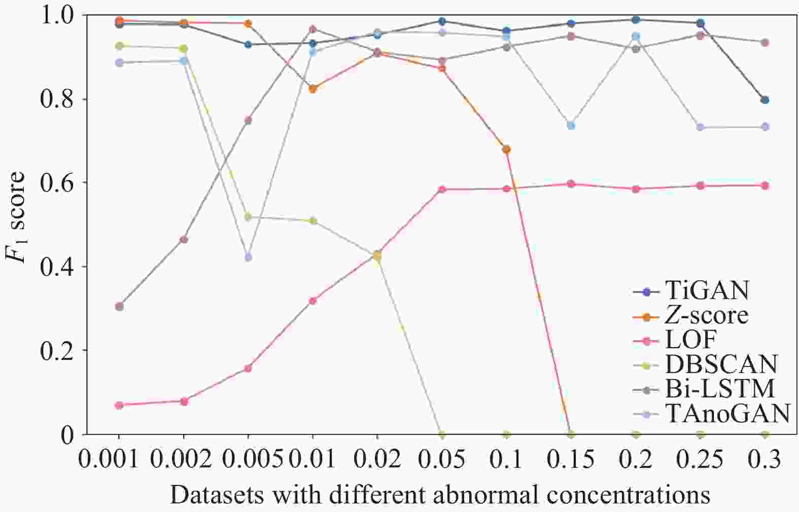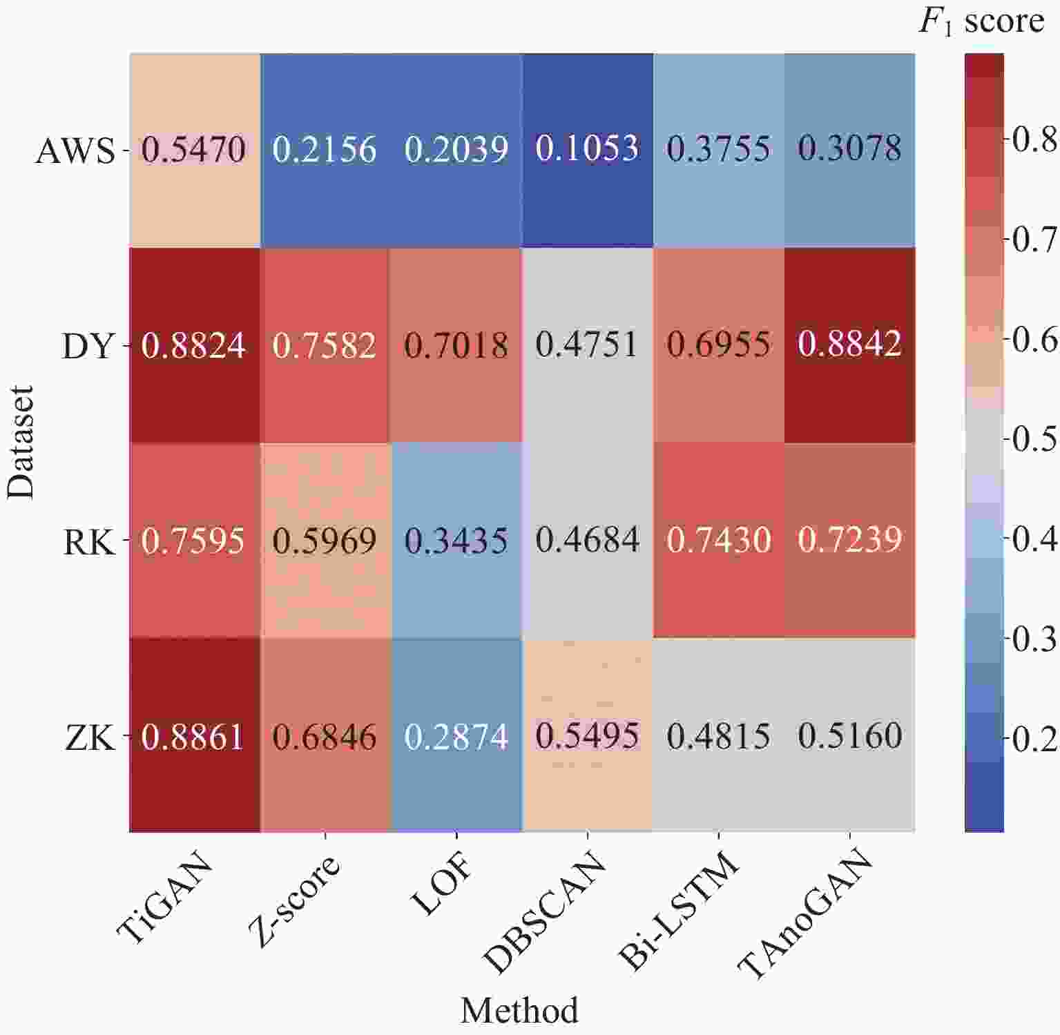 数据集 指标 TiGAN Z-score LOF DBSCAN Bi-LSTM TAnoGAN DY F1 0.8824 0.7582 0.7018 0.4751 0.6955 0.8842 Rec 0.7895 0.6106 0.5405 0.3115 0.9997 0.9411 Pre 1.0000 1.0000 1.0000 1.0000 0.5332 0.8338 Acc 0.9871 0.9961 0.9974 0.9932 0.5362 0.9913 RK F1 0.7595 0.5969 0.3435 0.4684 0.7430 0.7239 Rec 0.7124 0.5418 0.8894 0.3788 0.9987 0.8131 Pre 0.8133 0.6643 0.2128 0.6135 0.5916 0.6253 Acc 0.9615 0.9883 0.8887 0.9805 0.6548 0.9566 ZK F1 0.8861 0.6846 0.2874 0.5495 0.4815 0.5160 Rec 0.9159 0.7199 0.6445 0.4464 0.9970 0.9837 Pre 0.8581 0.6526 0.1849 0.7143 0.3174 0.3498 Acc 0.9823 0.9917 0.8707 0.9930 0.5534 0.8918 AWS F1 0.5470 0.2156 0.2039 0.1053 0.3755 0.3078 Rec 0.8733 0.2714 0.7600 0.0563 0.8760 0.7909 Pre 0.39818 0.1788 0.1177 0.8135 0.2390 0.1911 Acc 0.6161 0.7861 0.3557 0.8960 0.3611 0.4064 注 加粗字体表示该指标下的最高值. 表 4 特征学习模块对检测结果影响的对比