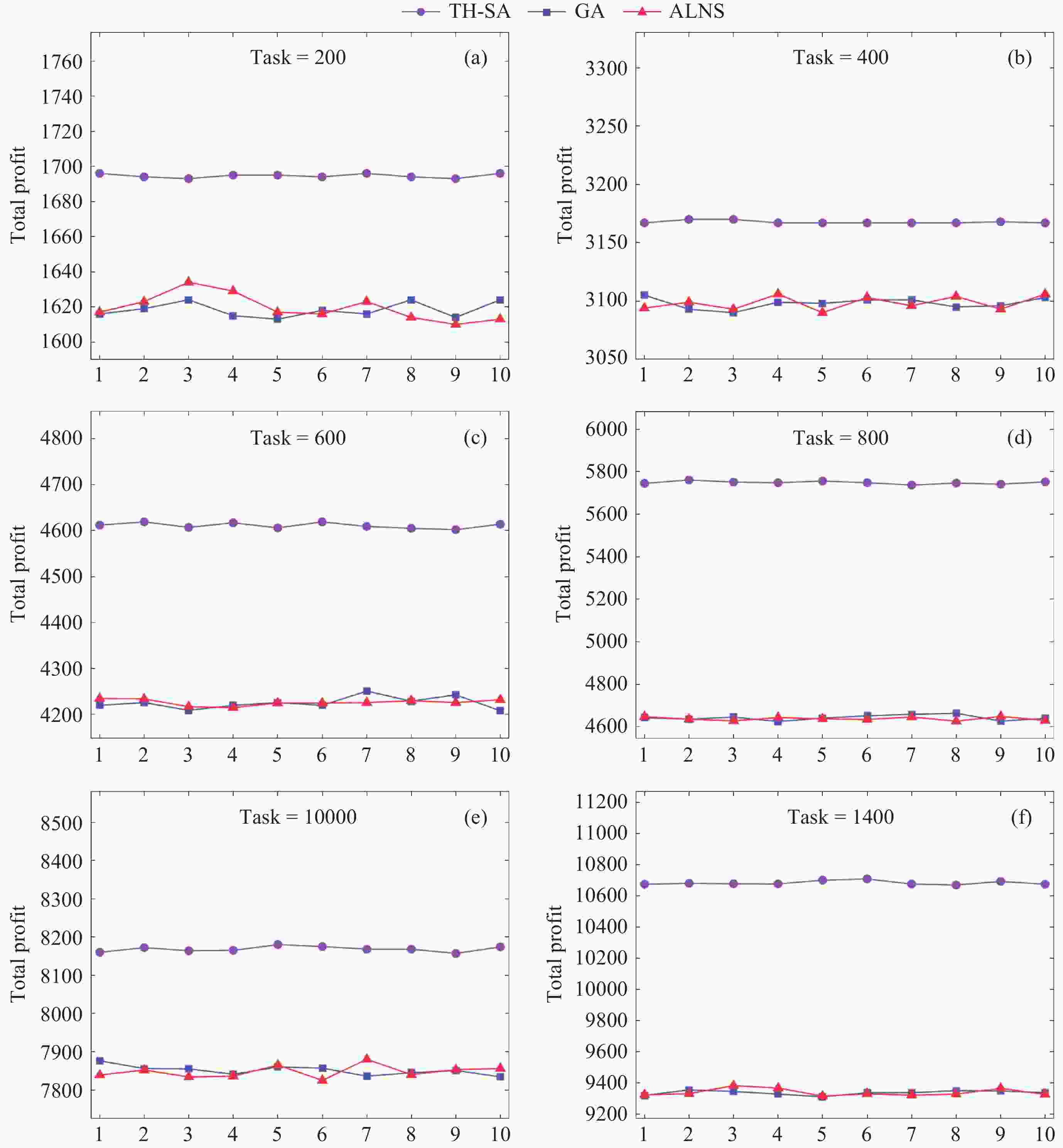 任务集 TH-SA GA ALNS 100 0.1786 0.1715 0.2314 200 0.2907 0.3447 0.4039 300 0.4648 0.4979 0.5386 400 0.7495 0.7929 0.8682 500 0.8572 1.0234 1.0881 600 1.0799 1.3051 1.3983 700 1.2866 1.614 1.7194 800 1.5199 1.8827 1.9788 1000 2.0191 2.8366 2.9503 1100 2.2655 3.2001 3.2477 1200 2.5913 3.5522 3.6606 1300 2.8031 3.8833 3.9863 1400 3.1638 4.6034 4.9579 -