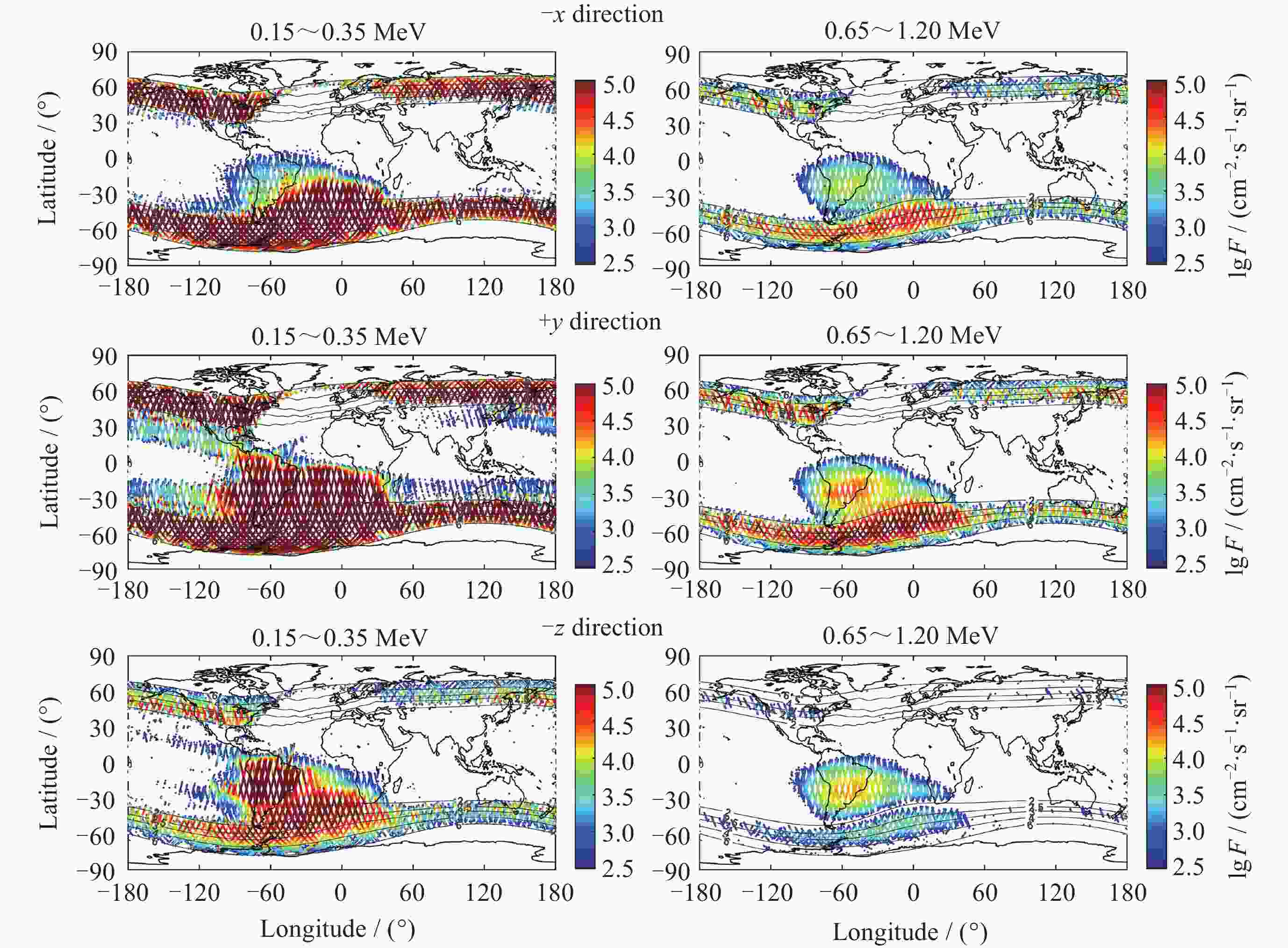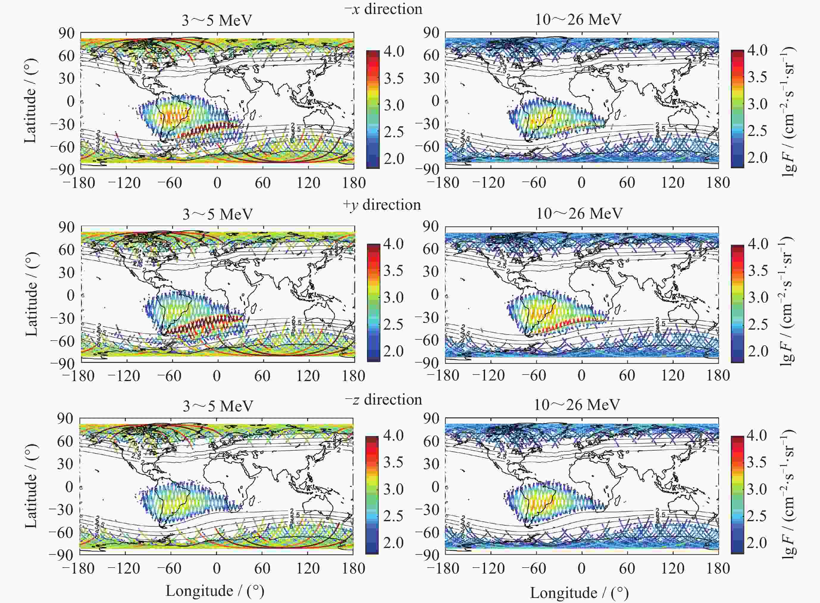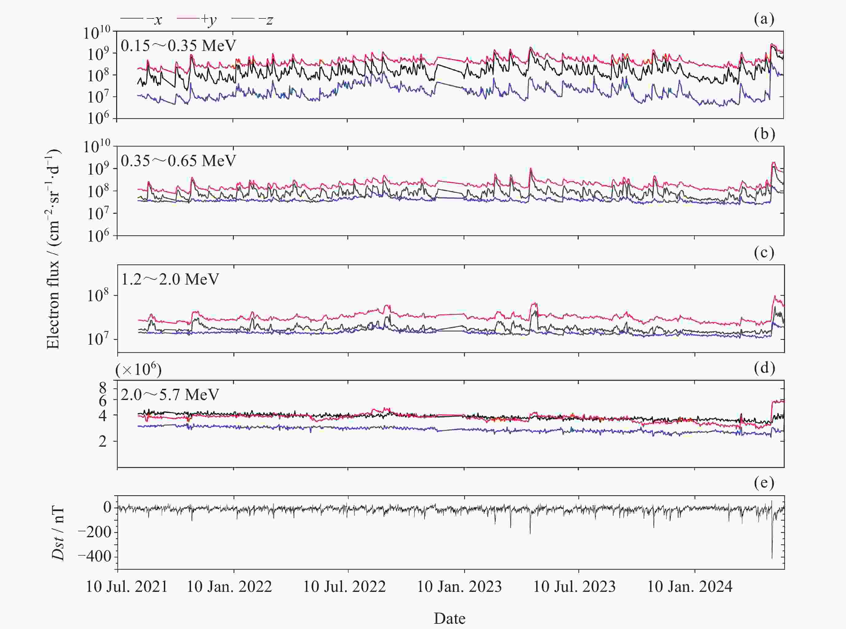 摘要: FY-3E卫星高能粒子探测器开展轨道空间高能电子和高能质子监测, 可获取卫星本体三个方向(–z朝天向、–x飞行反方向和+y垂直轨道面方向) 0.15~5.7 MeV的高能电子和 3~300 MeV的高能质子数据. 通过分析高能粒子探测器2021年7月至2024年5月高能质子、高能电子探测数据, 得到卫星本体三个方向高能质子和高能电子空间分布区域及长时间演化结果. 研究表明, 能量越低, 分布范围越大, 结构越复杂, 其中较低能量的电子在南北高纬度上呈现出多条带结构; 电子通量强度+y方向的最高, 动态变化最为显著, –z方向反之. 质子则在三个方向上的差异相对较小; 2024年5月的极强地磁暴显著影响到电子和质子的空间分布和通量强度. 数据结果表明, FY-3E高能粒子探测器能够对卫星轨道空间高能粒子动态做出灵敏响应, 探测数据不仅可以支持开展轨道环境评估、航天器辐射防护设计以及星上设备安全布局等, 还有助于辐射带的动态及极端事件研究的深入开展.Abstract: FY-3E satellite is one of the Fengyun-3 polar orbit meteorological satellite series and also the first morning dusk orbit meteorological satellite in China. The satellite orbits at an altitude of about 830 kilometers with an inclination angle of 98.75°. The high-energy particle detector mounted on the satellite is used to monitor the charged particle radiation environment, which can provide 0.15 MeV to 5.7 MeV high-energy electron and 3 MeV to 300 MeV proton flux data in three directions of the satellite body (–z skyward direction, –x flight reverse direction, and +y vertical orbital plane direction). The data of high-energy protons and electrons monitored by the detector from July 2021 to May 2024 are analyzed, and the spatial distribution and long-term evolution results are obtained in the three directions as follows. The lower the energy, the larger the distribution range, and the more complex the structure, especially for energy electrons, which exhibit multiple stripes at both high latitudes of north and south. Among the three directions, the flux intensity of electrons in the +y direction is the highest, and the –z direction is the smallest. The difference of protons in the three directions is relatively small. The +y direction electrons are most significantly affected by environmental disturbances. The extremely strong geomagnetic storm in May 2024 significantly affects the spatial distribution and flux intensity of both electrons and protons. The data results indicate that the high-energy particle detector can respond sensitively to the dynamics of high-energy particles in space. The measured data can not only support the assessment of orbital environment, serve for the design of spacecraft radiation protection and the secure layout of satellite equipment, but also can help to further understand the dynamic physics process of charged particles in radiation belts during disturbances, especially under the influence of extreme events.