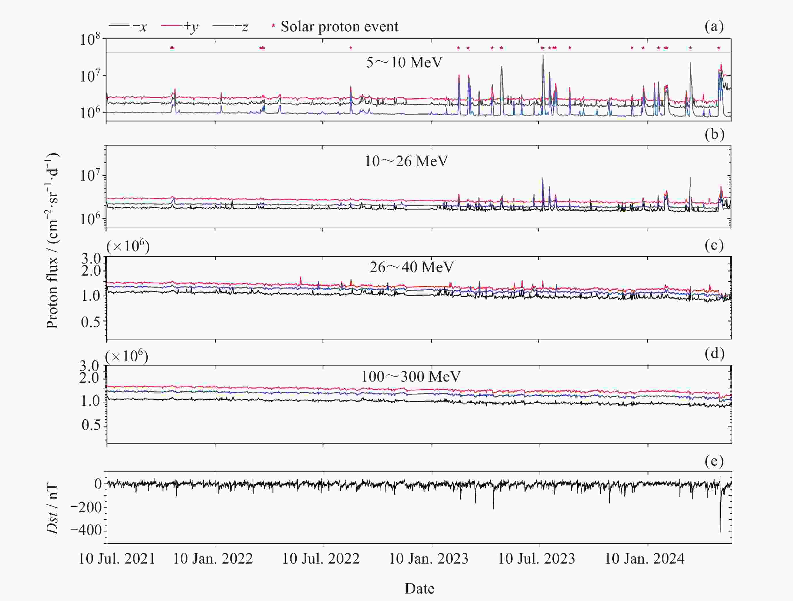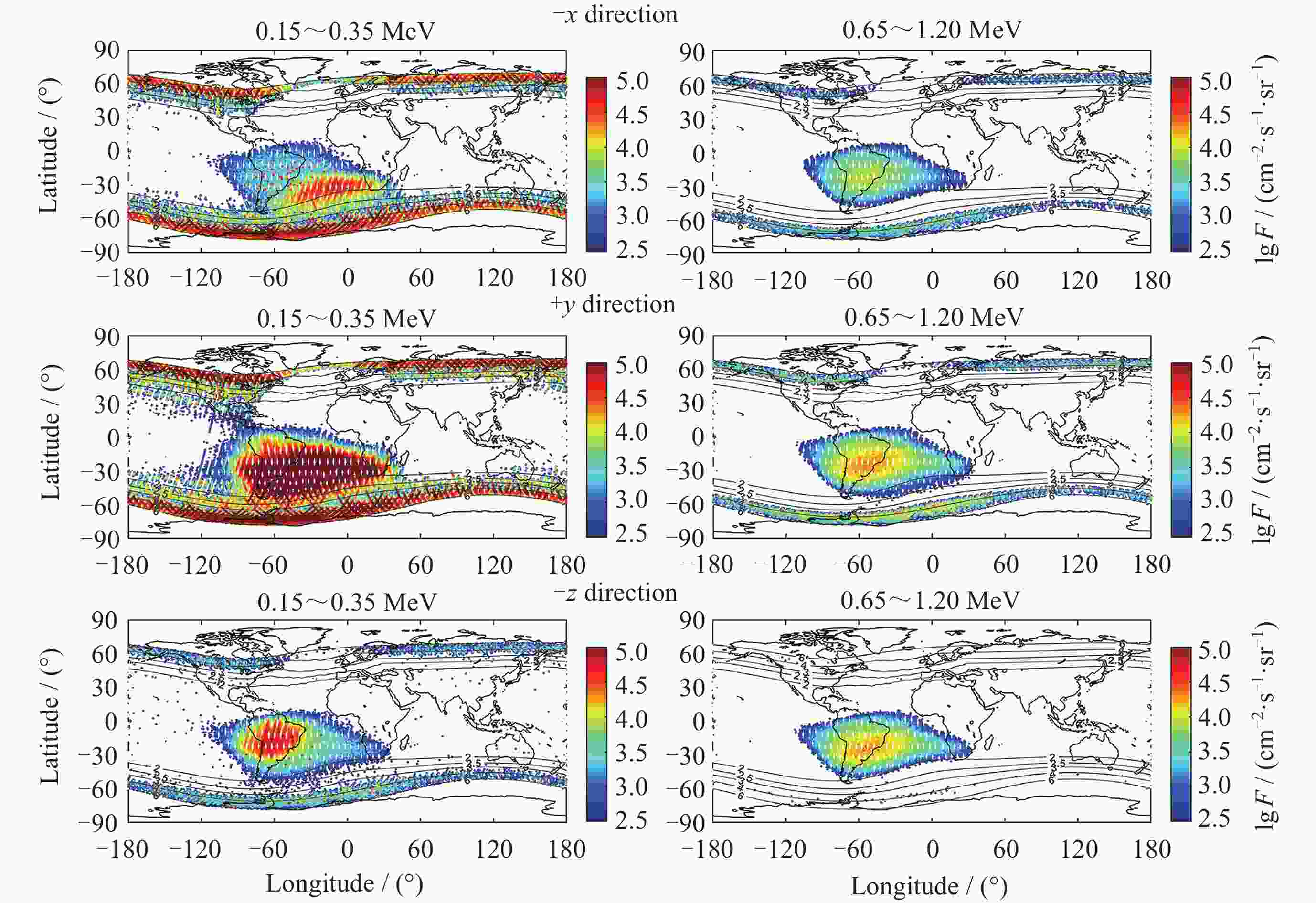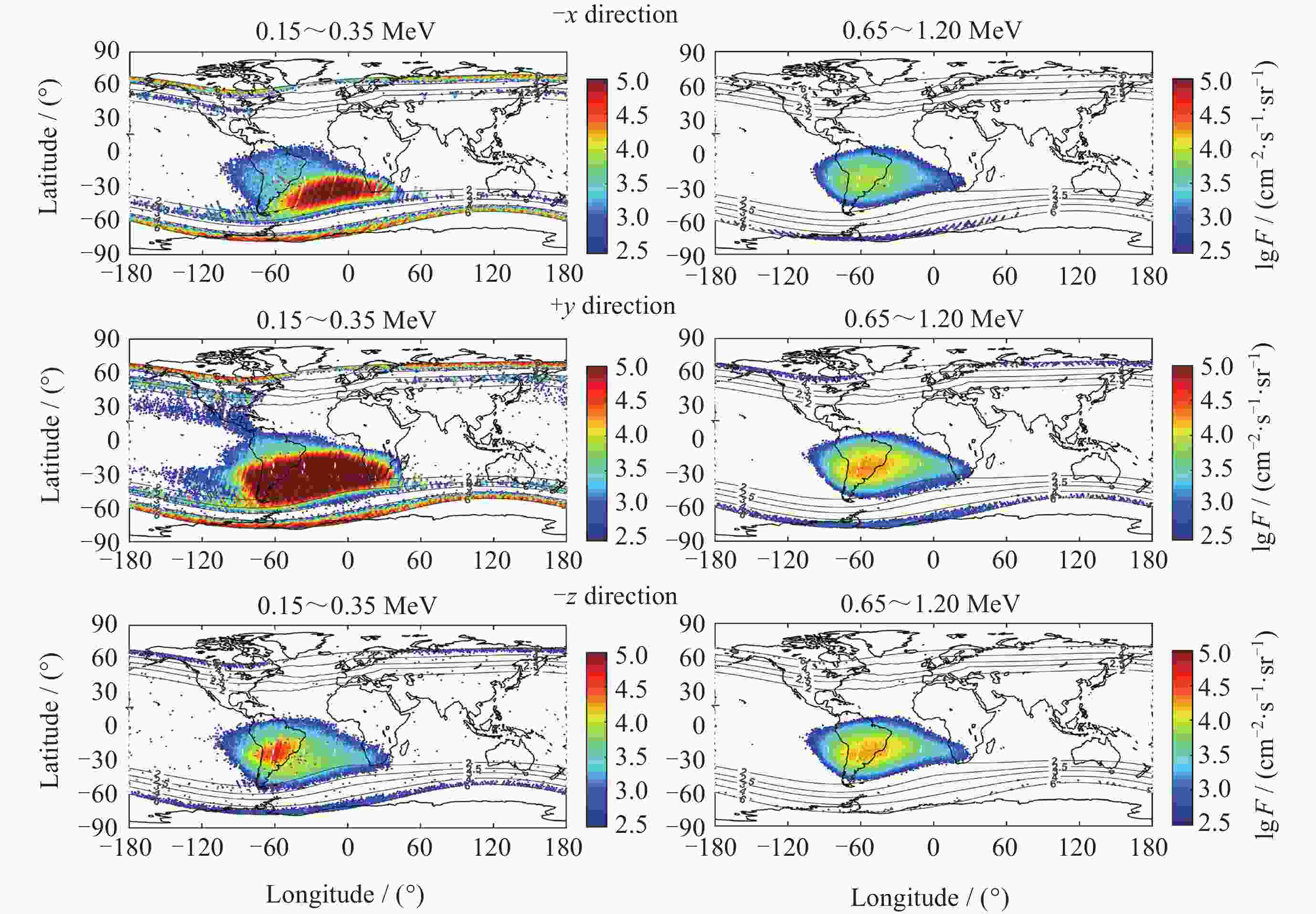 摘要: FY-3E卫星高能粒子探测器开展轨道空间高能电子和高能质子监测, 可获取卫星本体三个方向(–z朝天向、–x飞行反方向和+y垂直轨道面方向) 0.15~5.7 MeV的高能电子和 3~300 MeV的高能质子数据. 通过分析高能粒子探测器2021年7月至2024年5月高能质子、高能电子探测数据, 得到卫星本体三个方向高能质子和高能电子空间分布区域及长时间演化结果. 研究表明, 能量越低, 分布范围越大, 结构越复杂, 其中较低能量的电子在南北高纬度上呈现出多条带结构; 电子通量强度+y方向的最高, 动态变化最为显著, –z方向反之. 质子则在三个方向上的差异相对较小; 2024年5月的极强地磁暴显著影响到电子和质子的空间分布和通量强度. 数据结果表明, FY-3E高能粒子探测器能够对卫星轨道空间高能粒子动态做出灵敏响应, 探测数据不仅可以支持开展轨道环境评估、航天器辐射防护设计以及星上设备安全布局等, 还有助于辐射带的动态及极端事件研究的深入开展.Abstract: FY-3E satellite is one of the Fengyun-3 polar orbit meteorological satellite series and also the first morning dusk orbit meteorological satellite in China. The satellite orbits at an altitude of about 830 kilometers with an inclination angle of 98.75°. The high-energy particle detector mounted on the satellite is used to monitor the charged particle radiation environment, which can provide 0.15 MeV to 5.7 MeV high-energy electron and 3 MeV to 300 MeV proton flux data in three directions of the satellite body (–z skyward direction, –x flight reverse direction, and +y vertical orbital plane direction). The data of high-energy protons and electrons monitored by the detector from July 2021 to May 2024 are analyzed, and the spatial distribution and long-term evolution results are obtained in the three directions as follows. The lower the energy, the larger the distribution range, and the more complex the structure, especially for energy electrons, which exhibit multiple stripes at both high latitudes of north and south. Among the three directions, the flux intensity of electrons in the +y direction is the highest, and the –z direction is the smallest. The difference of protons in the three directions is relatively small. The +y direction electrons are most significantly affected by environmental disturbances. The extremely strong geomagnetic storm in May 2024 significantly affects the spatial distribution and flux intensity of both electrons and protons. The data results indicate that the high-energy particle detector can respond sensitively to the dynamics of high-energy particles in space. The measured data can not only support the assessment of orbital environment, serve for the design of spacecraft radiation protection and the secure layout of satellite equipment, but also can help to further understand the dynamic physics process of charged particles in radiation belts during disturbances, especially under the influence of extreme events.