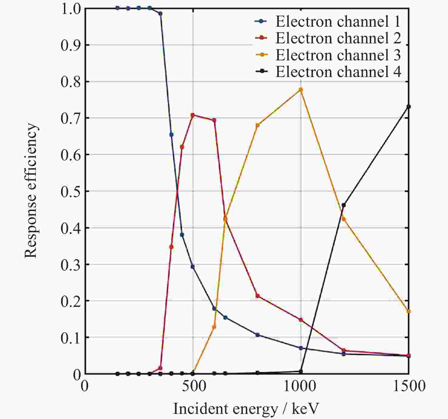 能谱 能量范围/MeV 逻辑工作方式 P1 3~5 $ {\mathrm{D}1}_{2.64}\cdot {\overline{\mathrm{D}1}_{4.76}}\cdot {\overline{(\mathrm{D}2+\mathrm{D}3+\mathrm{D}4)}_{2.0}}\cdot {\overline{\mathrm{D}5}}_{0.7} $ P2 5~10 $ {\mathrm{D}1}_{4.76}\cdot {\overline{\mathrm{D}1}_{8.30}}\cdot {\overline{(\mathrm{D}2+\mathrm{D}3+\mathrm{D}4)}_{4.51}}\cdot {\overline{\mathrm{D}5}}_{0.7} $ P3 10~26 $ {{\mathrm{D}1}_{2.00}\cdot (\mathrm{D}2+\mathrm{D}3+\mathrm{D}4)}_{4.51}\cdot {\overline{(\mathrm{D}2+\mathrm{D}3+\mathrm{D}4)}_{25.0}}\cdot {\overline{\mathrm{D}5}}_{0.7} $ P4 26~40 $ {(\mathrm{D}2+\mathrm{D}3+\mathrm{D}4)}_{9.76}\cdot {\overline{(\mathrm{D}2+\mathrm{D}3+\mathrm{D}4)}_{25.0}}\cdot {\mathrm{D}5}_{0.7} $ P5 40~100 $ {(\mathrm{D}2+\mathrm{D}3+\mathrm{D}4)}_{4.33}\cdot {\overline{(\mathrm{D}2+\mathrm{D}3+\mathrm{D}4)}_{9.77}}\cdot {\mathrm{D}5}_{0.7} $ P6 100~300 $ {(\mathrm{D}2+\mathrm{D}3+\mathrm{D}4)}_{2.08}\cdot {\overline{(\mathrm{D}2+\mathrm{D}3+\mathrm{D}4)}_{4.33}}\cdot {\mathrm{D}5}_{0.7} $ 表 3 电子探头逻辑工作方式
