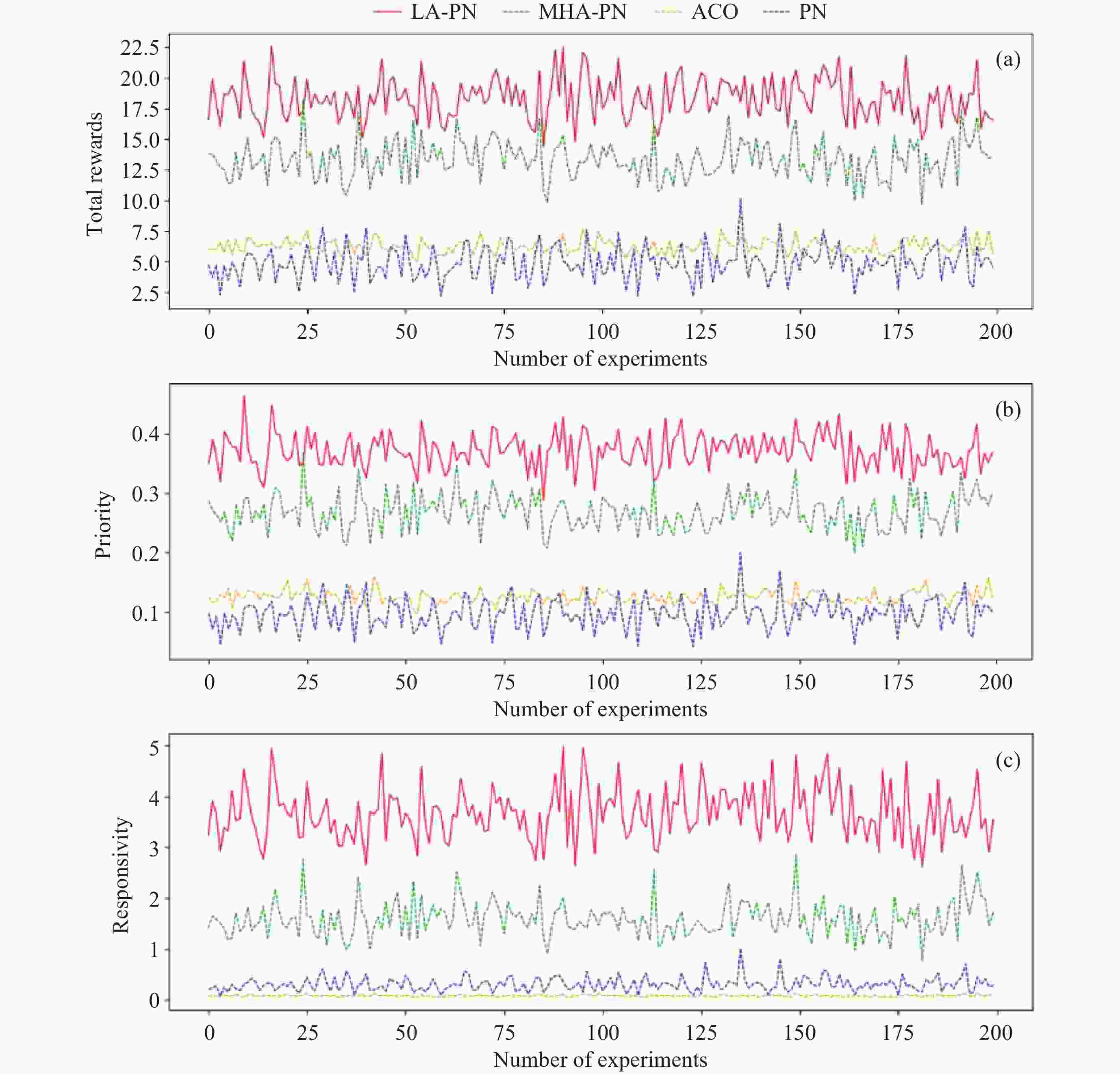 算法 $ T/(\mathrm{s} \cdot {\mathrm{e}\mathrm{p}\mathrm{o}\mathrm{c}\mathrm{h}}^{-1}) $ $ {R}_{\mathrm{r}\mathrm{a}\mathrm{t}\mathrm{e}}/(\mathrm{\%}) $ LA-PN 0.396318 — PN 0.308217 273.83 MHA-PN 0.297375 37.21 ACO 13.027278 192.80 -