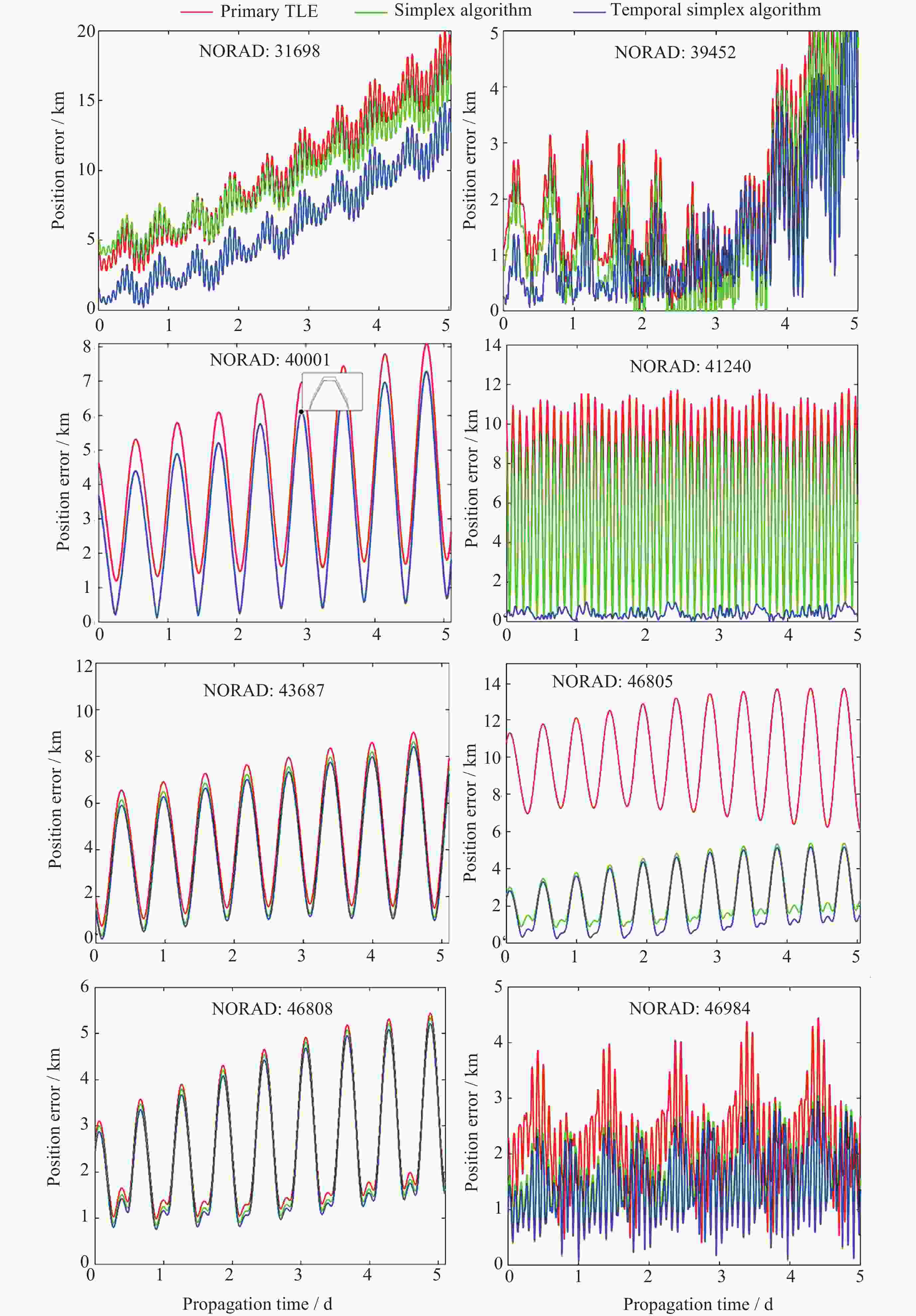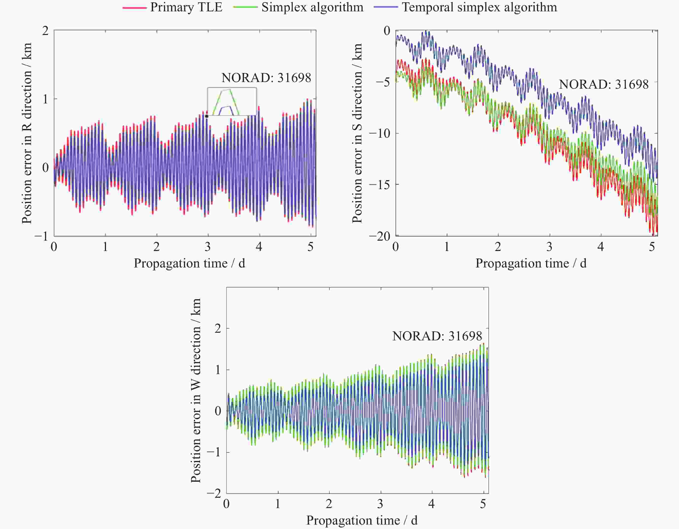 NORAD 原始TLE历元数 异常TLE历元数 TLE历元使用率/(%) 31698 29 3 89.65 39452 22 0 100 40001 17 0 100 41240 18 0 100 43687 17 2 88.23 46805 16 0 100 46808 15 2 86.67 46984 31 4 87.09 表 3 目标31698定轨轨道根数对比