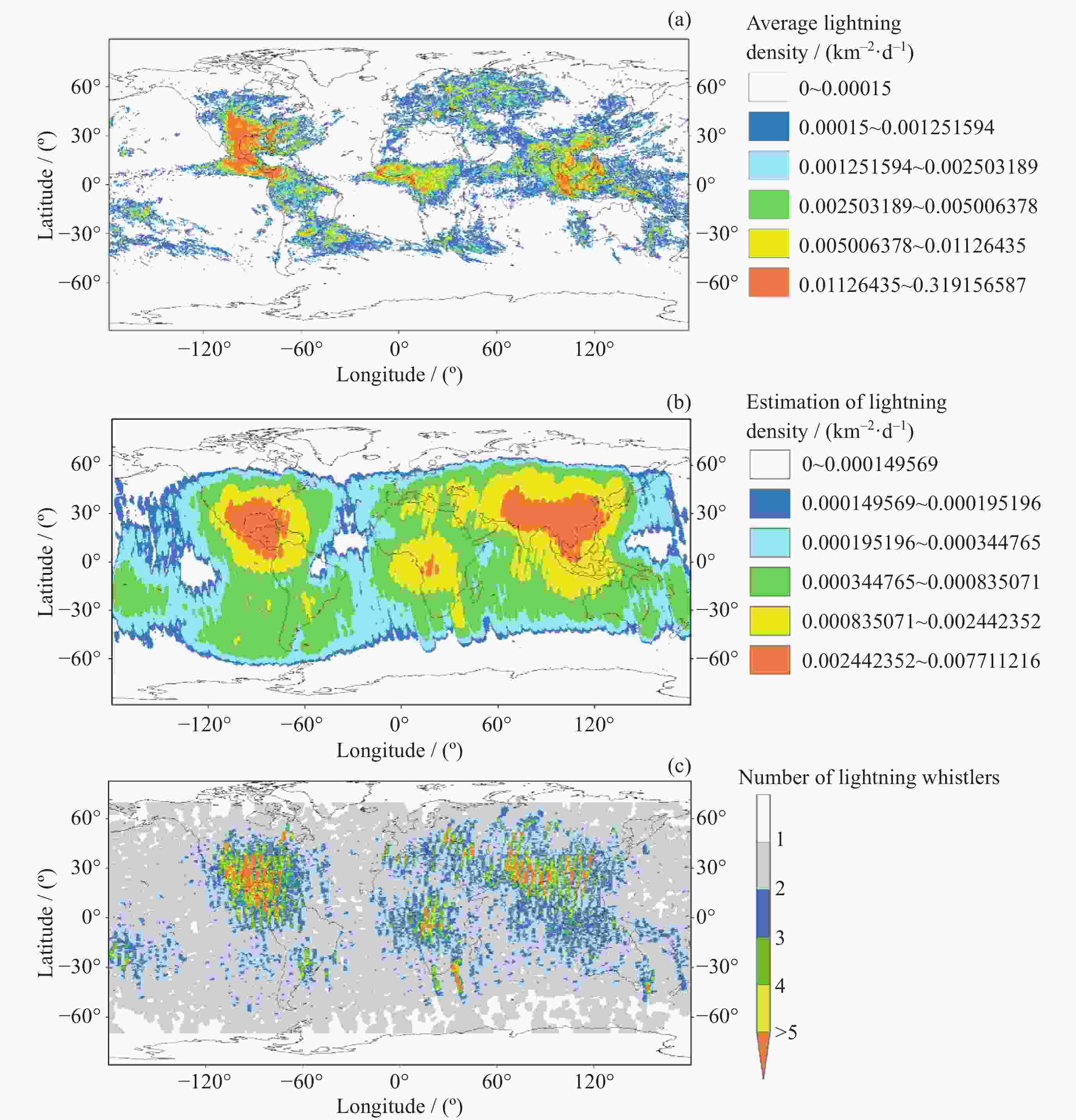 图 8 模型实际应用情况. (a) WGLC在2020年5月份的平均闪电密度, (b) WhisNet模型自动检测张衡卫星LW的密度估计, (c) Kriging插值法