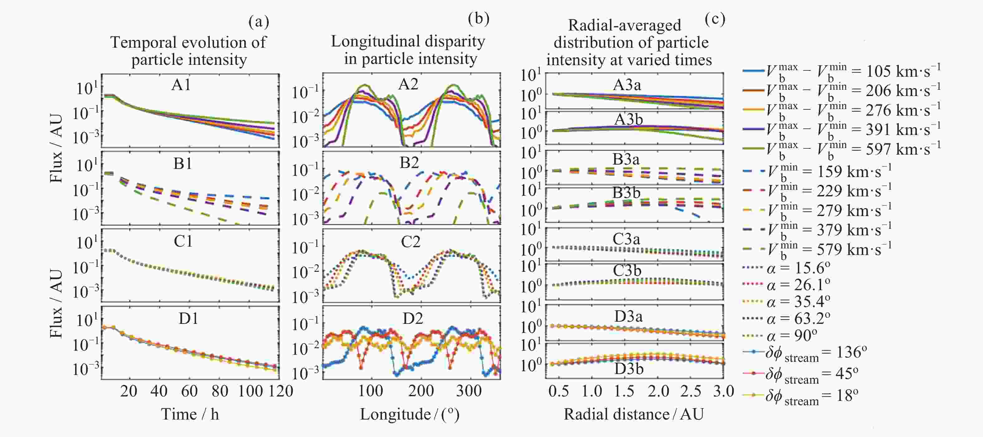 图 11 不同太阳风参数对粒子通量的影响. (a)在未压缩太阳风条件下具有两个不同背景场和太阳风参数的全向通量, (b)在压缩区域具有两个不同背景场和太阳风参数的全方位通量[16]
