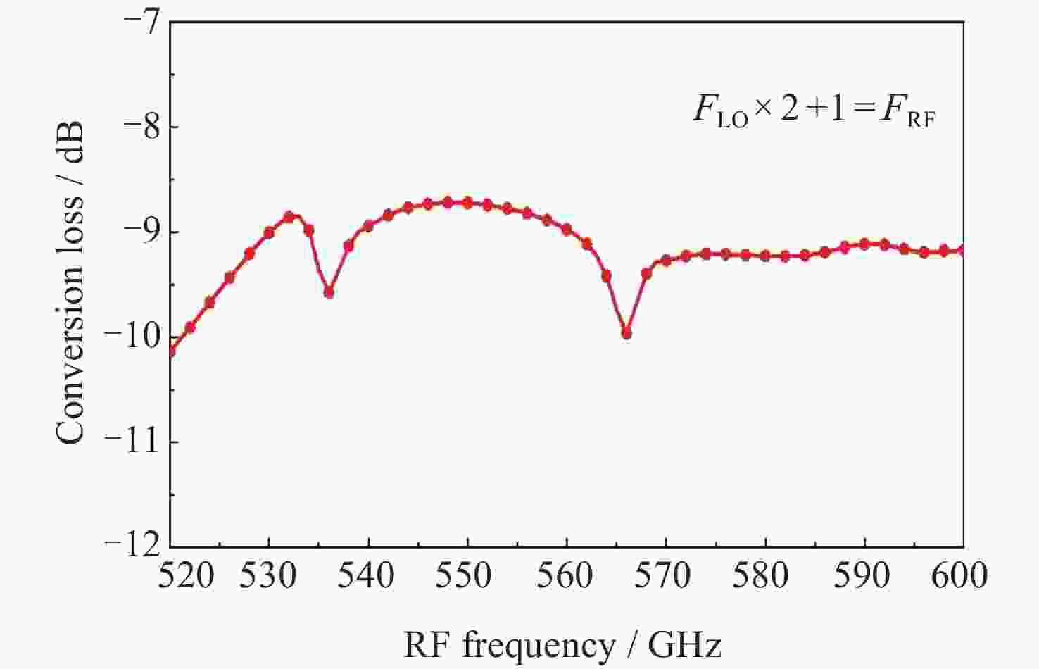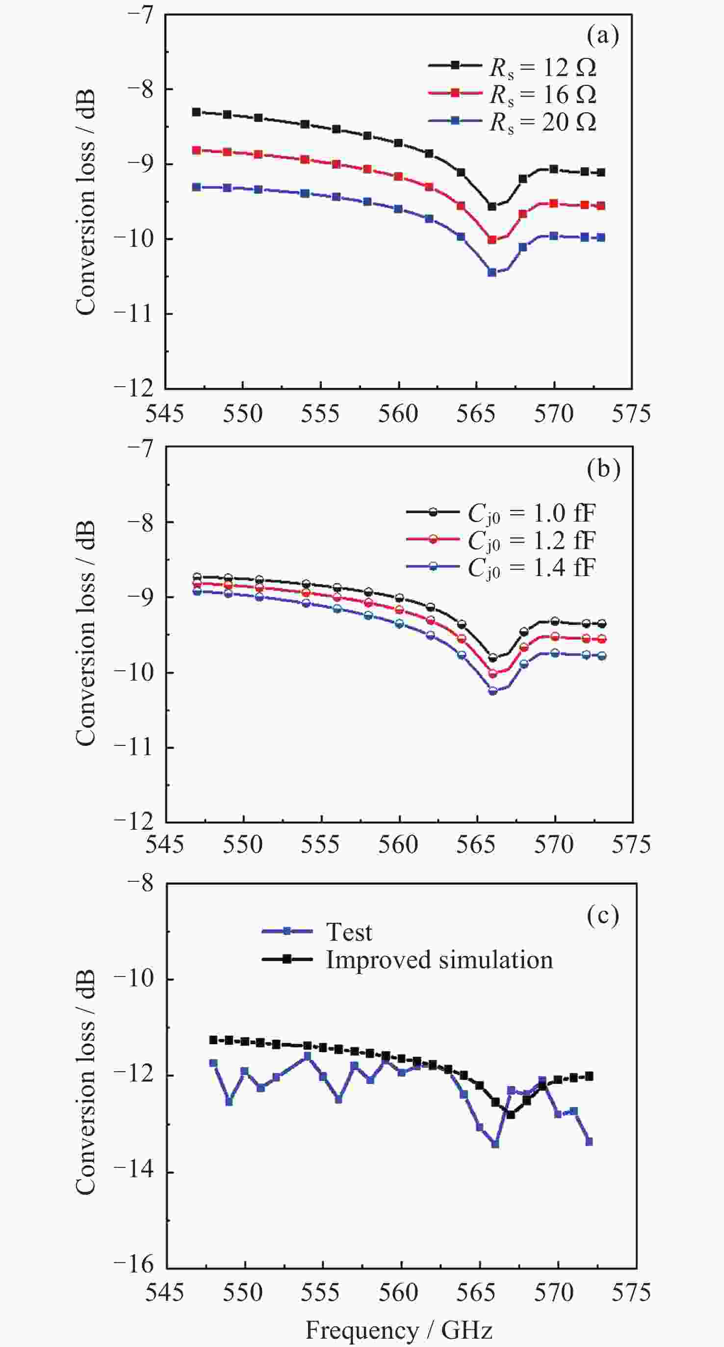 Ref. Frequency/GHz CL/dB Technology [4] 557 5.3~6.7 (DSB) Monolithic integrated [7] 433~451 14~17 (SSB) Hybrid integrated [8] 665~715 <16 (DSB) Hybrid integrated [16] 480~520 10.1~11.5 (DSB) Hybrid integrated [17] 540~580 7.5~9.5 (DSB) Hybrid integrated [18] 654~675 9~11 (DSB) Monolithic integrated [19] 520~590 8~9.5 (DSB) Monolithic integrated This work 548~572 11.7~13.4 (SSB) Monolithic integrated 注 SSB (Single Sideband)为单边带变频损耗, DSB (Double Sideband)为双边带变频损耗. -