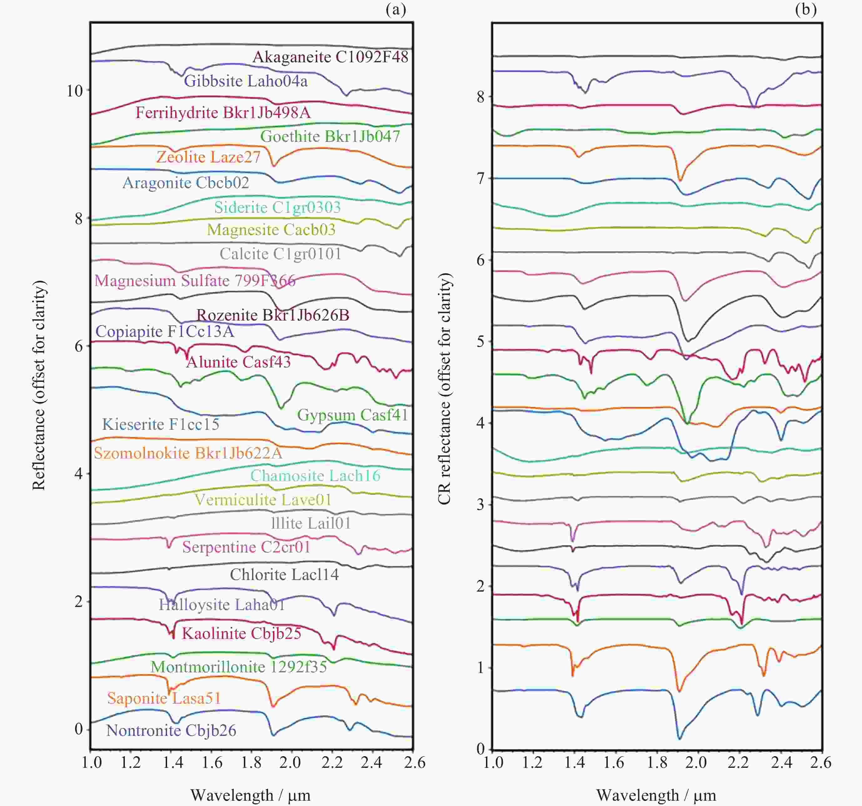 图 3 常见含水矿物吸收特征随波长的变化. 矩形代表吸收特征, 绿色垂线表示吸收中心, 矩形颜色表示吸收深度, 矩形宽度代表吸收深度最大值一半对应的宽度. 黑色、蓝色、绿色、棕色和红色字体分别表示层状硅酸盐、硫酸盐、碳酸盐、其他水合硅酸盐和氢氧化物