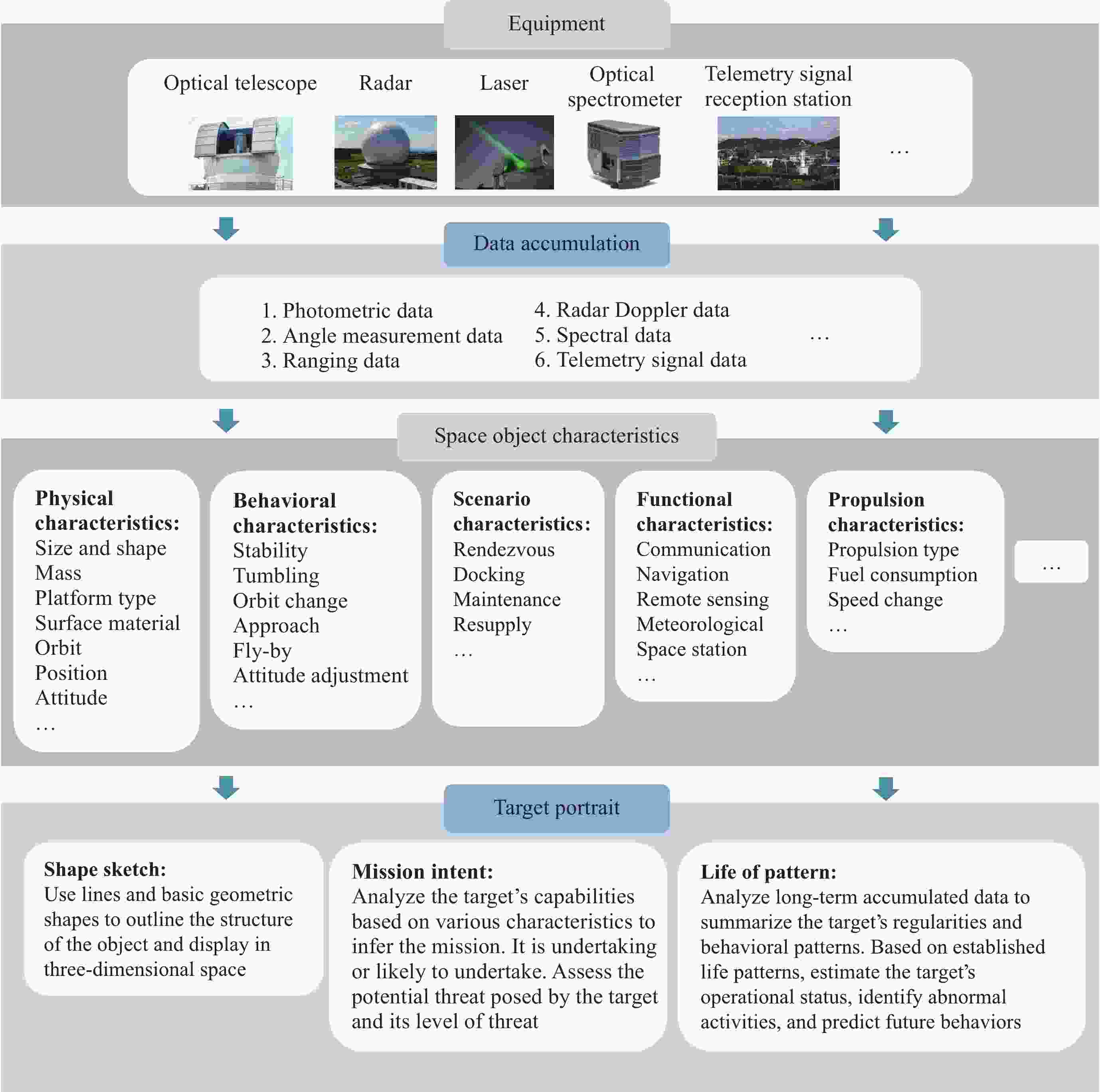 目标特性 光学 雷达 红外 遥测信号 目标测量特性 位置 是 是 是 是 速度 是 是 是 是 目标物理特性 尺寸 ― 是 ― ― 质量 ― 支持 ― ― 平台类型 是 支持 ― ― 目标旋转特性 旋转速度 是 是 是 ― 旋转轴 是 是 是 ― 目标推进特性 推进类型 生命模式 生命模式 生命模式 ― 可用燃料 支持 ― ― ― 速度变化 生命模式 生命模式 生命模式 ― 目标电量特性 电能产生 ― ― 支持 ― 电能消耗 ― ― 支持 支持 目标其他特性 线框简图 是 是 ― ― 材料成分 是 ― ― ― 热辐射 ― ― 是 ― 任务状态 支持 支持 支持 是 气体排放 ― ― 是 ― -