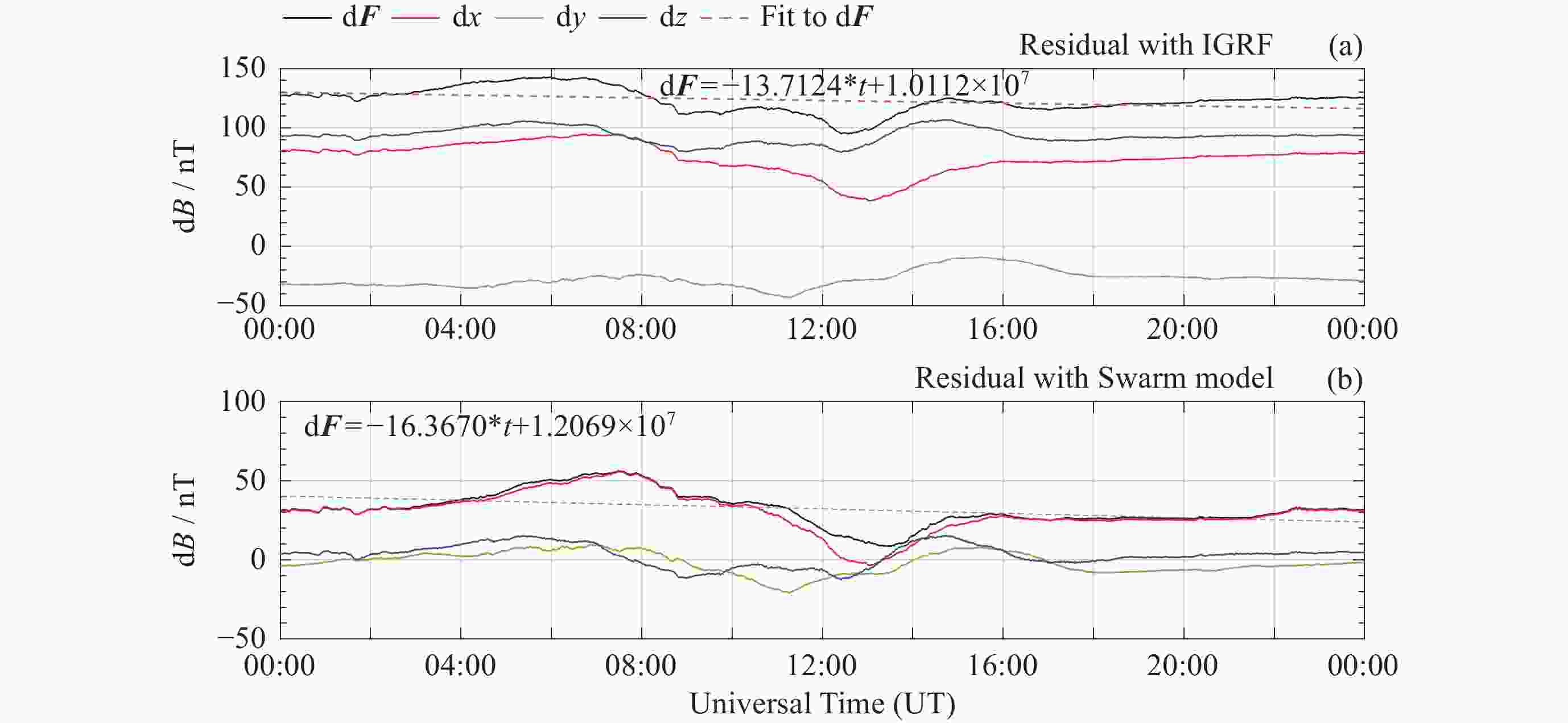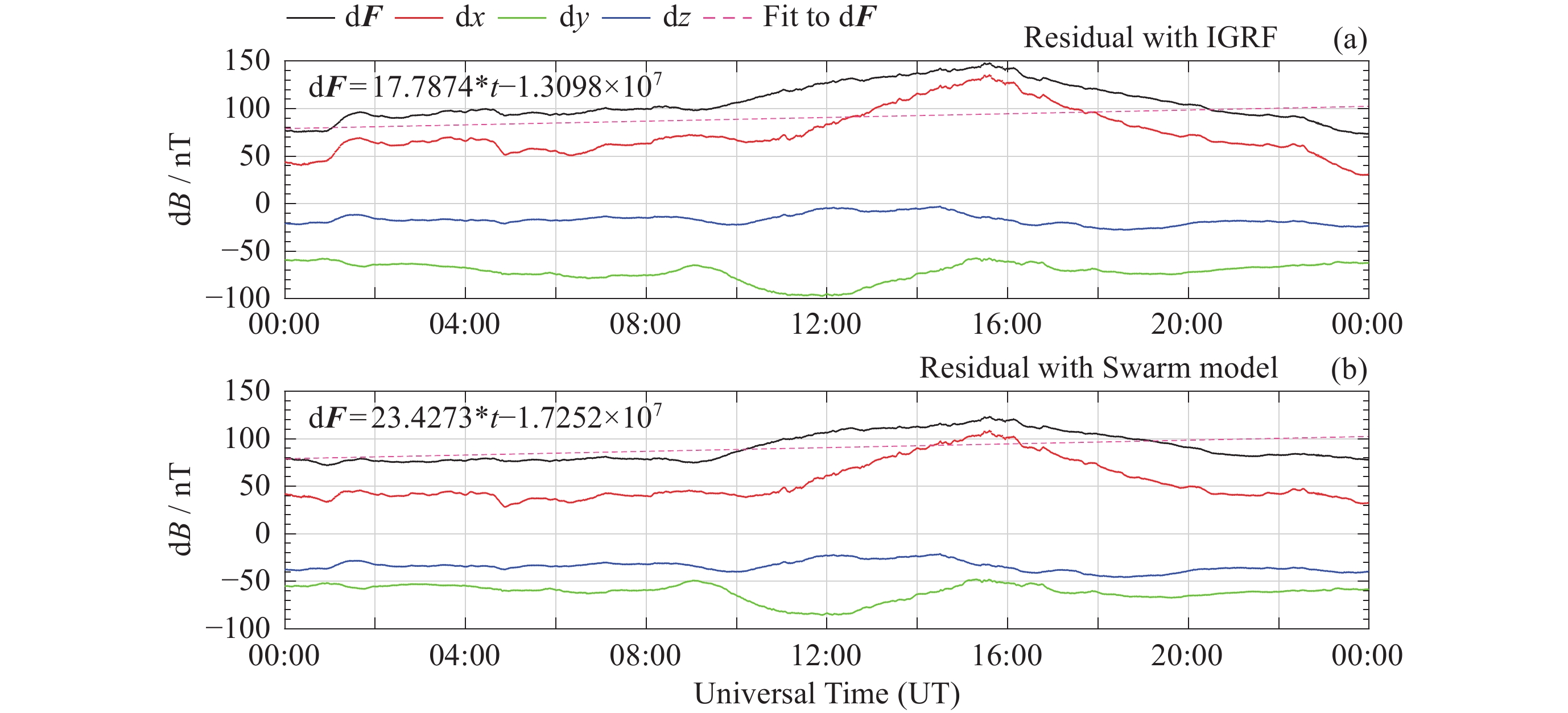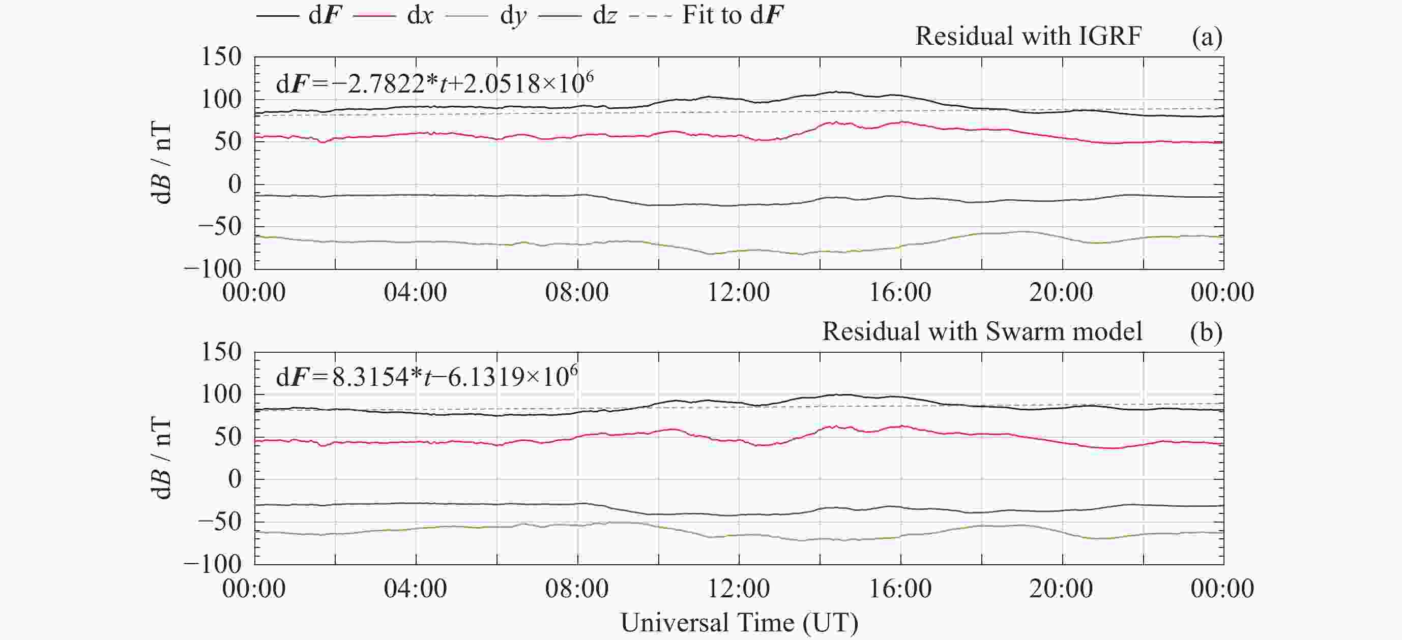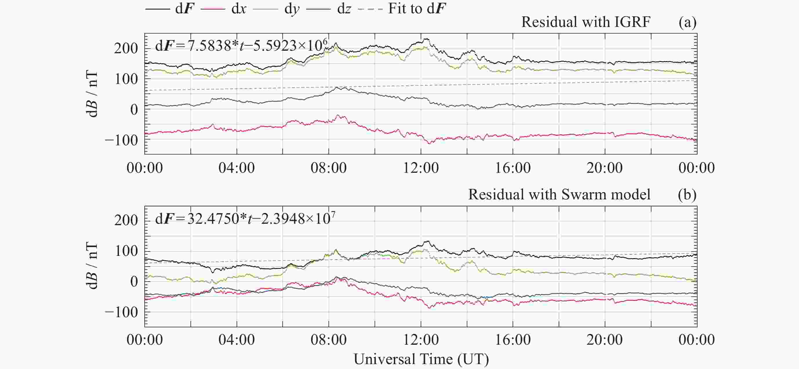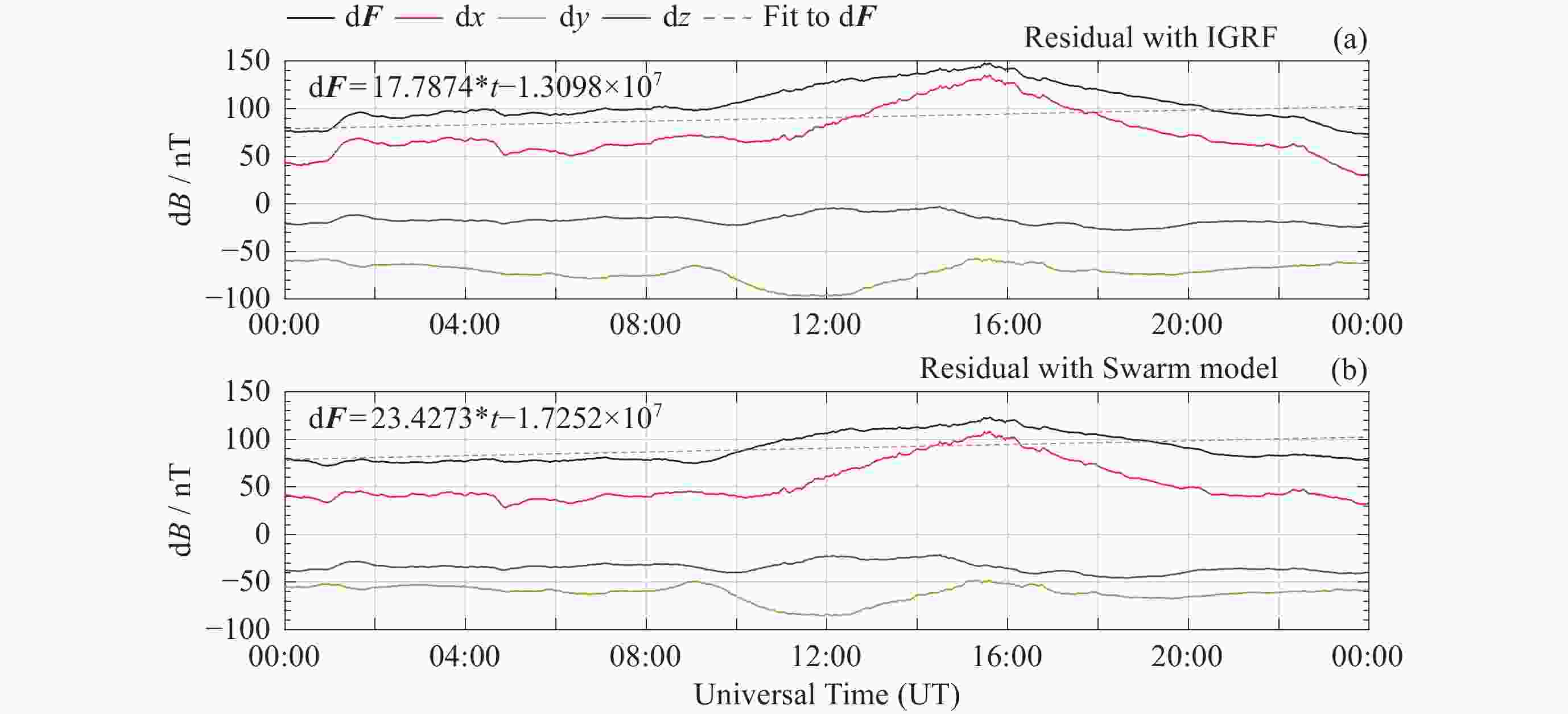 模型 d2F/nT d2x/nT d2y/nT d2z/nT Swarm 55.2609 15.3731 39.9163 –3.8206 IGRF 95.0589 52.9819 52.6998 25.8081 表 3 模型与台站观测值差值的绝对中位差