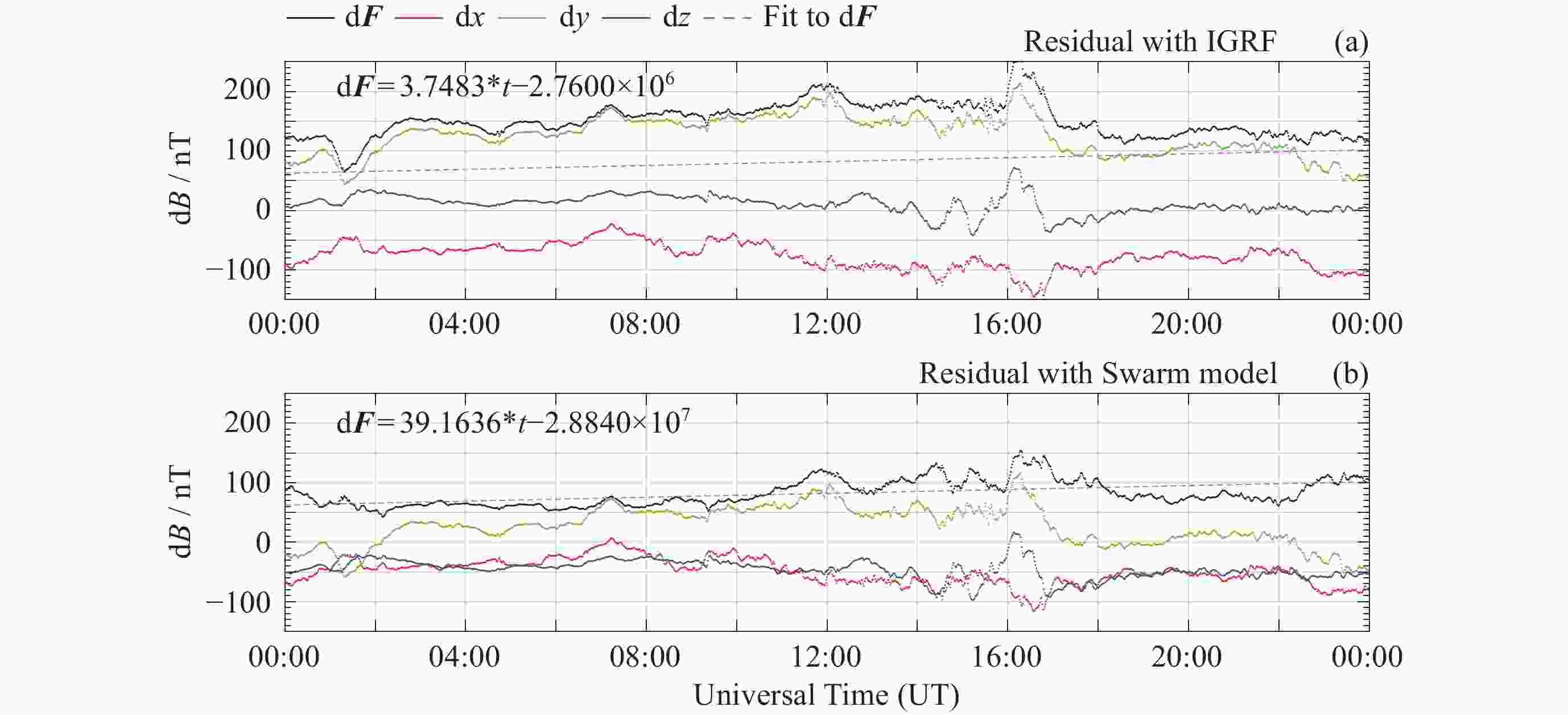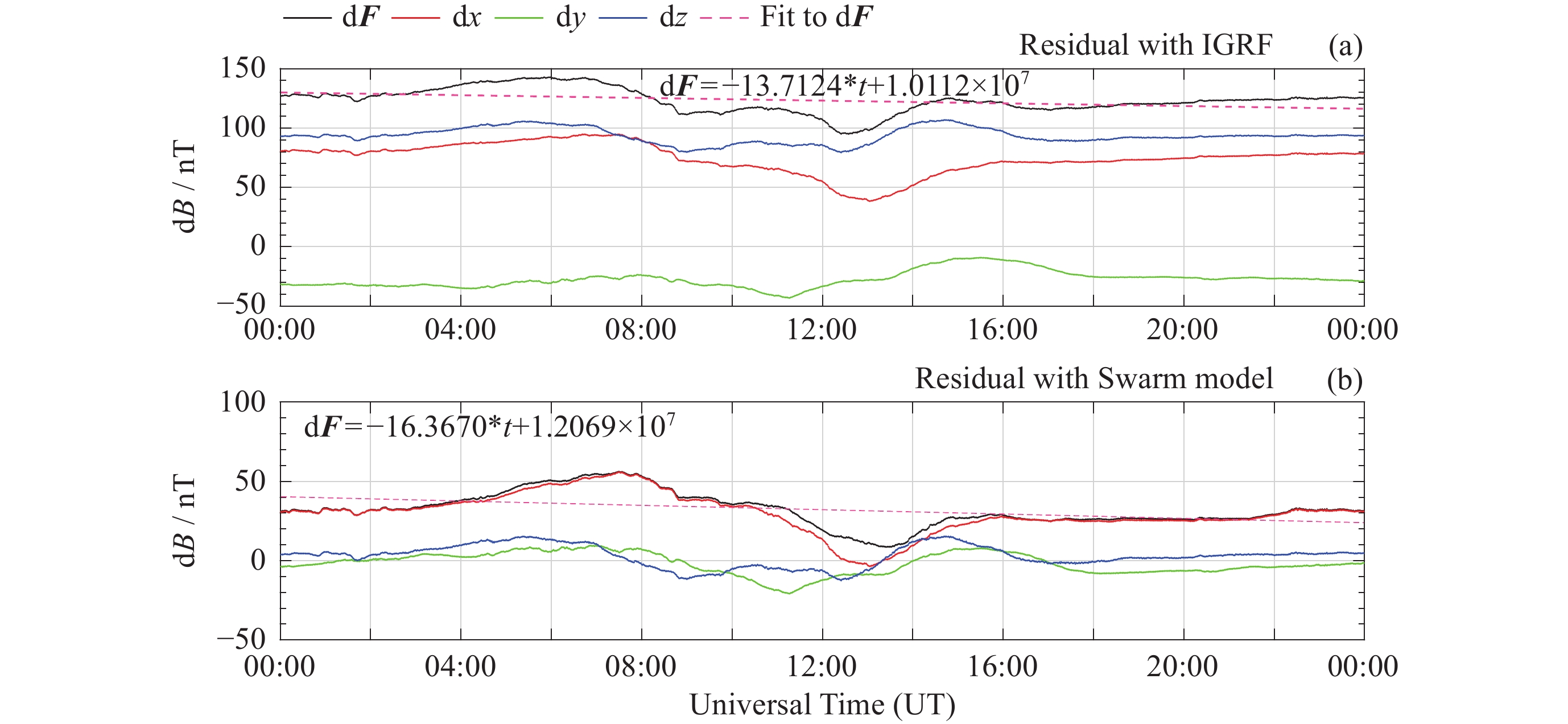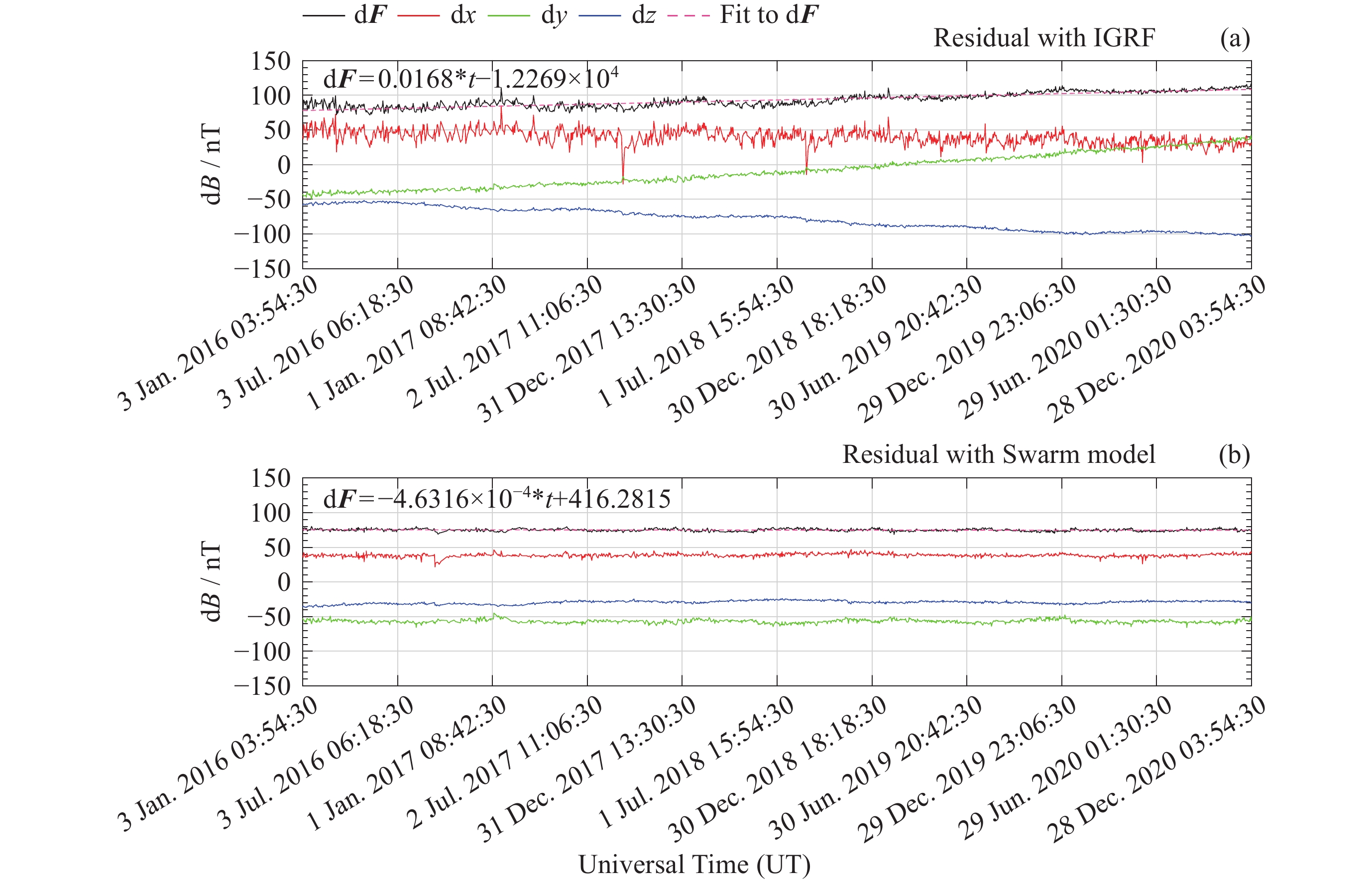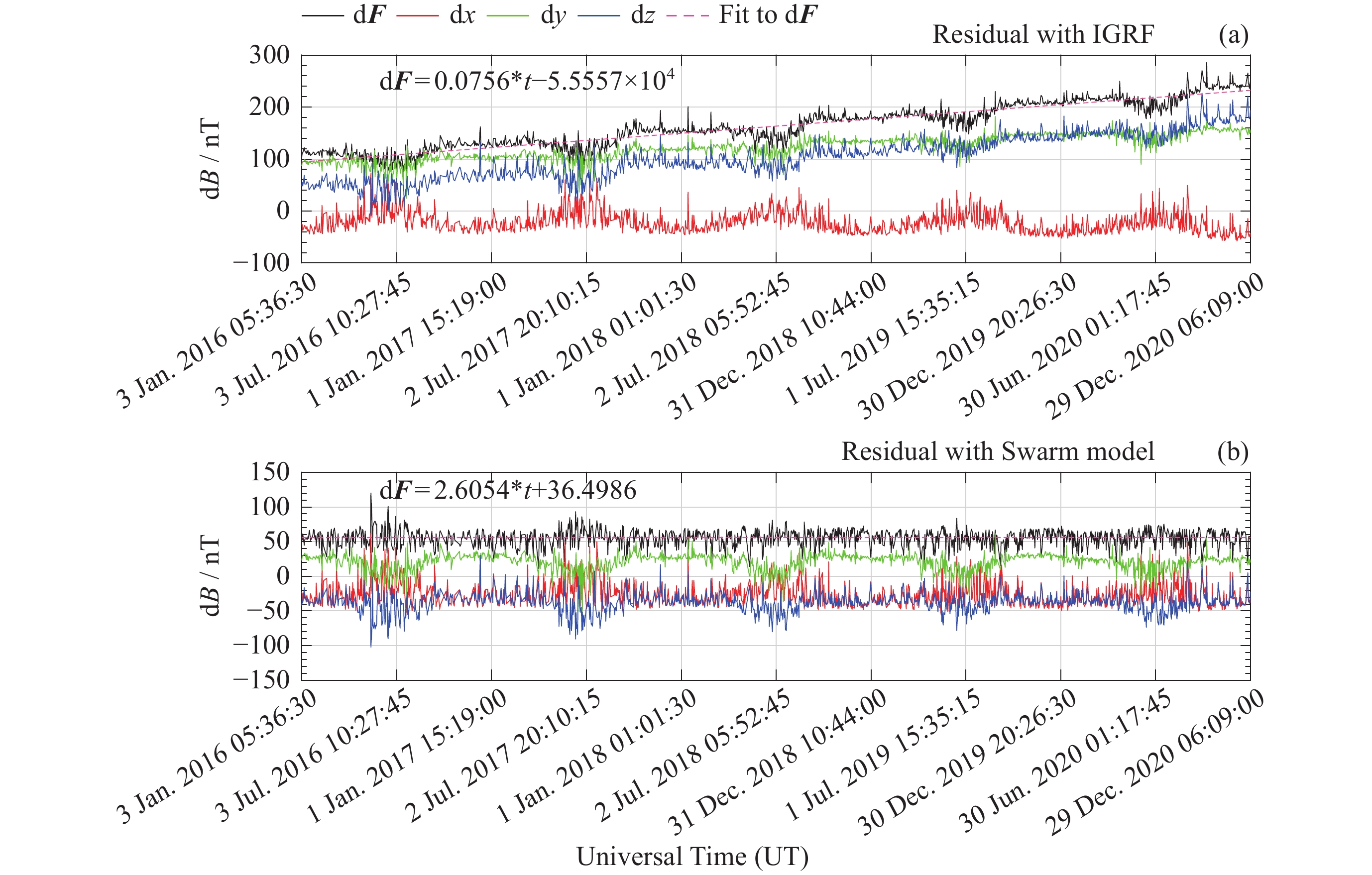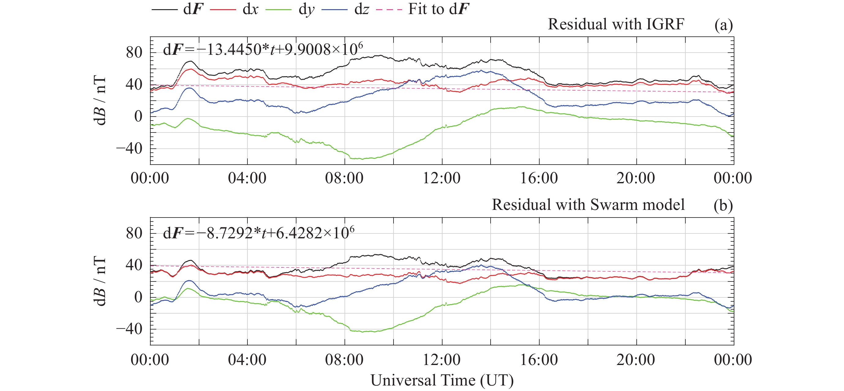 模型 d2F/nT d2x/nT d2y/nT d2z/nT Swarm 55.2609 15.3731 39.9163 –3.8206 IGRF 95.0589 52.9819 52.6998 25.8081 表 3 模型与台站观测值差值的绝对中位差