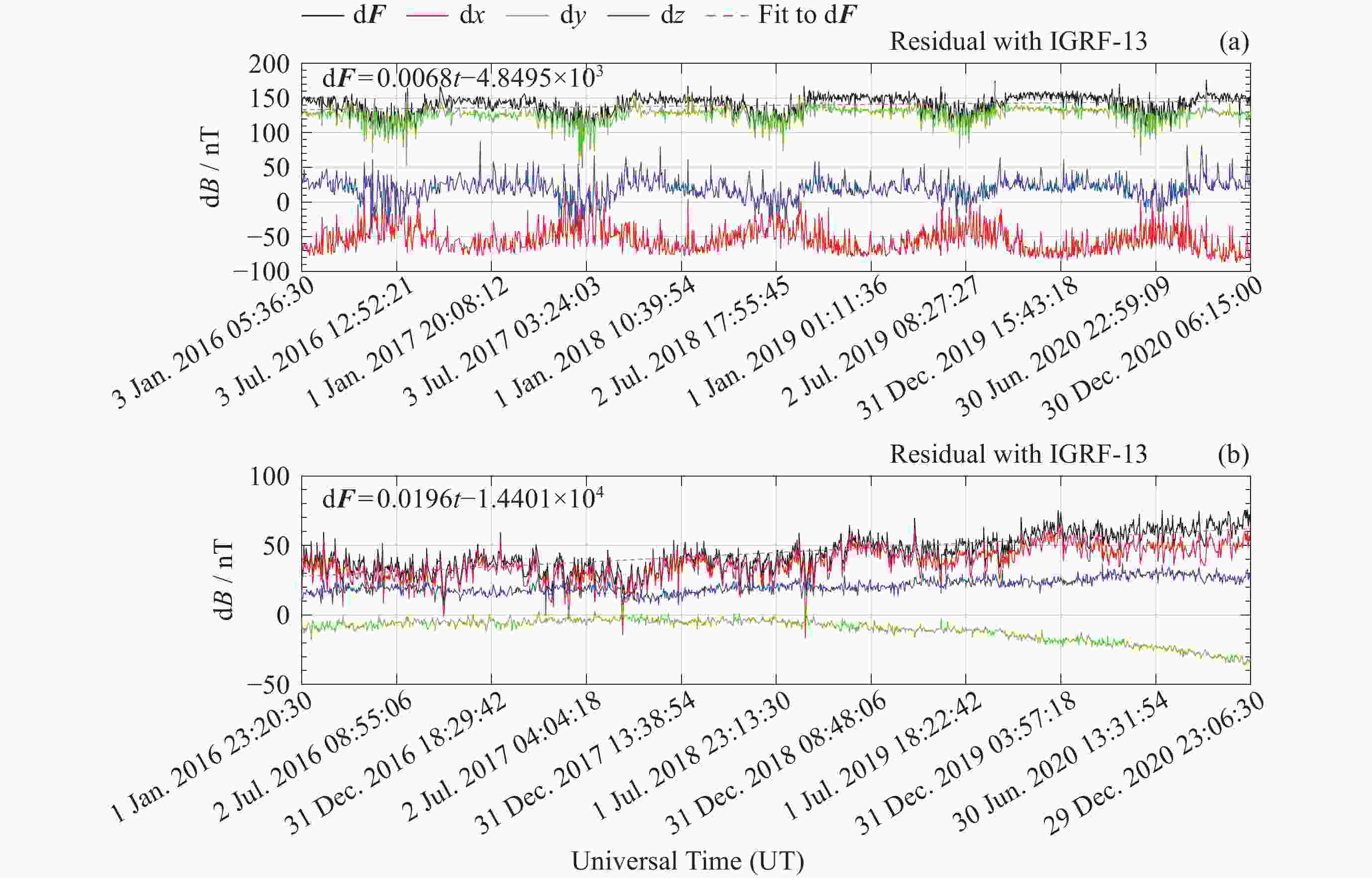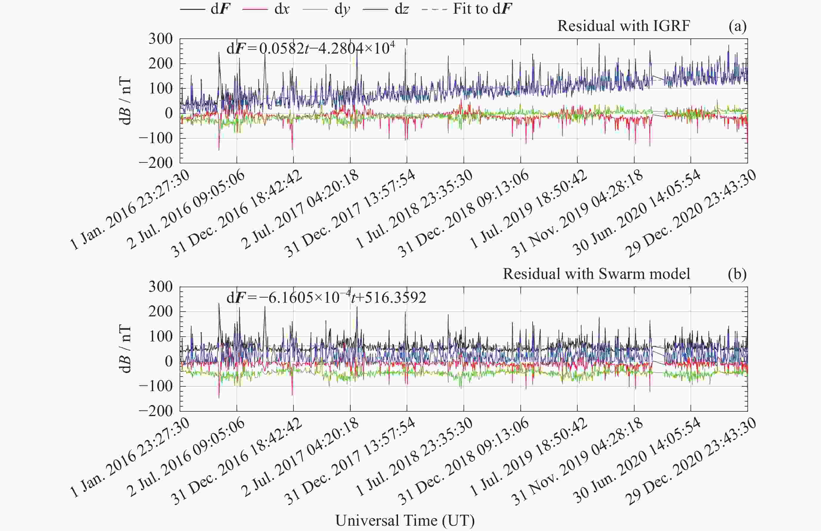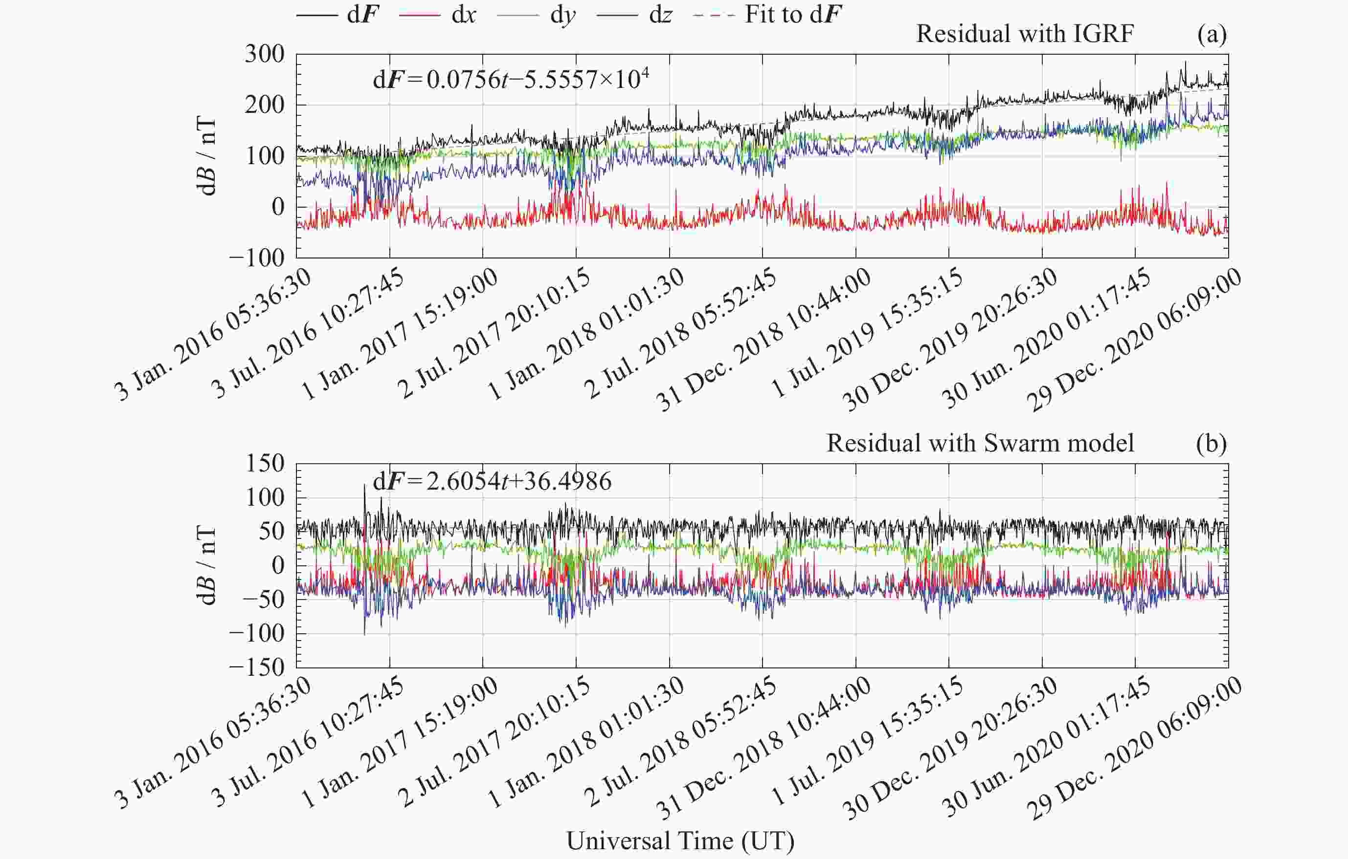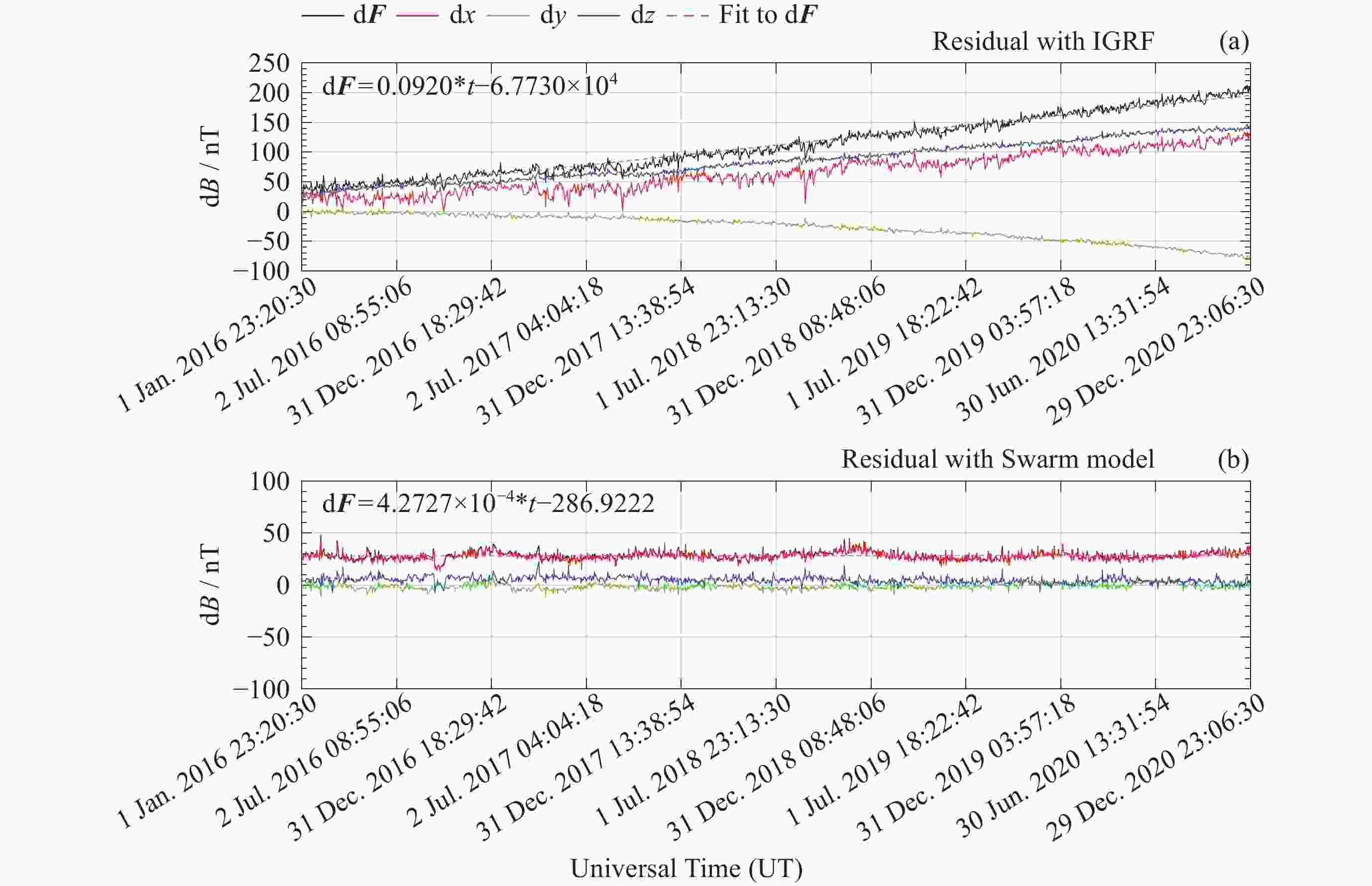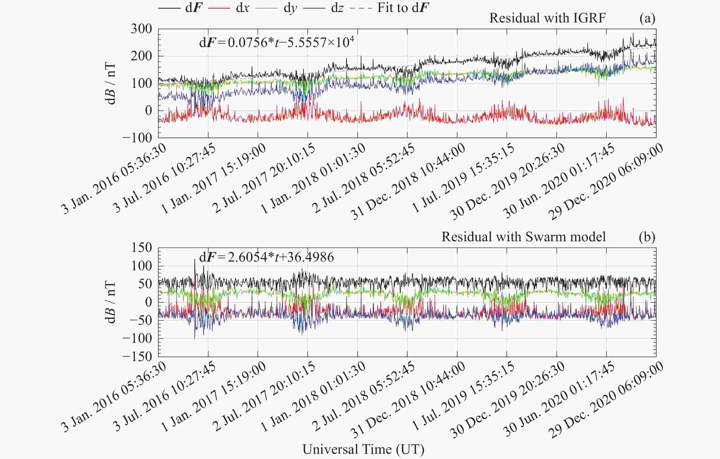 模型 d2F/nT d2x/nT d2y/nT d2z/nT Swarm 55.2609 15.3731 39.9163 –3.8206 IGRF 95.0589 52.9819 52.6998 25.8081 表 3 模型与台站观测值差值的绝对中位差