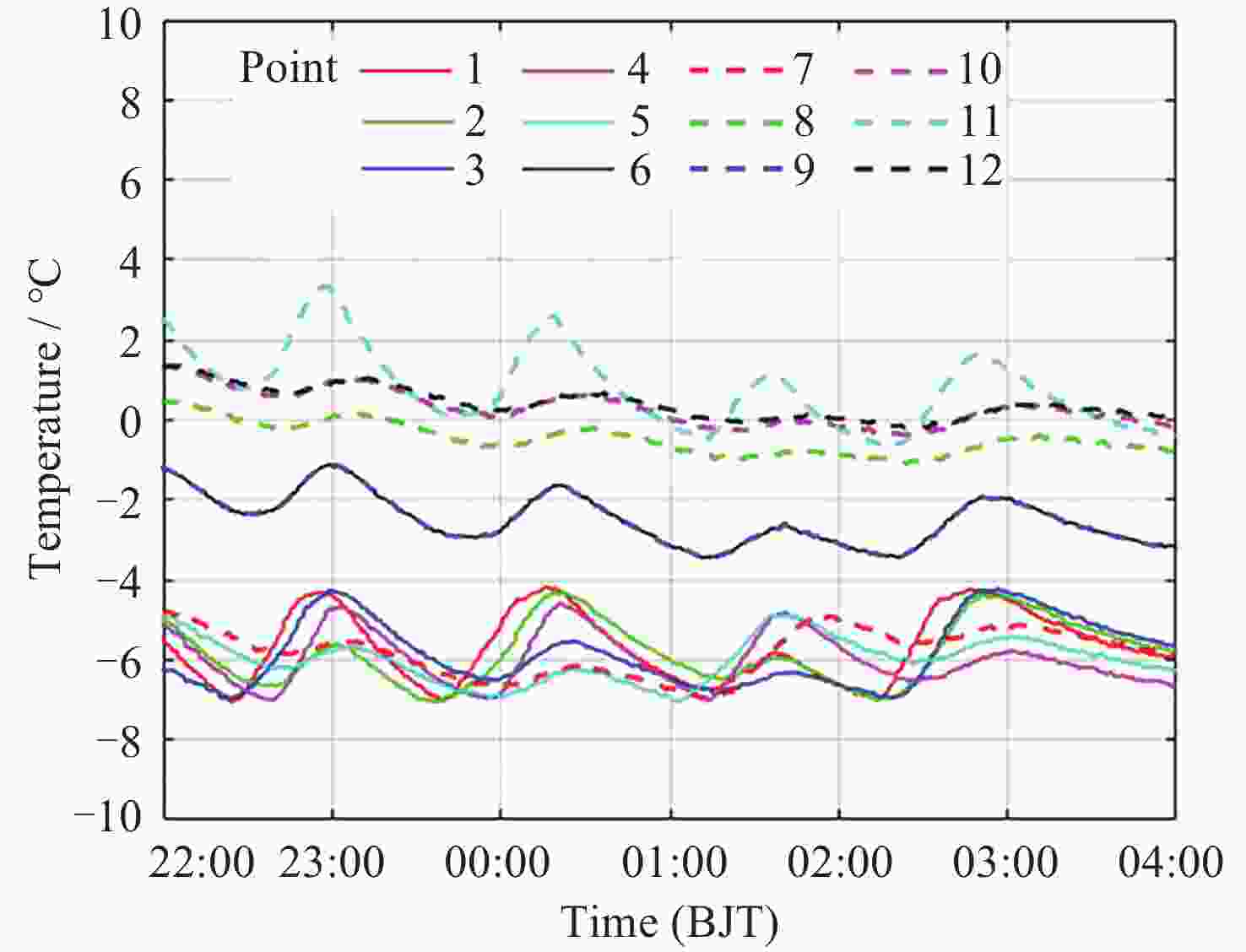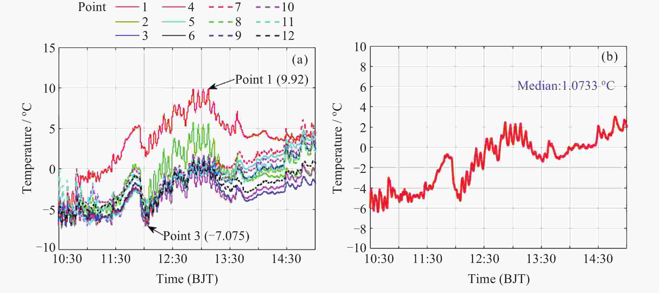 图 10 日冕仪指向太阳后镜筒各测温点的温度变化曲线. (a)日冕仪临近空间观测期间镜筒温度变化曲线, (b)日冕仪临近空间观测期间镜筒平均温度变化曲线