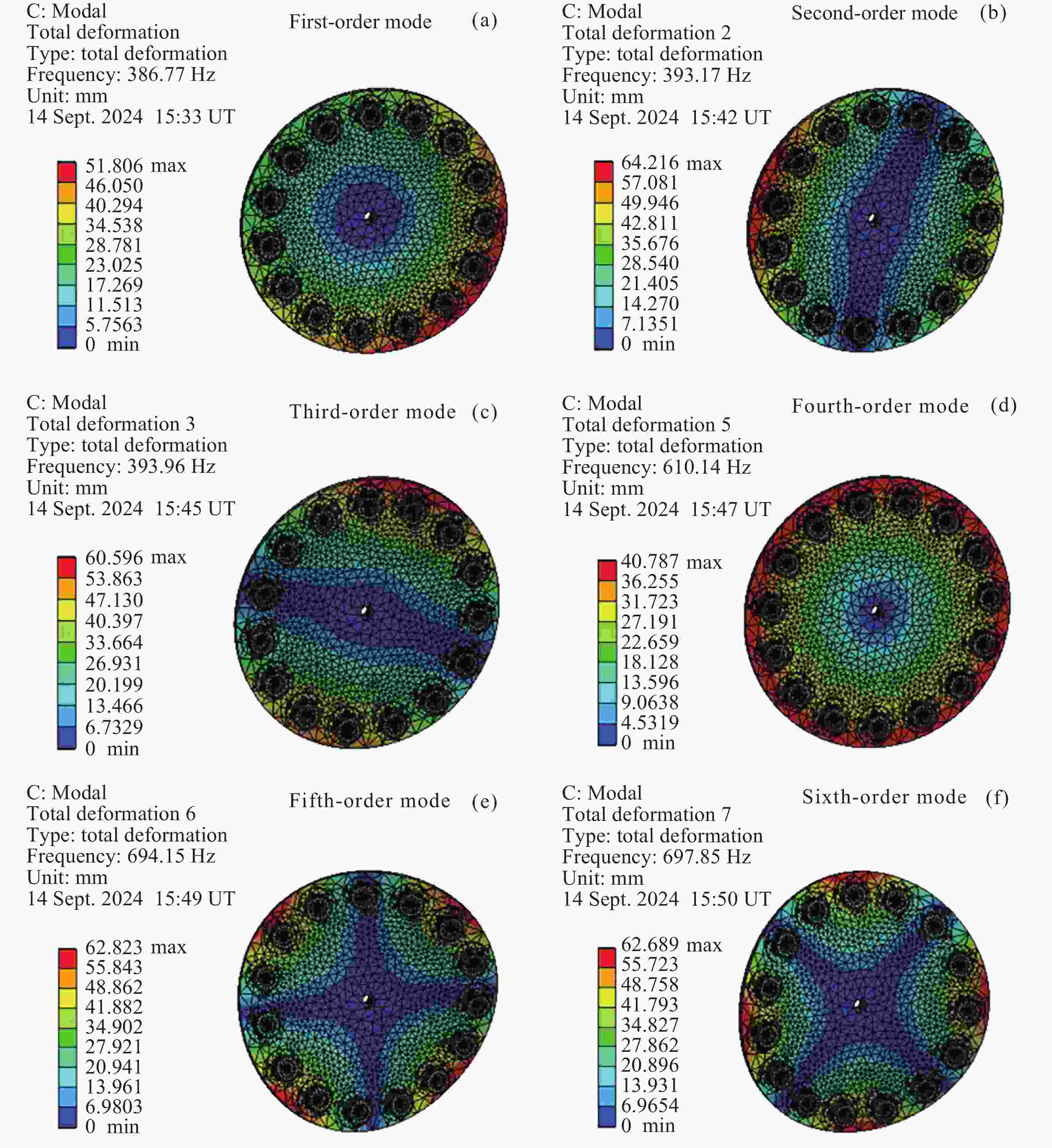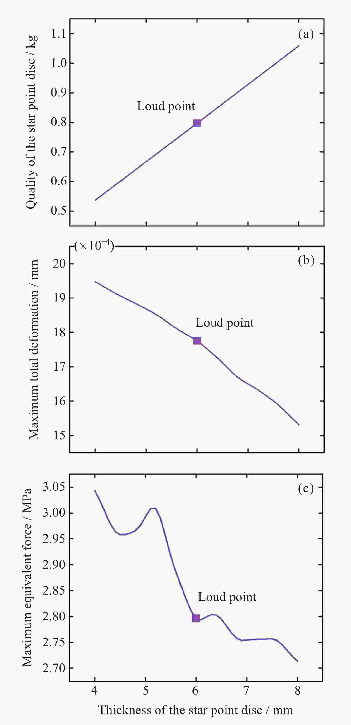 候选点 1 2 3 星点盘厚度/mm 4.3088 4.3321 4.3773 星点盘质量/kg 参数值 0.5773 0.5803 0.5862 与参考值的偏差 –27.56% –27.18% –26.45% 最大总变形/mm 参数值 0.0019208 0.0019188 0.0019151 与参考值的偏差 8.23% 8.12% 7.91% 最大等效应力/MPa 参数值 2.9784 2.9742 2.9673 与参考值的偏差 6.51% 6.36% 6.11% 表 3 优化前后各数值的对比