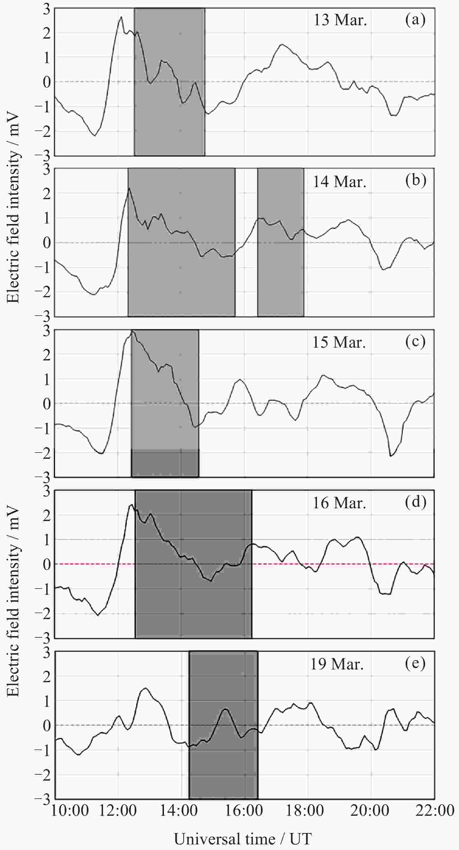 图 10 2015年3月13-16日及3月19日日落前后电离层电场的变化情况 (灰色区域表示当日630 nm气辉成像仪观测到等离子体泡的时段)