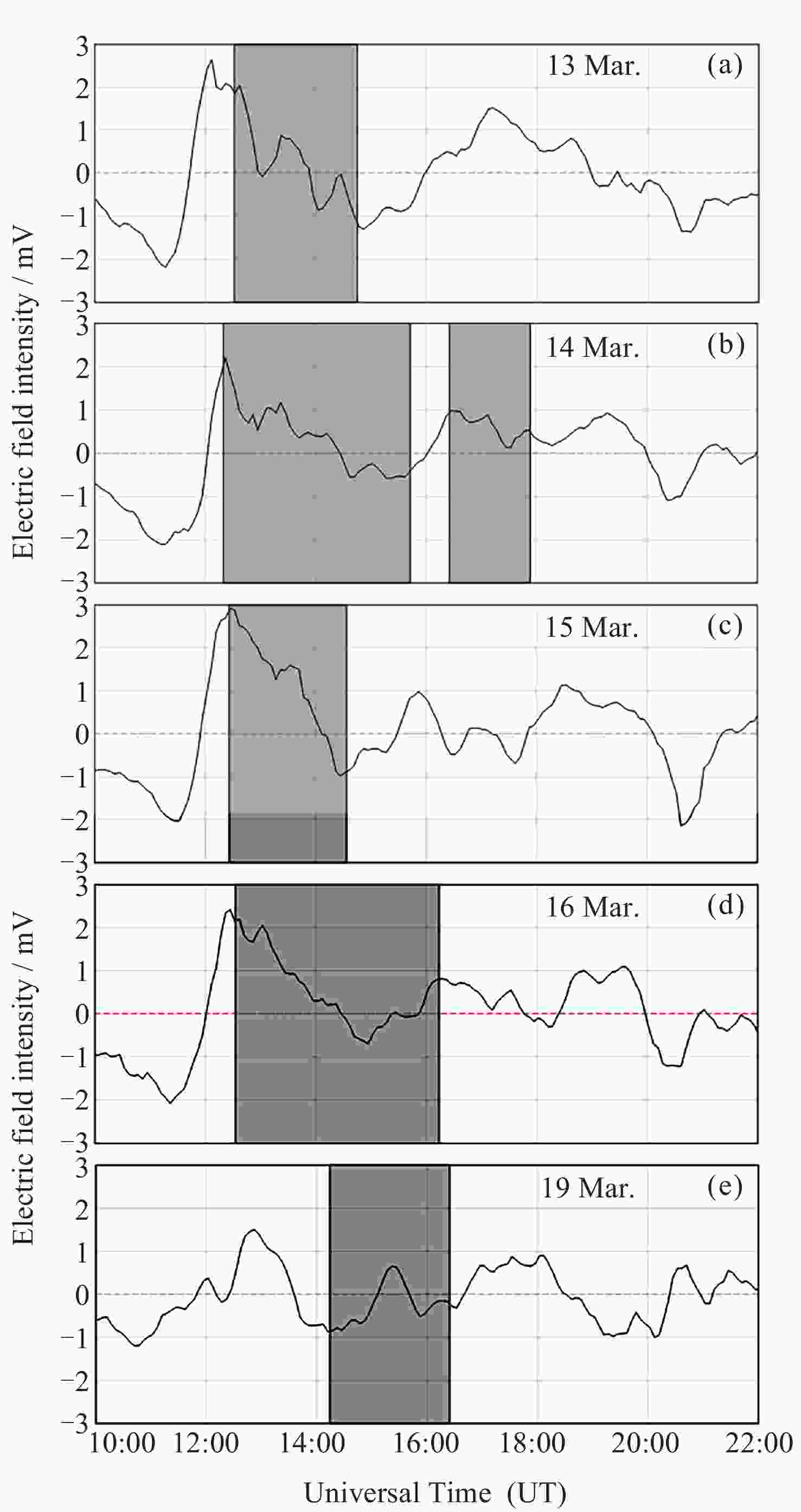 图 10 2015年3月13-16日及3月19日日落前后电离层电场的变化情况 (灰色区域表示当日630 nm气辉成像仪观测到等离子体泡的时段)
