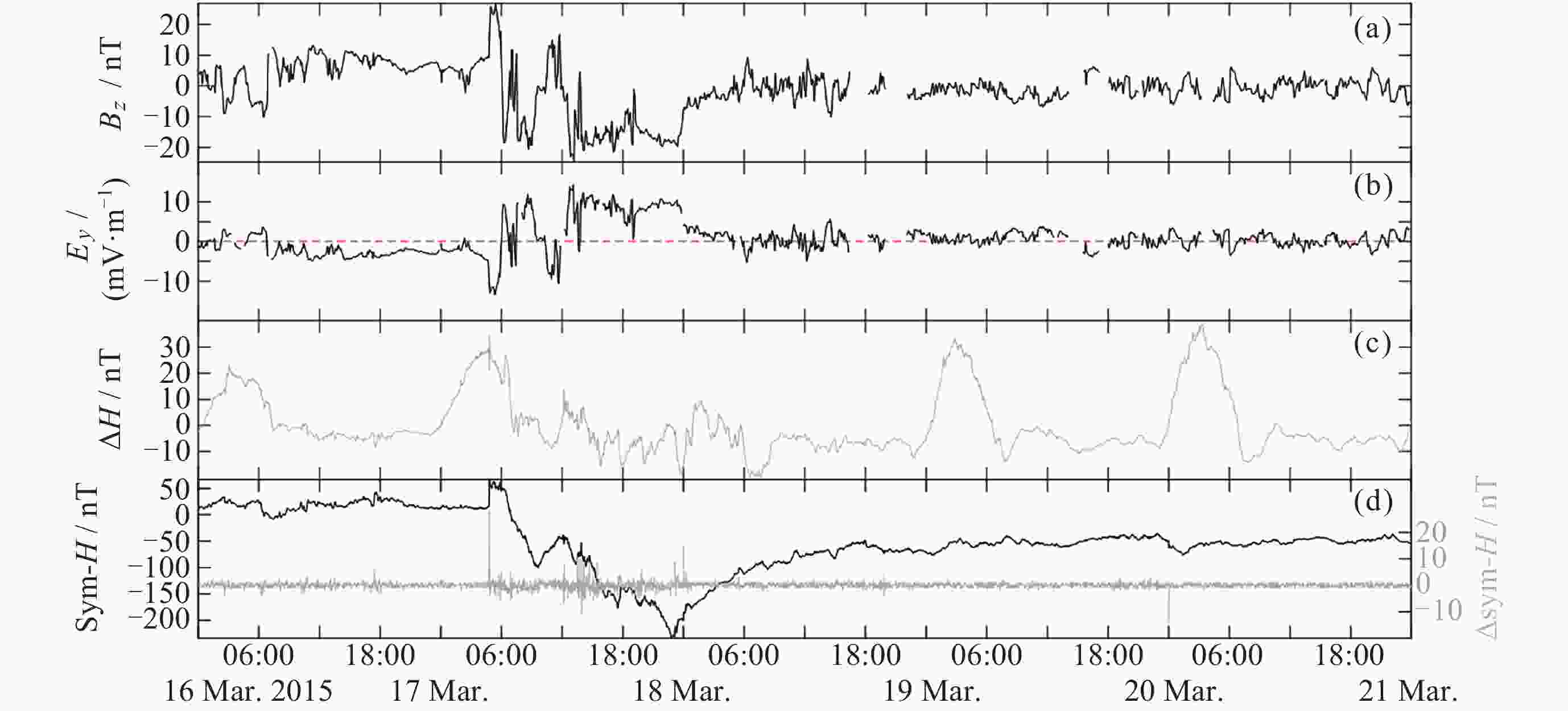 图 2 2015年3月16-20日行星际磁场/电场参量和地磁参量的变化情况. (a)行星际磁场Bz分量, 北向为正方向; (b)由太阳风速和行星际磁场Bz分量计算得到的行星际电场Ey; (c)地磁ΔH由Dalat和PHU Thuy地磁台站的地磁水平分量计算得到; (d) sym-H即1 min分辨率的地磁Dst指数数据