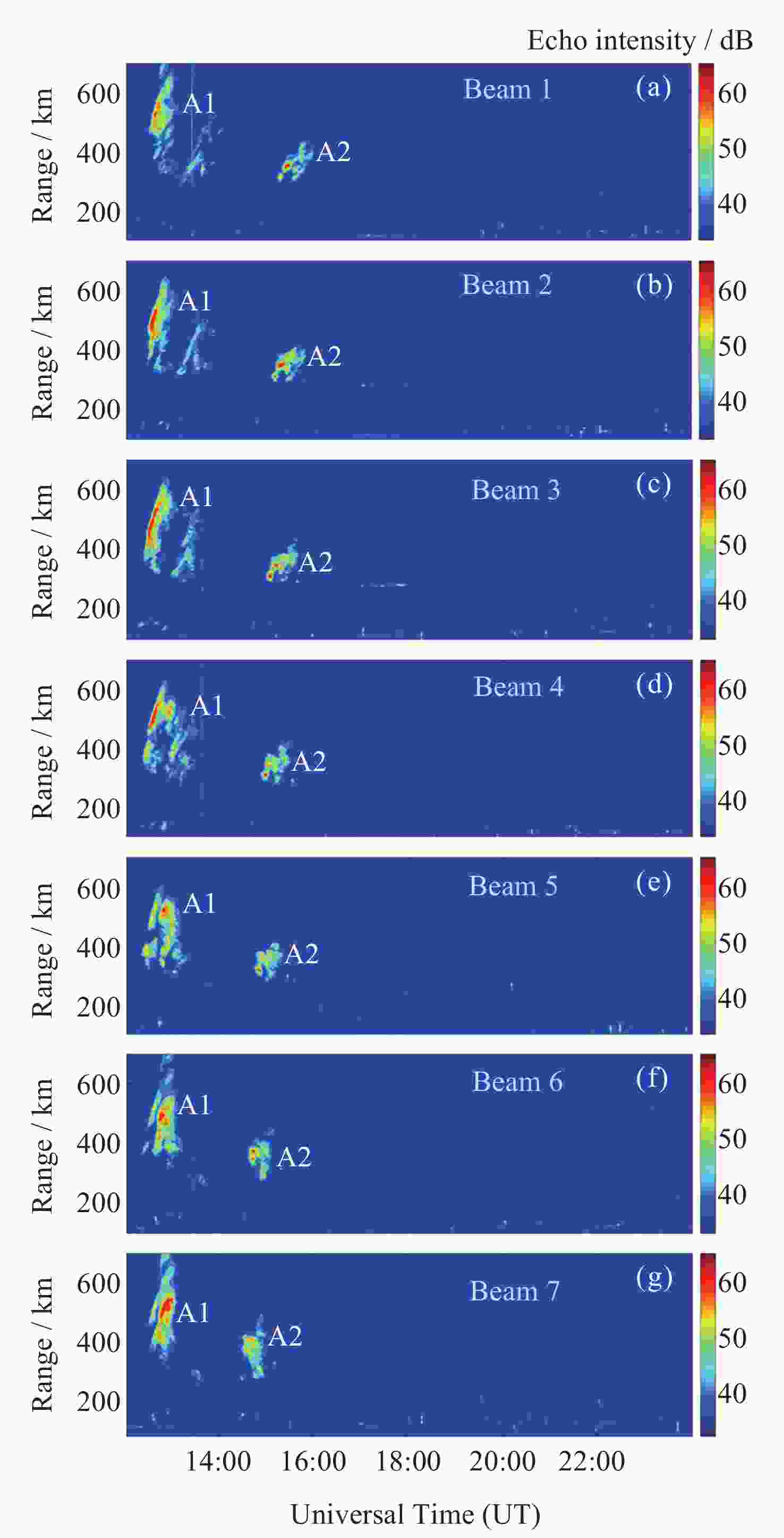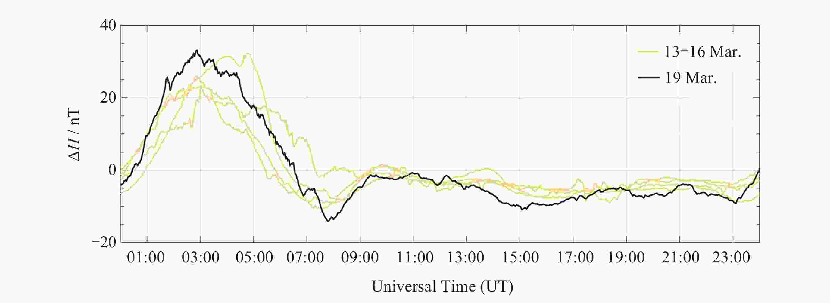 摘要: 利用子午工程富克站(19.5°N, 109.1°E) 630 nm气辉成像仪、电离层测高仪、VHF雷达回波强度数据和Dalat地磁台站(11.9°N, 108.5°E; GL:2.5°)、PHU Thuy地磁台站(21.0°N, 105.9°E; GL:11.5°)地磁水平分量数据及ACE卫星的行星际磁场、太阳风速度观测数据, 针对2015年3月特大磁暴期间海南上空电离层等离子体泡进行了研究. 结果显示, 磁暴前后均观测到午夜前等离子体泡和日落后电离层底部虚高的抬升现象; 磁暴期间电离层底部虚高抬升受到明显抑制, 富克站未观测到等离子体泡. 对行星际电/磁场及地磁水平分量的变化情况的分析表明, 磁暴期间电离层翻转前增强(Pre-Reversal Enhancement, PRE)电场可能先后被西极性过屏蔽穿透电场和扰动发电机电场抑制, 导致瑞利–泰勒不稳定性降低, 不利于等离子体泡/电离层不规则体结构的发育.Abstract: This study utilizes the optical observation data from the 630 nm all-sky airglow imager, the data from the ionospheric digital ionosonde, and the data of the echo intensity of the Very High Frequency (VHF) coherent scatter radar at the Fuke Station in Hainan of the Meridian Project (19.5°N, 109.1°E). In combination with the geomagnetic horizontal component data from the Dalat Geomagnetic Station (11.9°N, 108.5°E; GL:2.5°) and the PHU Thuy Geomagnetic Station (21.0°N, 105.9°E; GL:11.5°), as well as the observations of the interplanetary magnetic field and solar wind speed from the ACE satellite, the study is carried out on the variations of the ionospheric plasma bubbles/irregularity structures over Hainan during the super geomagnetic storm in March 2015. The results show that the appearance of pre-midnight plasma bubbles and the uplift of the virtual height at the bottom of the ionosphere after sunset were observed both before and after the geomagnetic storm. However, the plasma bubbles observed after the end of the geomagnetic storm were of a fossil structure, which may be due to the fact that the ionospheric electric field during the occurrence period of the plasma bubbles on that day showed a westward polarity, which was not conducive to the development of the plasma bubbles. The uplift of the virtual height at the bottom of the ionosphere during the geomagnetic storm was significantly suppressed, and no plasma bubbles were observed at the Fuke station. The analysis of the variations of the interplanetary electric/magnetic field and the geomagnetic horizontal component shows that the Pre-Reversal Enhancement (PRE) electric field before the ionospheric reversal during the geomagnetic storm may have been successively suppressed by the over-shielding penetrating electric field with a westward polarity and the Disturbance Dynamo Electric Field (DDEF), resulting in a decrease in the Rayleigh-Taylor instability, which is not conducive to the development of the plasma bubble/ionospheric irregularity structures.