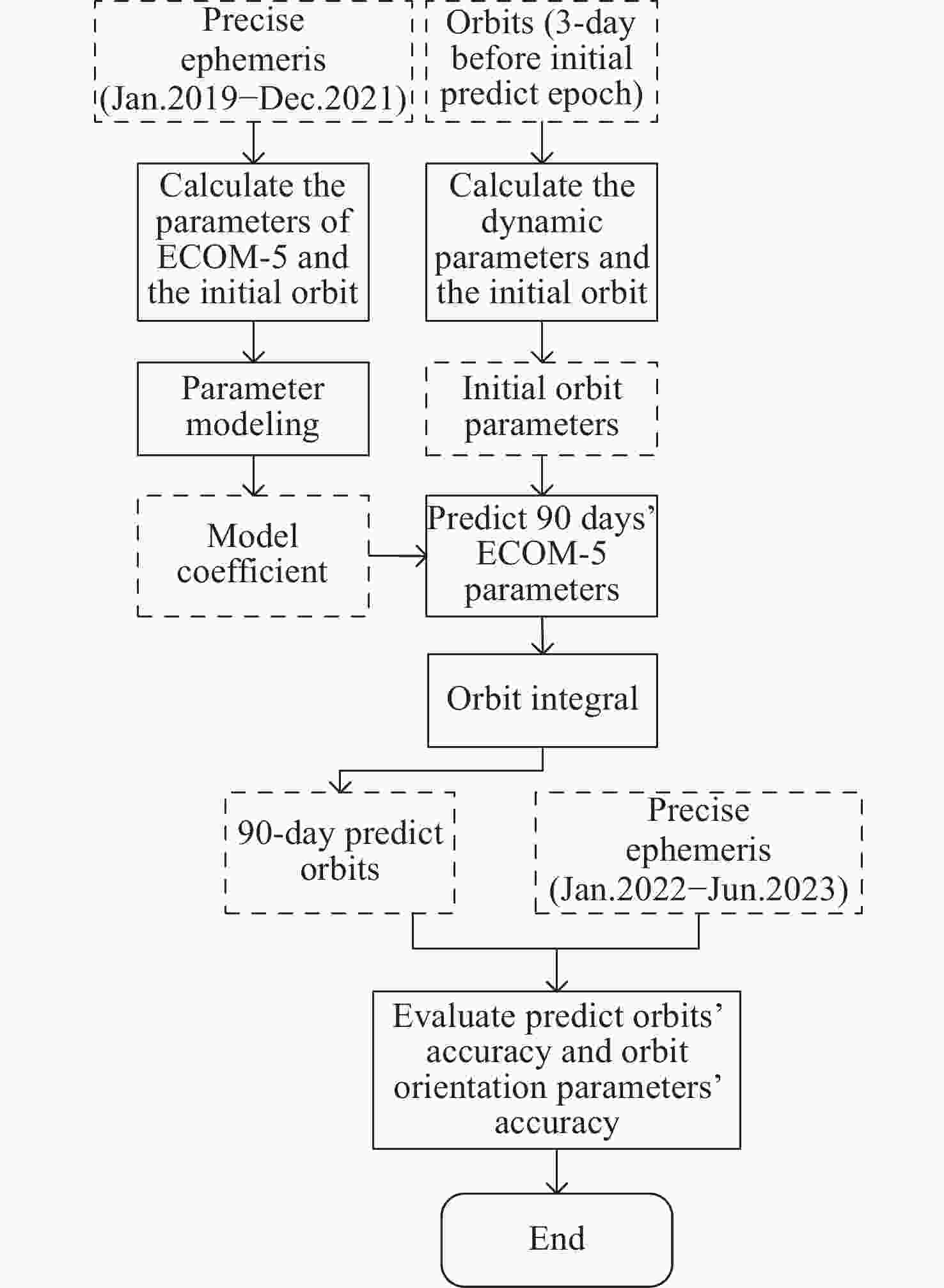 Abstract: Long-term orbit prediction serves as an effective method to suppress the overall rotation of the inertial frame in autonomous navigation of satellite navigation systems, and the main factor influencing the accuracy of long-term orbit prediction is the uncertainty associated with the solar radiation pressure perturbation model. This paper proposes a method of modeling and updating the ECOM-5 solar radiation pressure model parameters for long-term orbit prediction, and evaluates its performance by fully utilizing the correlation between the solar radiation pressure coefficient and the solar altitude angle. Taking 24 Medium Earth Orbit (MEO) satellites and 2 Inclined Geosynchronous Orbit (IGSO) satellites of the Beidou-3 Global Navigation Satellite System (BDS-3) as examples, 18 groups of 90-day orbits were predicted from 1 January 2022 to 1 June 2023. Then the precise ephemeris of the Center for Orbit Determination in Europe (CODE) was used as the reference orbit to evaluate the performance of long-term orbit prediction. The experimental results indicate that when adopting the new orbit prediction method proposed in this paper for 90-day orbit prediction of navigation satellites, for MEO satellites, the average Root Mean Square (RMS) of the three-dimensional position error on the 30th, 60th, and 90th day is approximately 180, 650, 1400 m, respectively, and that of the average URE RMS of the orbit is 18.79, 61.43, 124.00 m, respectively. The RMS mean values of the orbital inclination angle error $\Delta i $ are 6.07, 9.76, 12.38 mas, respectively, and those of the right ascension of the ascending node error $\Delta \varOmega $ are 6.47, 11.24, 14.88 mas, respectively. For IGSO satellites, the average RMS of the three-dimensional position error on the 30th, 60th, and 90th day is approximately 260, 1000, 2200 m, respectively, while the prediction errors of i and Ω are comparable to those of MEO satellites. Therefore, it can be concluded that the method in this paper exhibits high accuracy in long-term orbital predicting positions and orbital orientation parameters i and Ω, which is expected to provide essential support for mitigating the overall rotation of autonomous navigation of navigation satellite constellations. -