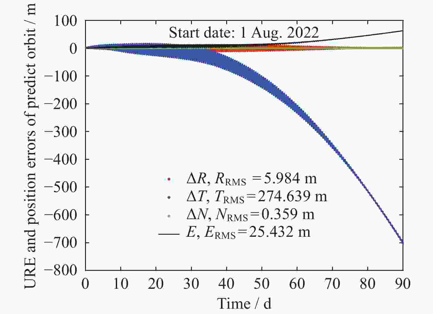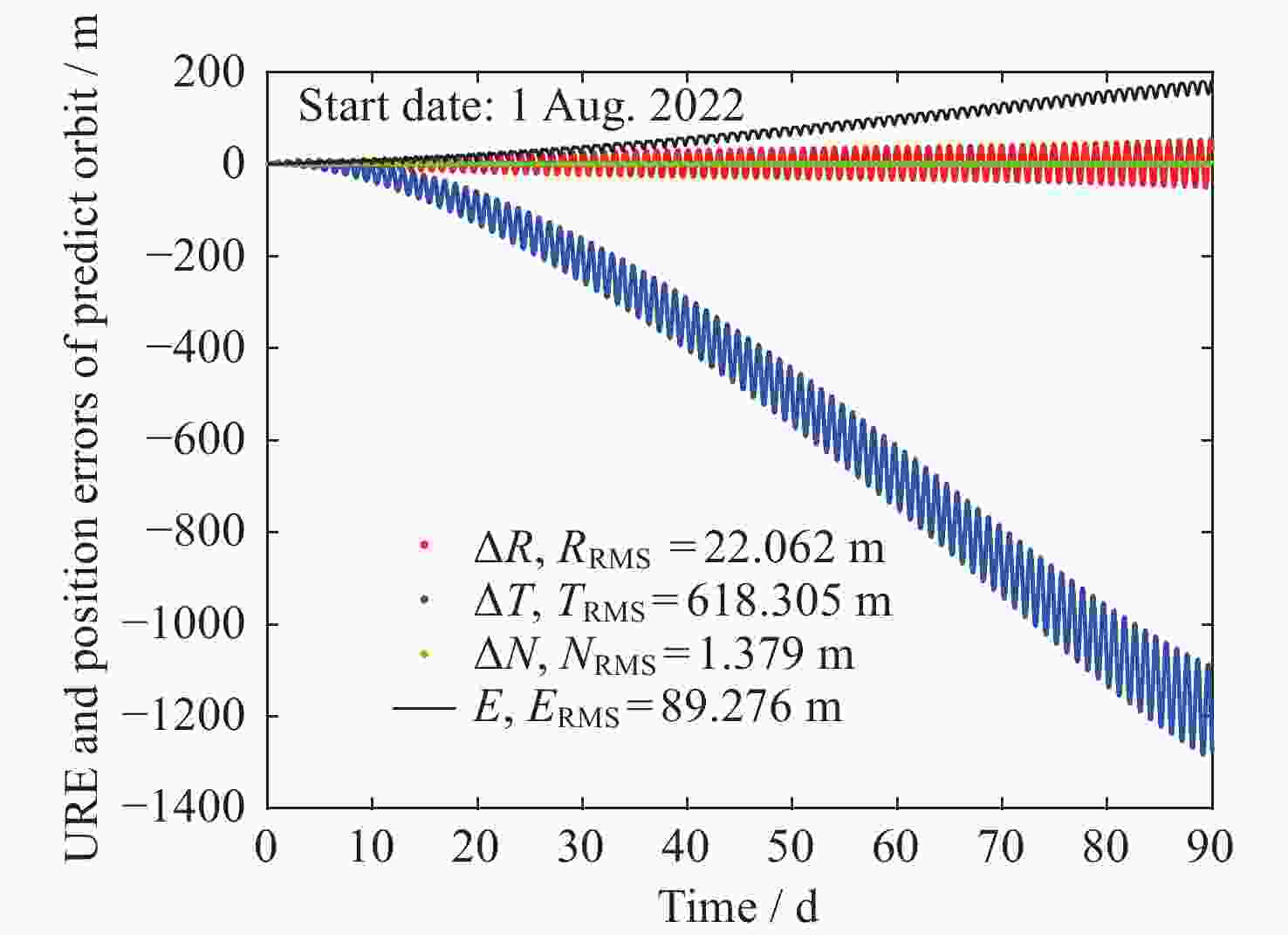 Table 4. Position error RMS statistics on the 90th day of Beidou navigation satellites’ long-term orbit prediction (Unit: m)