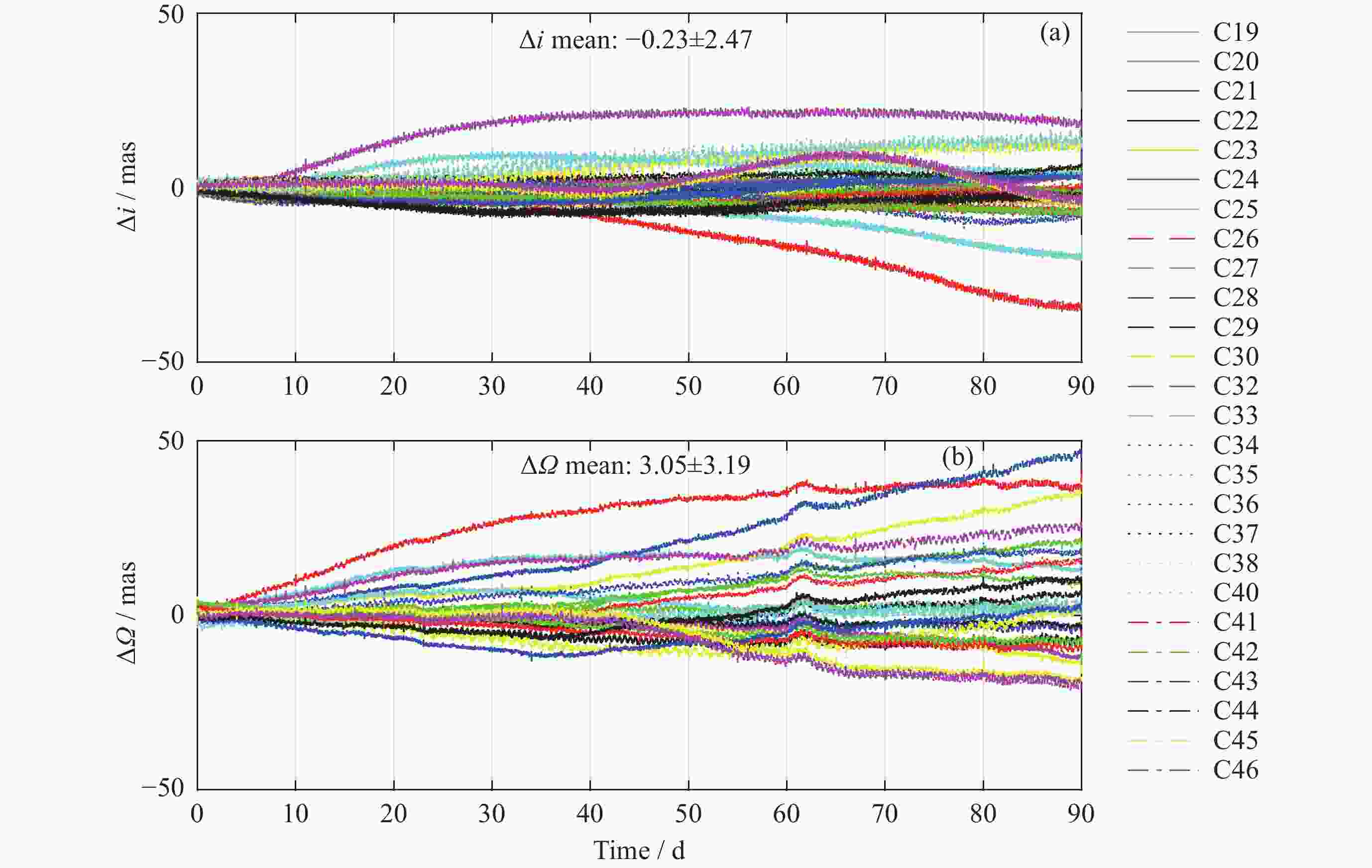 Table 5. RMS error statistics of $ \Delta i $ and $ \Delta \varOmega $ of Beidou navigation satellites’ long-term orbit prediction (Unit: mas)