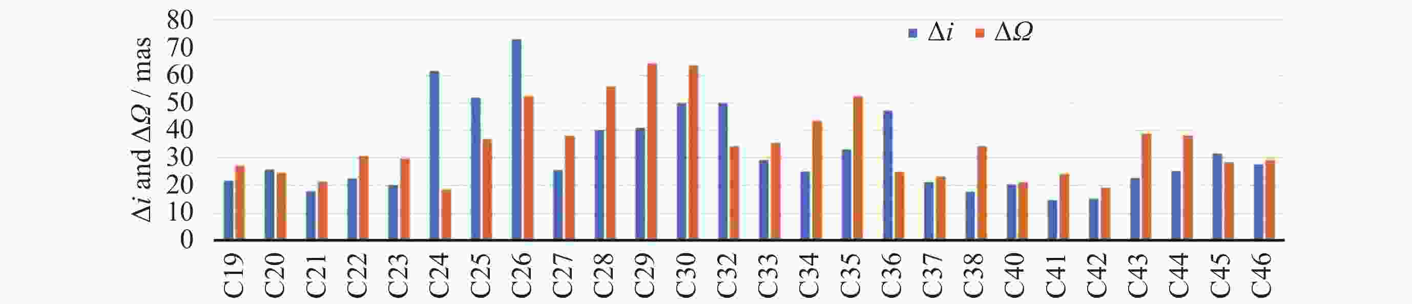 卫星类型 卫星PRN 第30天 第60天 第90天 $\Delta i $ $\Delta \varOmega $ $\Delta i $ $\Delta \varOmega $ $\Delta i $ $\Delta \varOmega $ MEO C19 4.015 3.500 7.800 6.361 11.127 9.406 C20 4.180 3.816 7.816 6.648 10.997 8.918 C21 3.378 3.298 6.643 5.768 9.702 8.102 C22 4.075 4.316 7.878 7.634 11.190 11.189 C23 3.246 3.828 6.000 5.777 8.862 7.542 C24 5.768 2.485 11.657 4.070 16.933 6.731 C25 9.702 5.329 15.660 10.339 18.084 13.890 C26 15.738 8.500 24.628 17.046 28.039 24.269 C27 4.637 8.386 7.406 14.897 9.037 19.067 C28 7.701 13.155 12.823 25.217 16.765 34.095 C29 5.825 9.492 10.067 17.414 11.930 24.471 C30 8.263 12.913 14.239 24.085 16.808 32.909 C32 9.791 7.585 14.600 10.627 17.829 11.424 C33 6.811 7.707 9.123 10.453 11.404 14.507 C34 3.475 7.636 6.430 12.758 7.649 17.432 C35 4.036 8.515 5.524 16.232 5.483 22.789 C36 9.593 6.066 16.071 10.211 18.738 11.750 C37 2.484 3.785 5.240 6.559 8.096 8.847 C41 3.013 4.461 5.347 8.529 7.642 11.939 C42 2.904 3.948 5.517 7.726 7.963 11.358 C43 4.696 6.940 7.353 11.079 8.832 11.568 C44 5.183 7.778 8.706 12.147 10.628 14.210 C45 7.313 5.425 7.160 8.610 9.951 9.635 C46 7.565 5.080 7.544 7.626 10.144 9.027 均值 6.070 6.467 9.761 11.236 12.384 14.878 IGSO C38 4.164 4.401 7.227 8.640 8.125 10.240 C40 5.937 4.815 8.117 9.307 9.655 12.165 均值 5.050 4.608 7.672 8.974 8.890 11.202 -