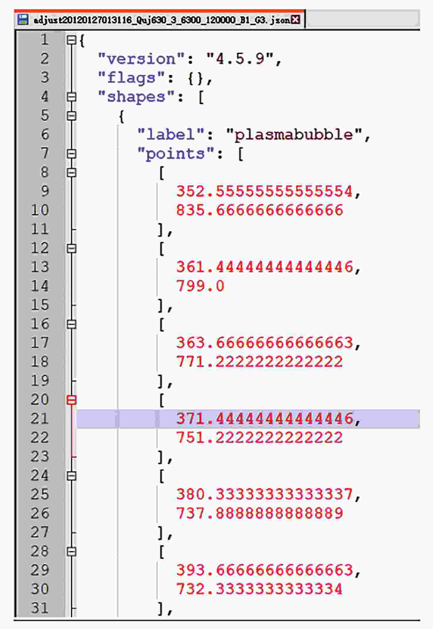摘要: 气辉成像观测凭借其高时空分辨率及大范围连续监测能力, 为研究电离层赤道等离子体泡的水平精细结构及其演化特征提供了重要手段. 然而, 当前缺乏高质量、专业标注的等离子体泡数据集, 严重制约了监督式人工智能算法在该领域的应用研究. 为此, 研究构建了首个基于气辉观测的电离层等离子体泡标准数据集, 包含等离子体泡事件数据与精确轮廓标注数据. 该数据集源自云南曲靖站630 nm波段气辉成像仪历时一个完整太阳活动周(2012-2022年)的连续观测, 所有原始数据均经过图像增强、方位校正、几何畸变校正及地理坐标投影等标准化预处理, 并由专家团队完成等离子体泡事件识别及轮廓标注. 该数据集的时间分辨率高达3 min, 系统收录了不同太阳活动强度下的等离子体泡事件样本, 涵盖I型与Y型等多种典型形态. 本数据集为开发高精度监督式人工智能算法提供了高质量基准数据, 有助于促进基于气辉成像的电离层等离子体泡自动化检测与形态演化研究.Abstract: Airglow imaging observations, with their high spatiotemporal resolution and large-scale continuous monitoring capability, provide a crucial approach to studying the fine horizontal structures and evolutionary characteristics of ionospheric equatorial plasma bubbles. However, the current lack of high-quality, professionally annotated plasma bubble datasets severely restricts the application of supervised Artificial Intelligence (AI) algorithms in this field. To address this issue, this study constructs the first standardized dataset of ionospheric plasma bubbles based on airglow observations, including plasma bubble event data products and precise contour annotation data products. The dataset is derived from continuous observations over a full solar activity cycle (2012–2022) by a 630 nm band airglow imager at the Qujing Station in Yunnan, China. All raw data underwent standardized preprocessing, including image enhancement, azimuth correction, geometric distortion correction, and geographic coordinate projection. Expert teams then performed plasma bubble event identification and contour annotation. With a high temporal resolution of 3 minutes, the dataset systematically documents plasma bubble events under varying solar activity intensities, covering multiple typical morphologies such as “shaped”I- and “Y-shaped” structures. This dataset provides high-quality benchmark data for developing high-precision supervised AI algorithms, facilitating automated detection and morphological evolution research of ionospheric plasma bubbles based on airglow imaging.