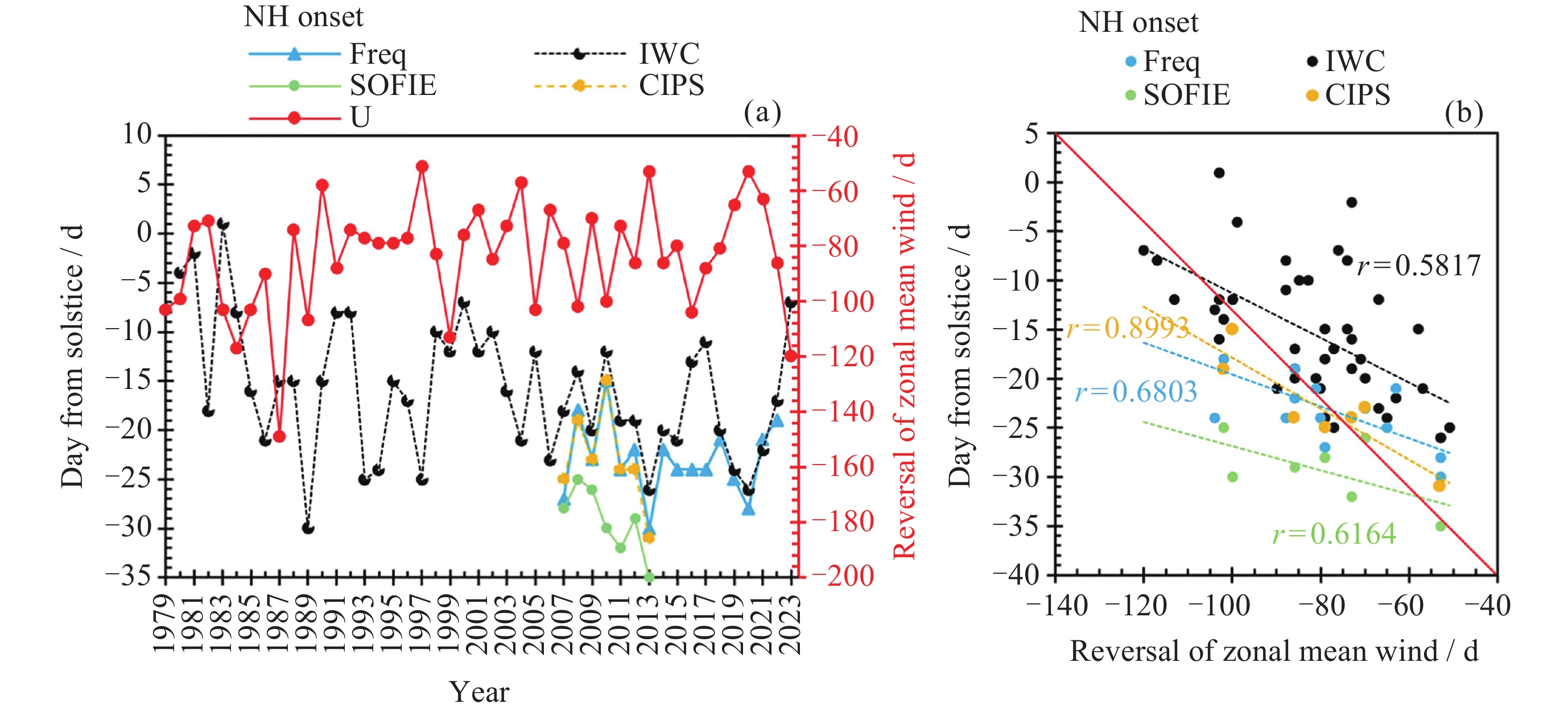 图  3  1979-2023年北半球夜光云季起始时间与纬向平均风的相关性. (a) 季节起始时间与纬向平均风反转时间的年际变化, (b) 表示季节起始时间与纬向平均风反转时间的相关性