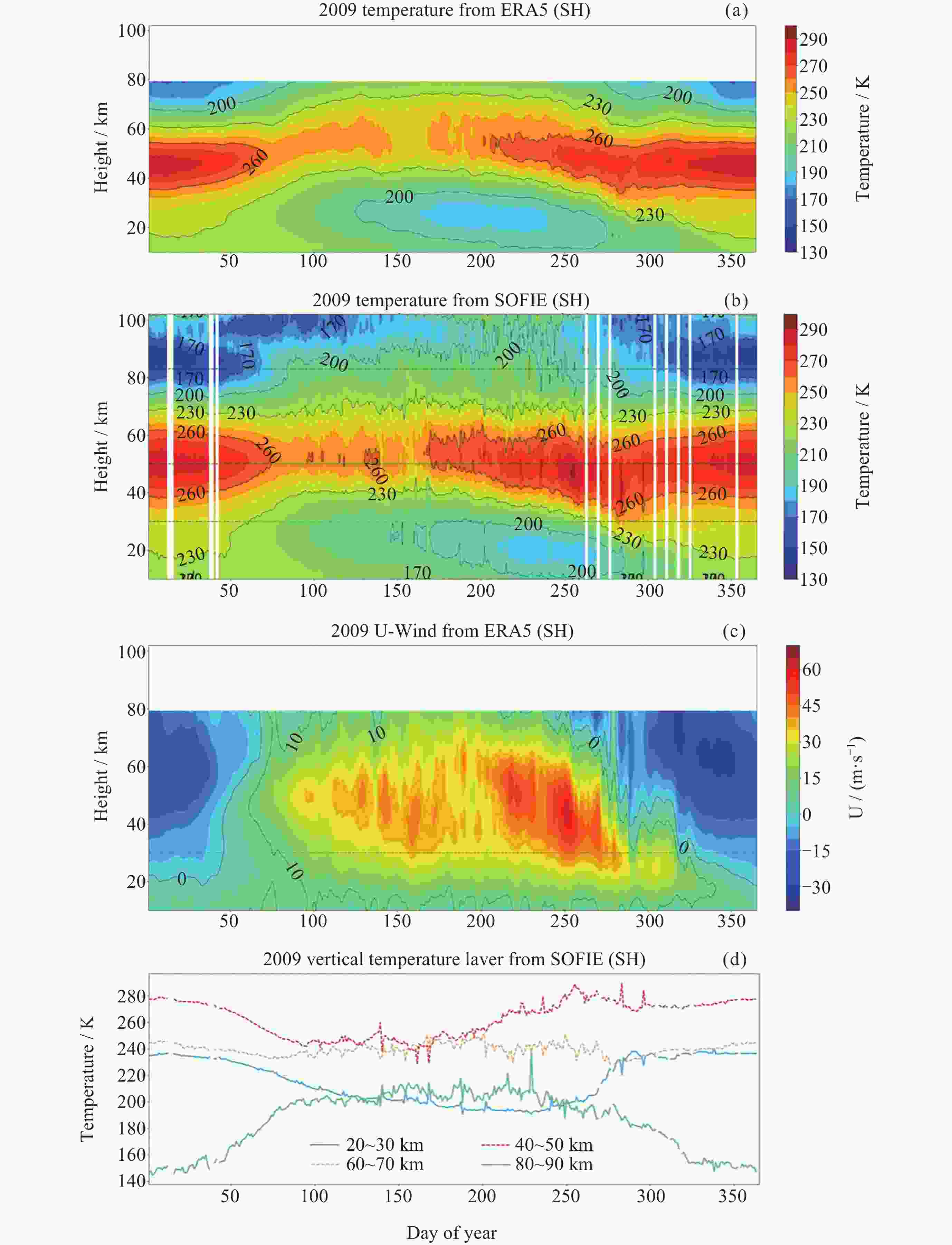 图  4  2009年南半球的温度与纬向平均风的时空分布. (a) 60°S-90°S纬度范围的ERA5平均温度场; (b) SOFIE每日平均温度数据, 纬度覆盖范围为64°S-82°S, ERA5与SOFIE二者可相互验证温度数据的可用性; (c) 60°S-90°S纬度范围的ERA5纬向平均风场; (d) SOFIE四个不同垂直高度层的温度廓线